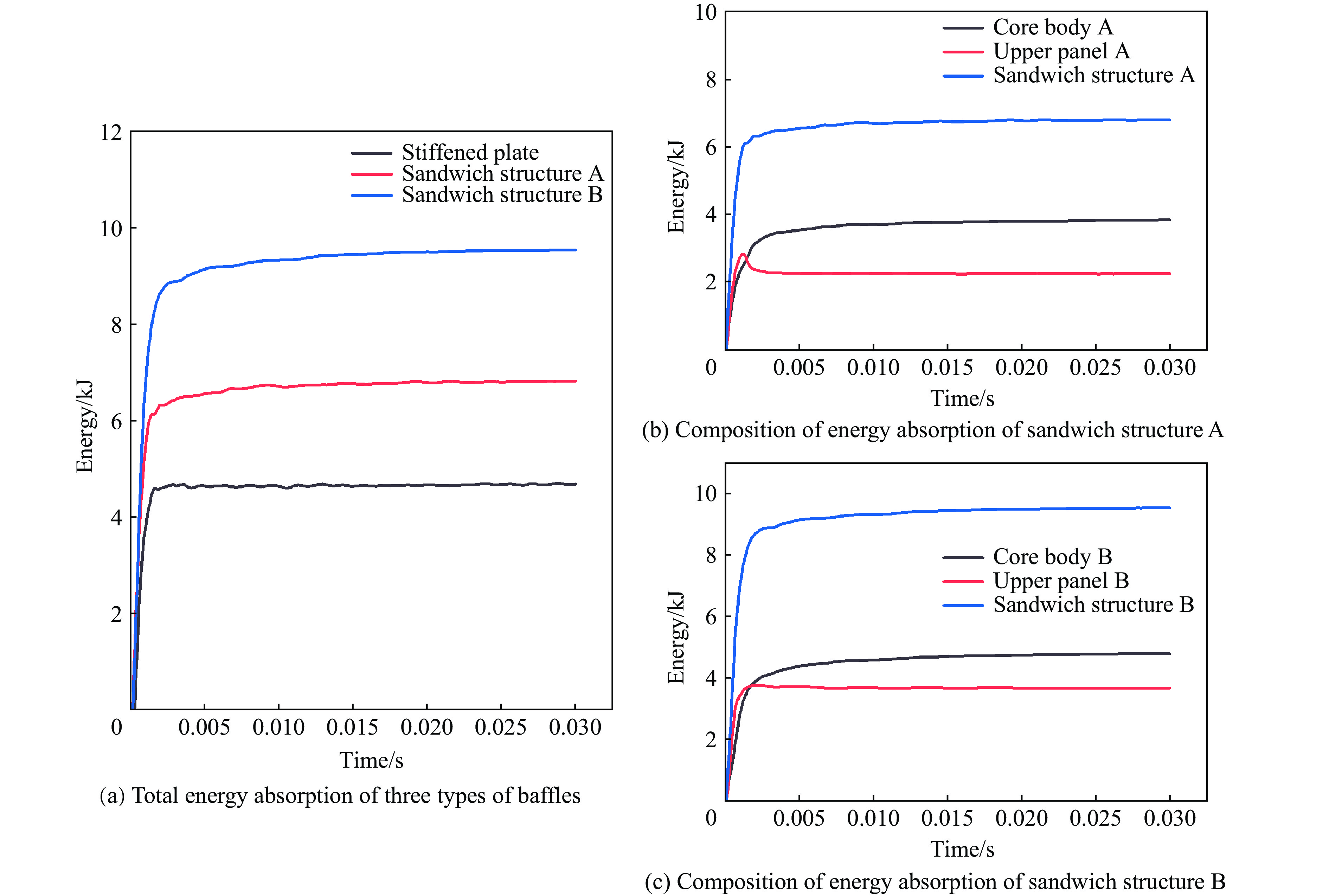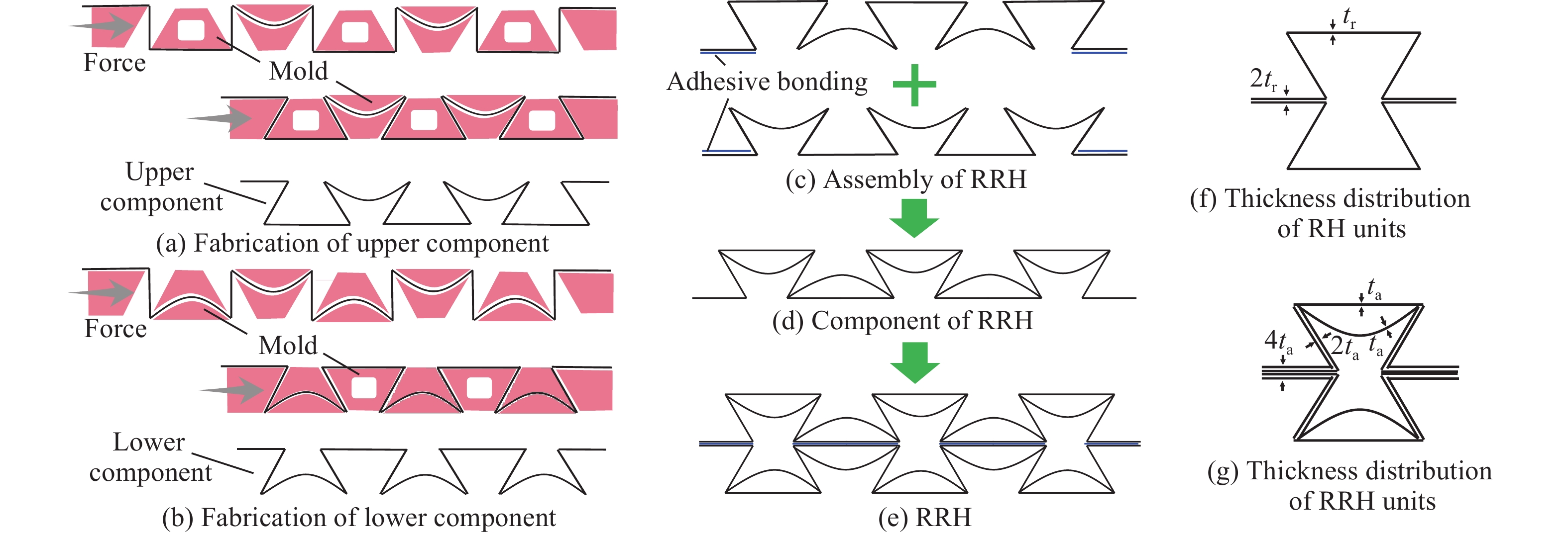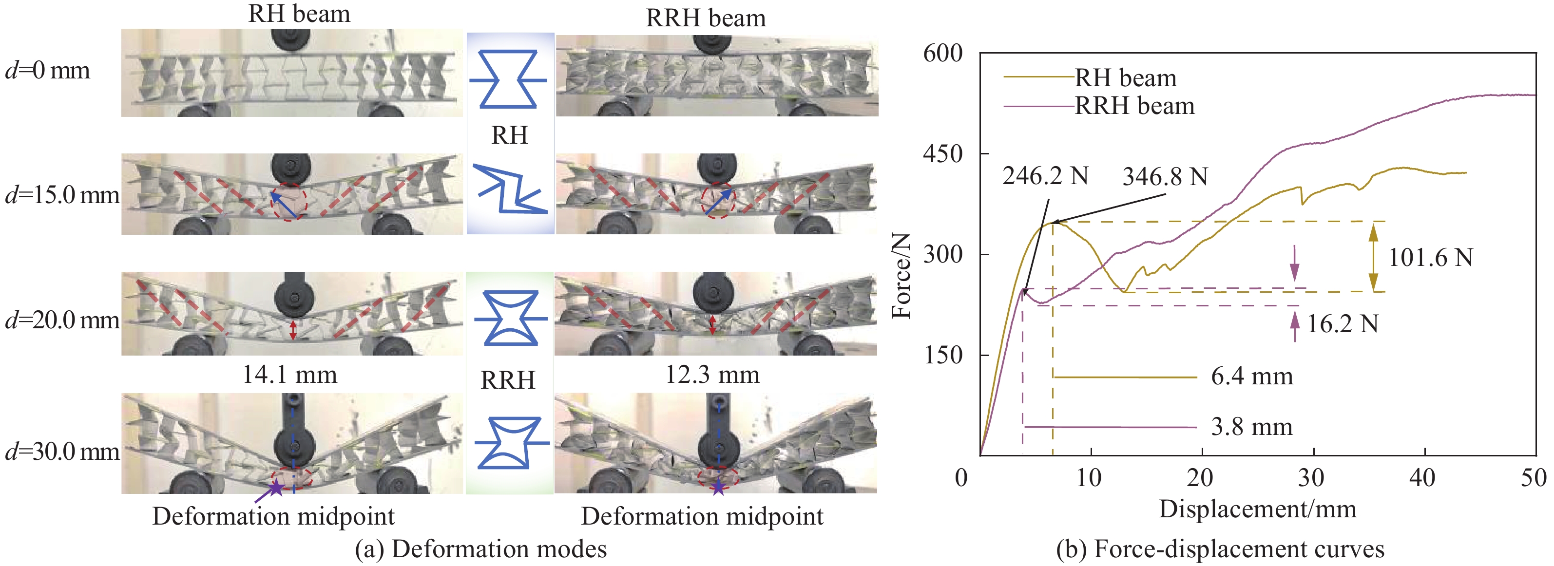 内凹蜂窝的悬链线增强方法通过同步改善中空结构提升承载、增强负泊松比效应、改善变形模式、利用悬链线结构高承载实现耐撞性的显著提升,在此基础上提出增强内凹蜂窝夹层梁。采用“冲压+粘接”方法分别制造传统、增强内凹蜂窝夹层梁金属样件开展三点弯曲实验,结果显示:悬链线结构通过抑制传统内凹蜂窝侧胞壁绕节点的旋转变形将其初始塑性变形后承载力的下降比例由29.3%减小至6.6%。相较于传统内凹蜂窝夹层梁,等相对密度增强内凹蜂窝夹层梁的最大承载力、能量吸收分别提高26.7%、8.9%。开展参数化研究确定面板、芯层壁厚对夹层梁三点弯曲力学行为均具有显著影响。基于参数化研究结果开展以面板、芯层壁厚为变量的夹层梁抗冲击性能多目标优化,相较于夹层梁初始结构,优化后夹层梁最大承载力和能量吸收分别提高64.9%和46.9%。与面内、面外传统蜂窝夹层梁分别进行等壁厚、等质量下的抗冲击性能对比,证明提出增强内凹蜂窝夹层梁更优异的吸能防护性能。研究结果可为传统蜂窝夹层结构的强化设计提供有益指导。