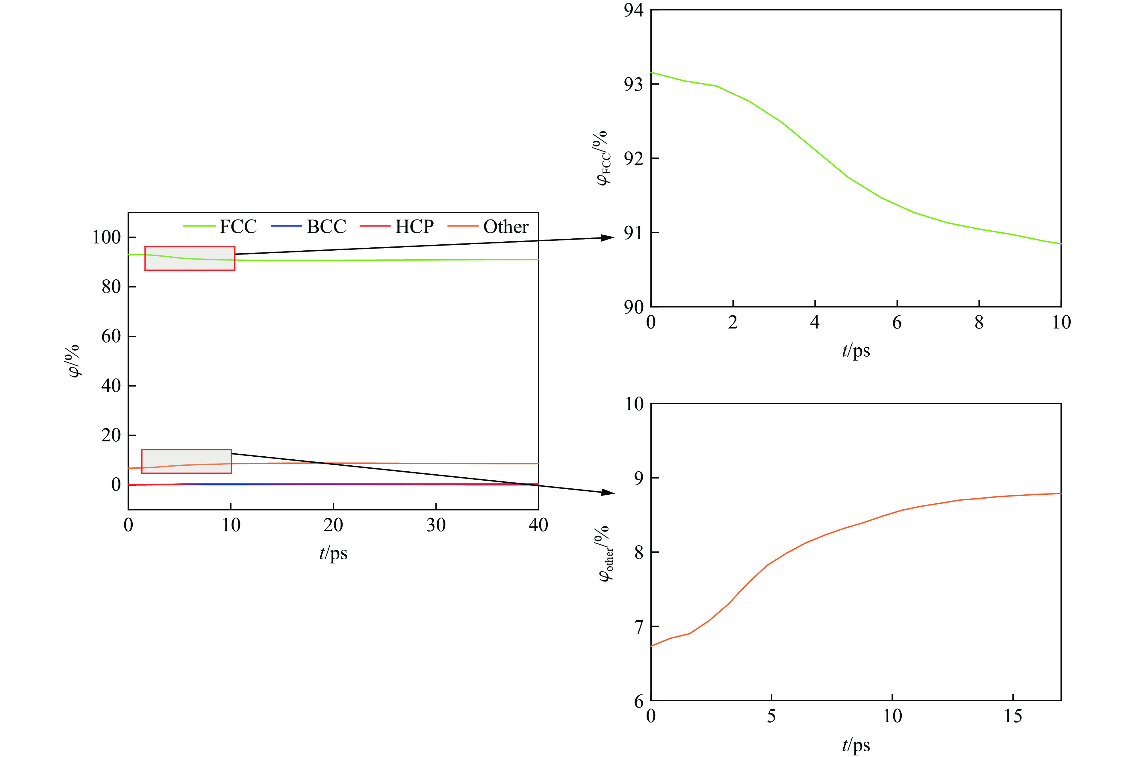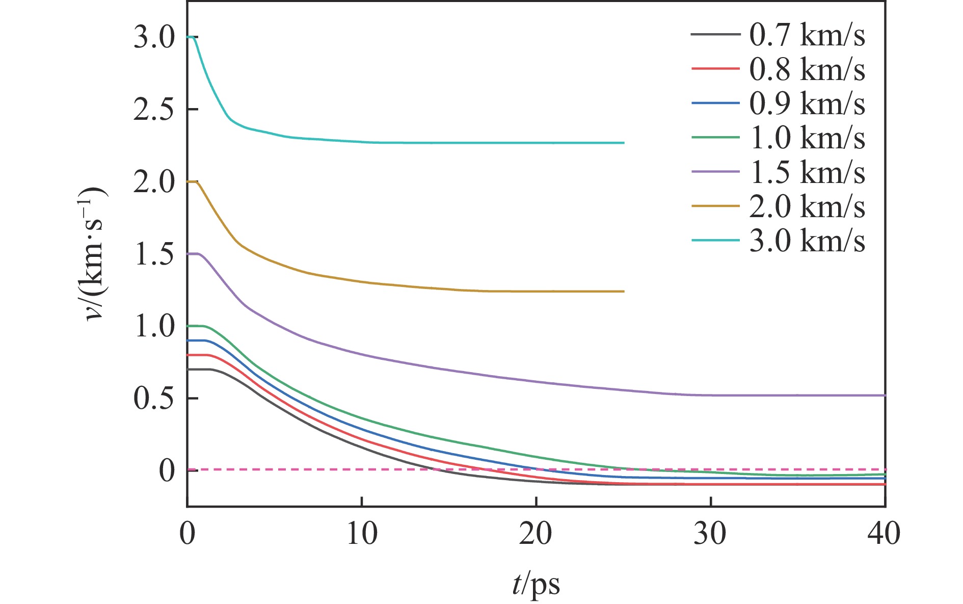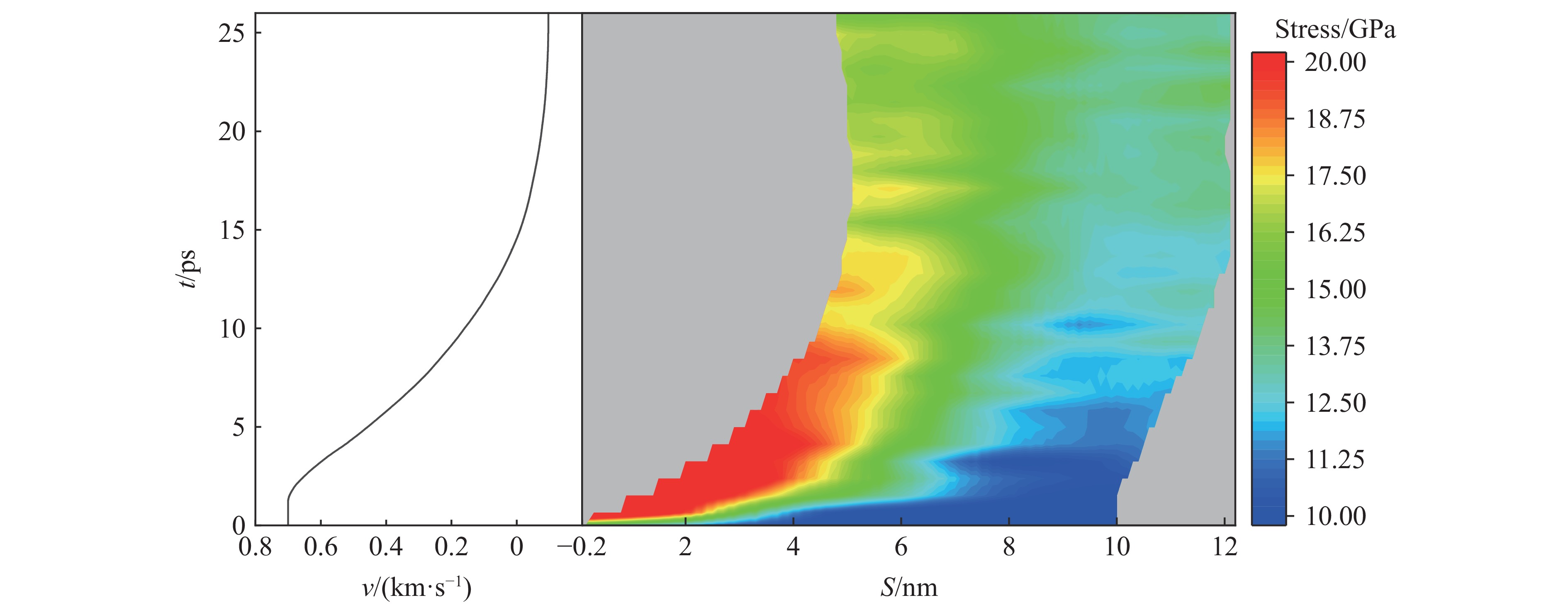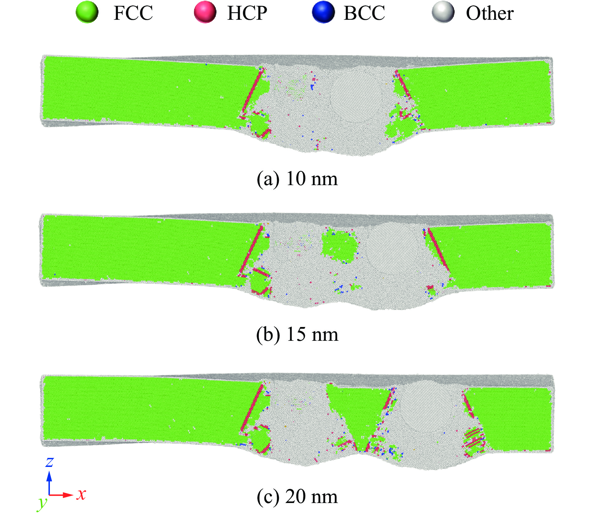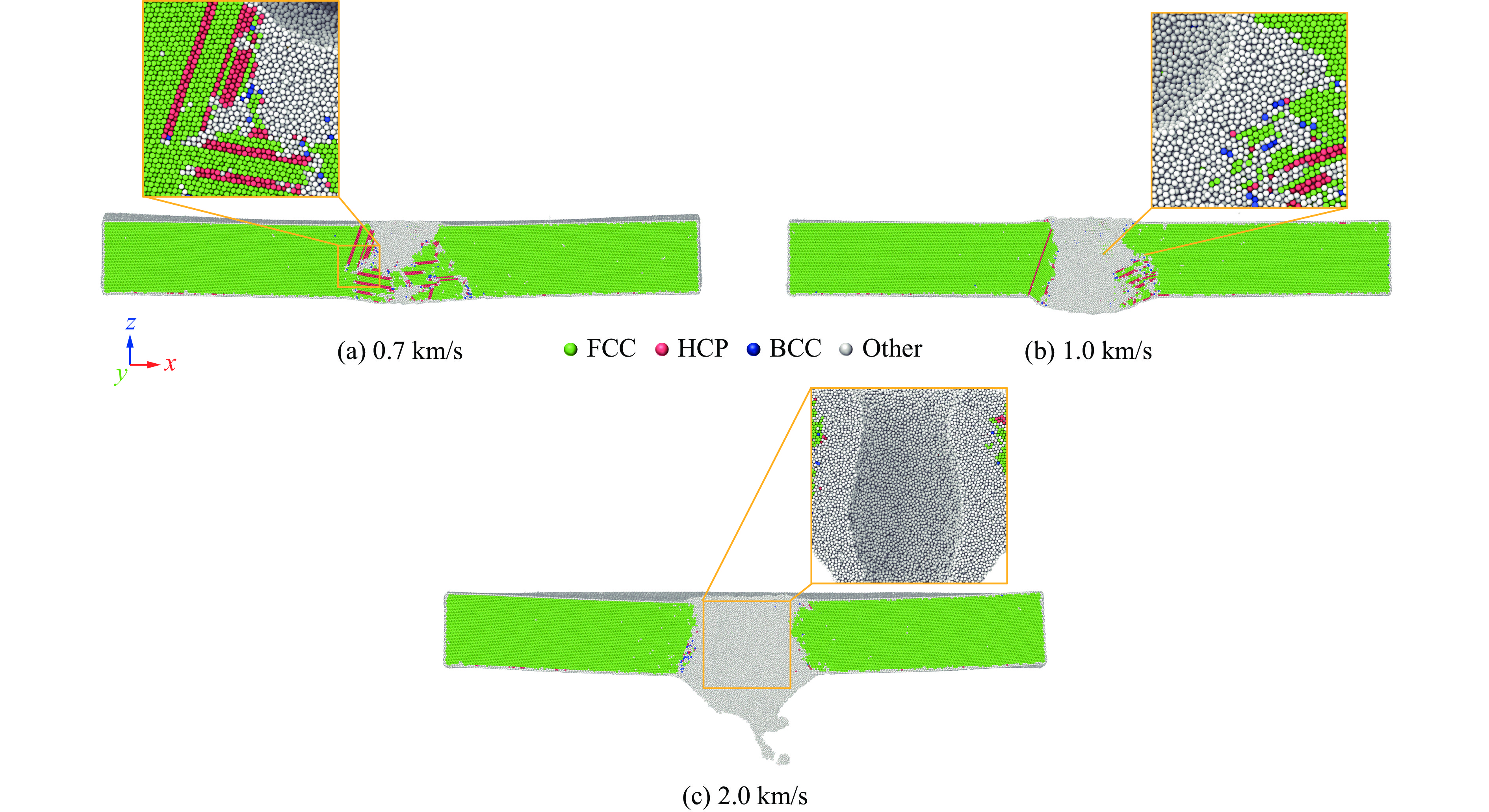 为了揭示高熵合金(high-entropy alloy, HEA)在冲击载荷下的相结构演变、位错分布、能量吸收及冲击累积效应的变化规律,通过分子动力学模拟,系统探讨了Al0.3CoCrFeNi 高熵合金板在受单次及二次冲击载荷下的动态响应行为。结果显示,首次冲击下,Al0.3CoCrFeNi高熵合金板的塑性区域相结构演变和能量吸收方式具有显著的冲击速度依赖性。随着冲击速度的提高,面心立方相结构的比例呈现三阶段下降趋势,而无序化结构则相应增加。在低速(0.5~1.0 km/s)冲击下,能量主要通过位错网络进行吸收;在中速(1.0~2.0 km/s)冲击下,位错与无序化原子共同吸收能量;在高速(2.0~3.0 km/s)冲击下,无序化原子主导吸收能量。位错线长度在刚性球0.5~0.8 km/s的冲击速度范围内,随冲击速度的提高呈线性增大,而在更高的速度冲击下,因HEA板厚度限制,位错线长度呈下降趋势。应力分析表明,冲击速度提高时,最大应力与塑性区域边界应力随着冲击速度的提高表现出非线性变化的二次函数关系。二次冲击下,几何特征方面,Al0.3CoCrFeNi 高熵合金板在冲击后形成类梯形的破坏区域,其上坑半径随冲击速度的变化呈现二次函数关系,二次冲击的最小影响区域也与冲击速度呈现二次函数关系;抗冲击性能方面,随着刚性球首次冲击速度的提高,其二次冲击后的剩余速度也随之上升,HEA板材料抵抗冲击性能降低。在距冲击中心10 nm处,HEA板的弹道极限随首次冲击速度的提高而非线性减小,然而,二次冲击速度的提高会使首次冲击的影响减弱。