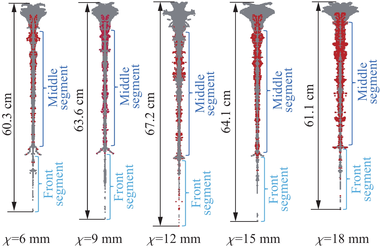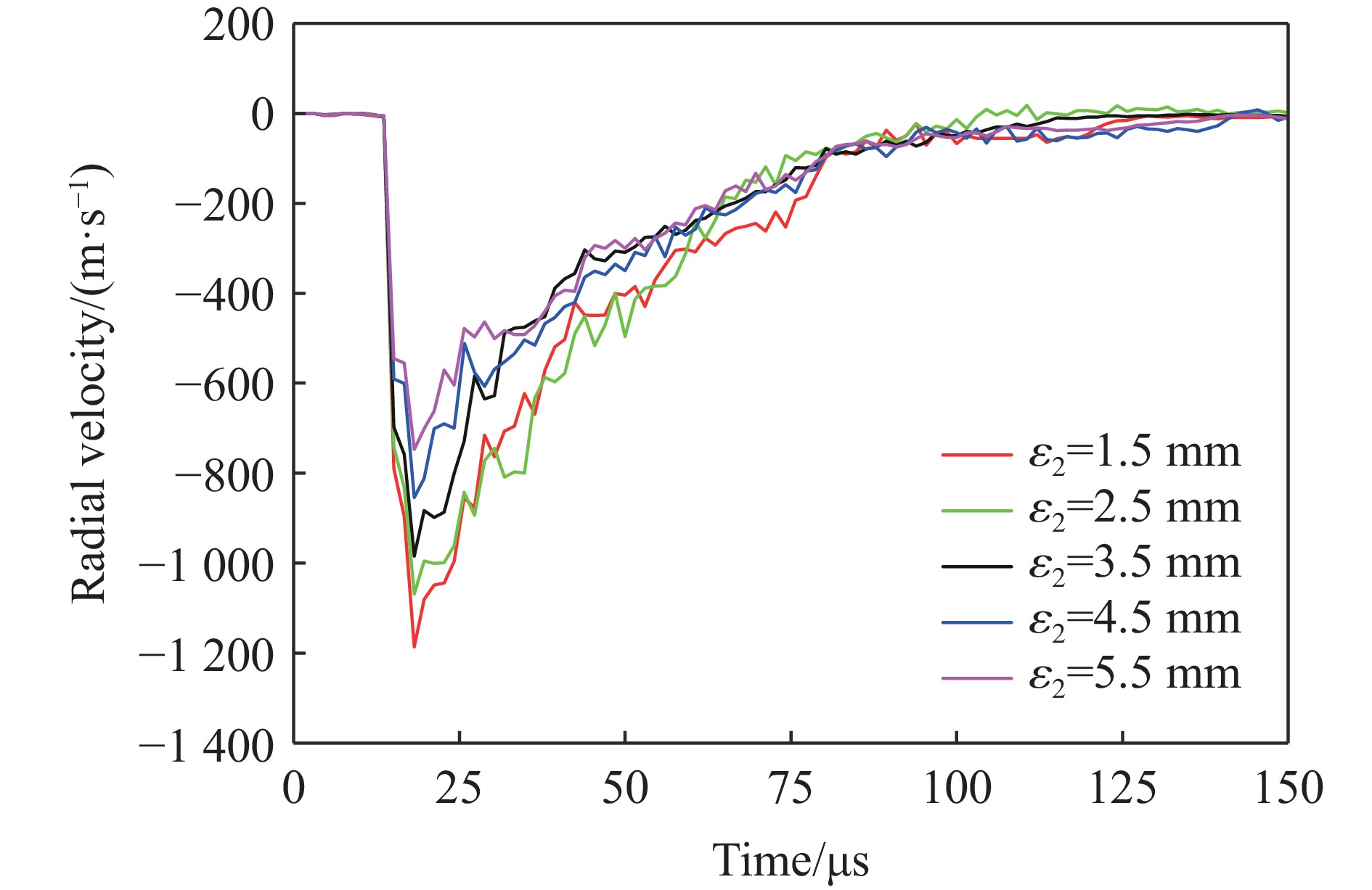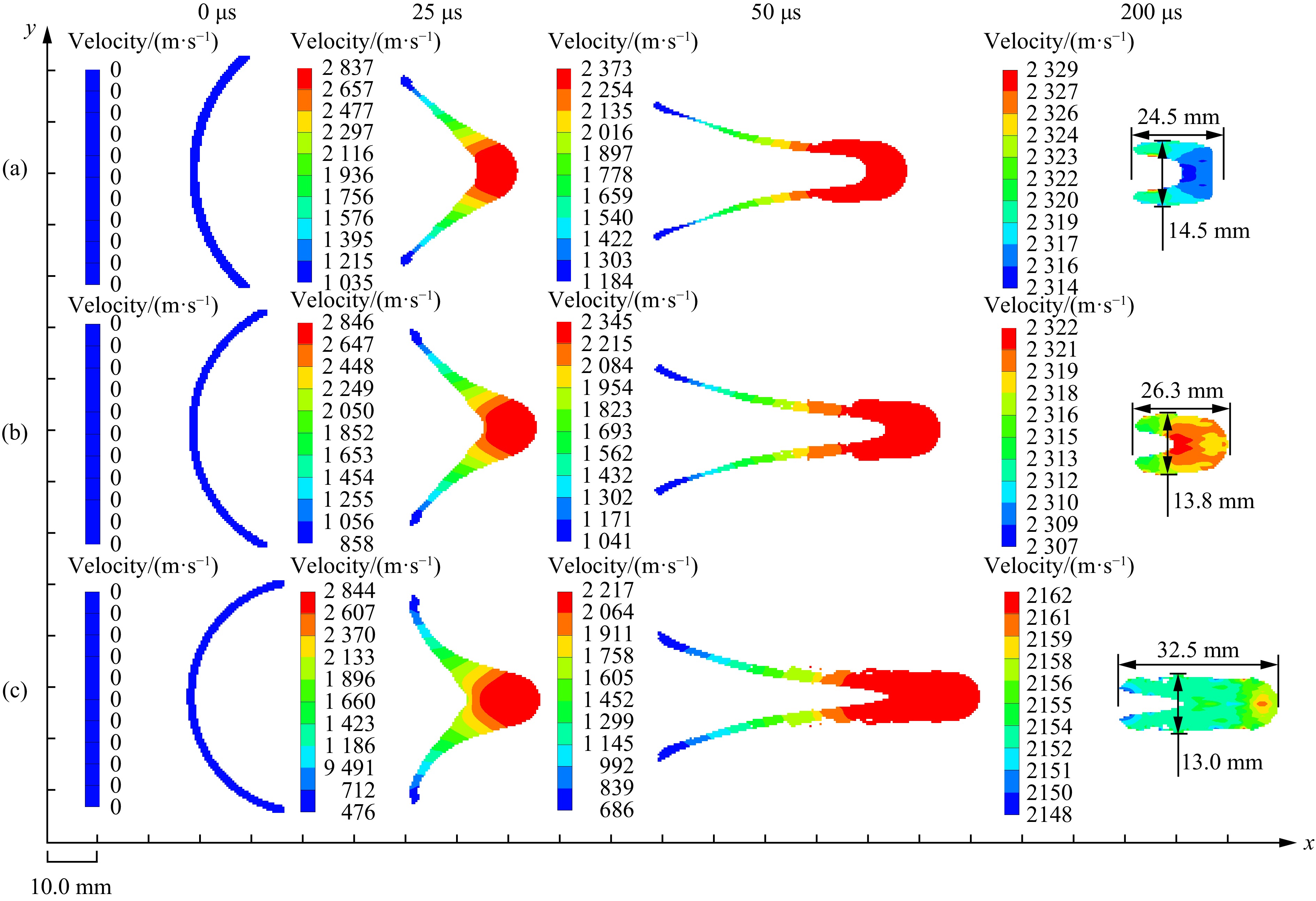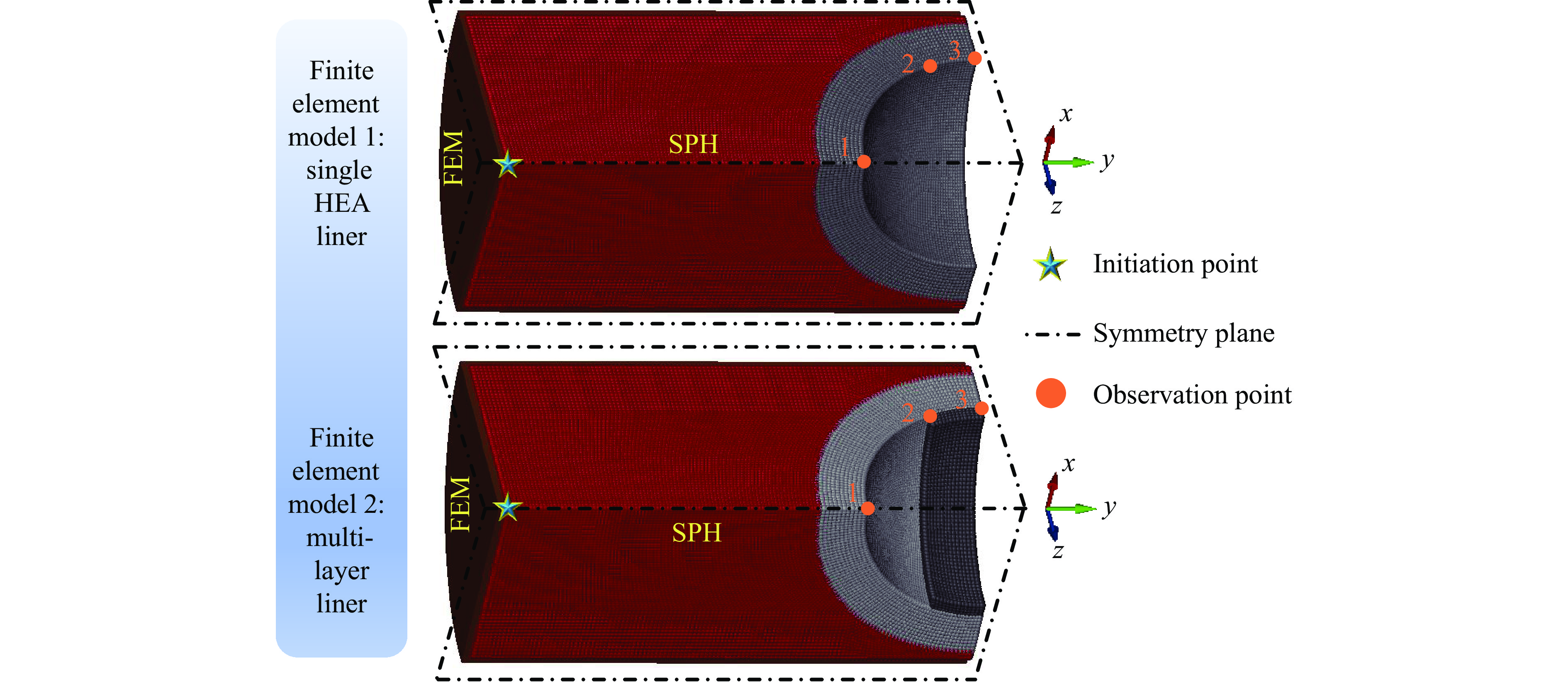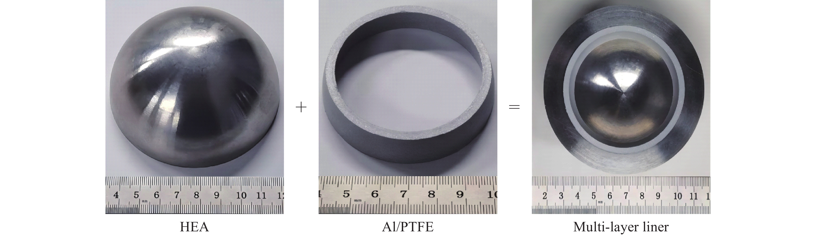 针对传统金属射流在侵彻混凝土目标时存在毁伤面积有限、动态响应不足等问题,首次提出了一种新型高熵合金/铝/聚四氟乙烯(high-entropy alloys/aluminium/polytetrafluoroethylene,HEA/Al/PTFE)双层含能复合药型罩结构。采用真空电弧熔炼、粉末压制与烧结工艺,成功制备出带截顶内衬的半球形复合罩,并通过试验与数值模拟相结合的方法,系统研究了其成型机理、侵彻特性与毁伤效能。试验结果表明,相较于单层HEA罩,该复合结构能显著增强混凝土内部的碎裂和裂纹扩展能力,有效融合了HEA的优异力学性能与Al/PTFE的高能量释放特性。数值模拟表明,内衬对HEA射流具有抑制径向发散、提升射流中段凝聚性的“包覆”作用,但其多次碰撞-追随-分离行为也会延迟系统动态平衡。进一步建立了该复合罩分区成型理论模型,通过引入能量损失系数修正爆轰能量传递过程。理论预测结果与数值模拟结果的对比显示,形成的射流半径与杵体半径的误差小于15%。在此基础上分析了内衬厚度和高度对射流成型的影响规律,确定最优参数为厚度3.5 mm、高度12 mm,可在射流凝聚性、长度及毁伤威力之间实现最佳平衡。