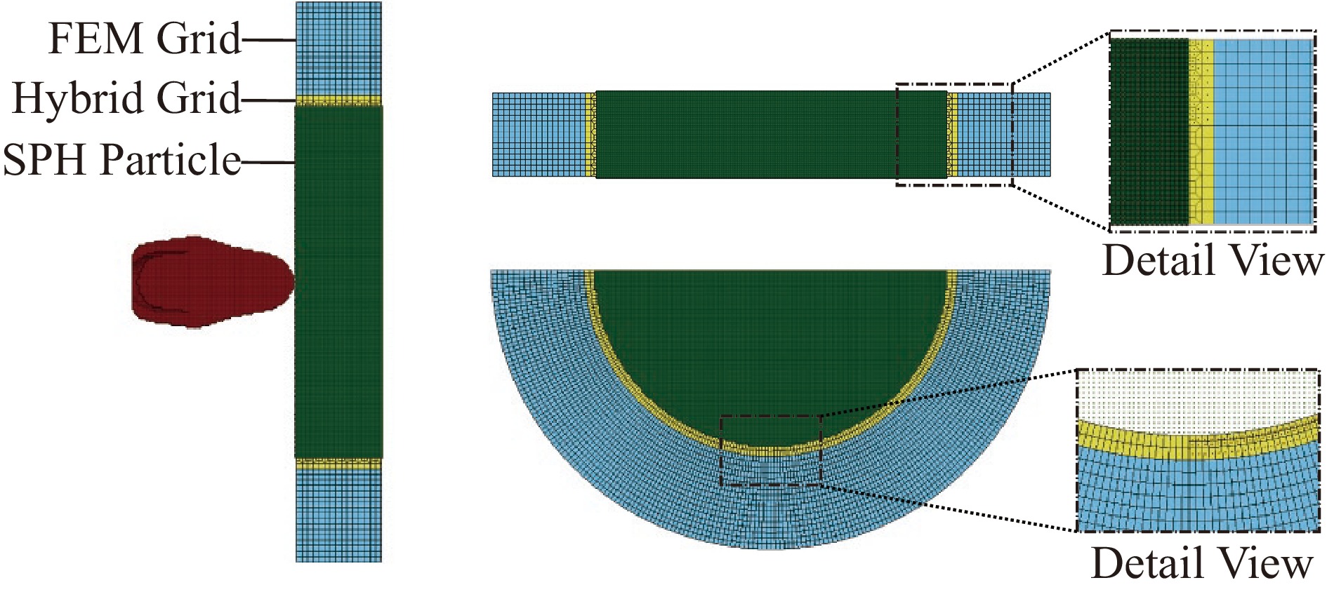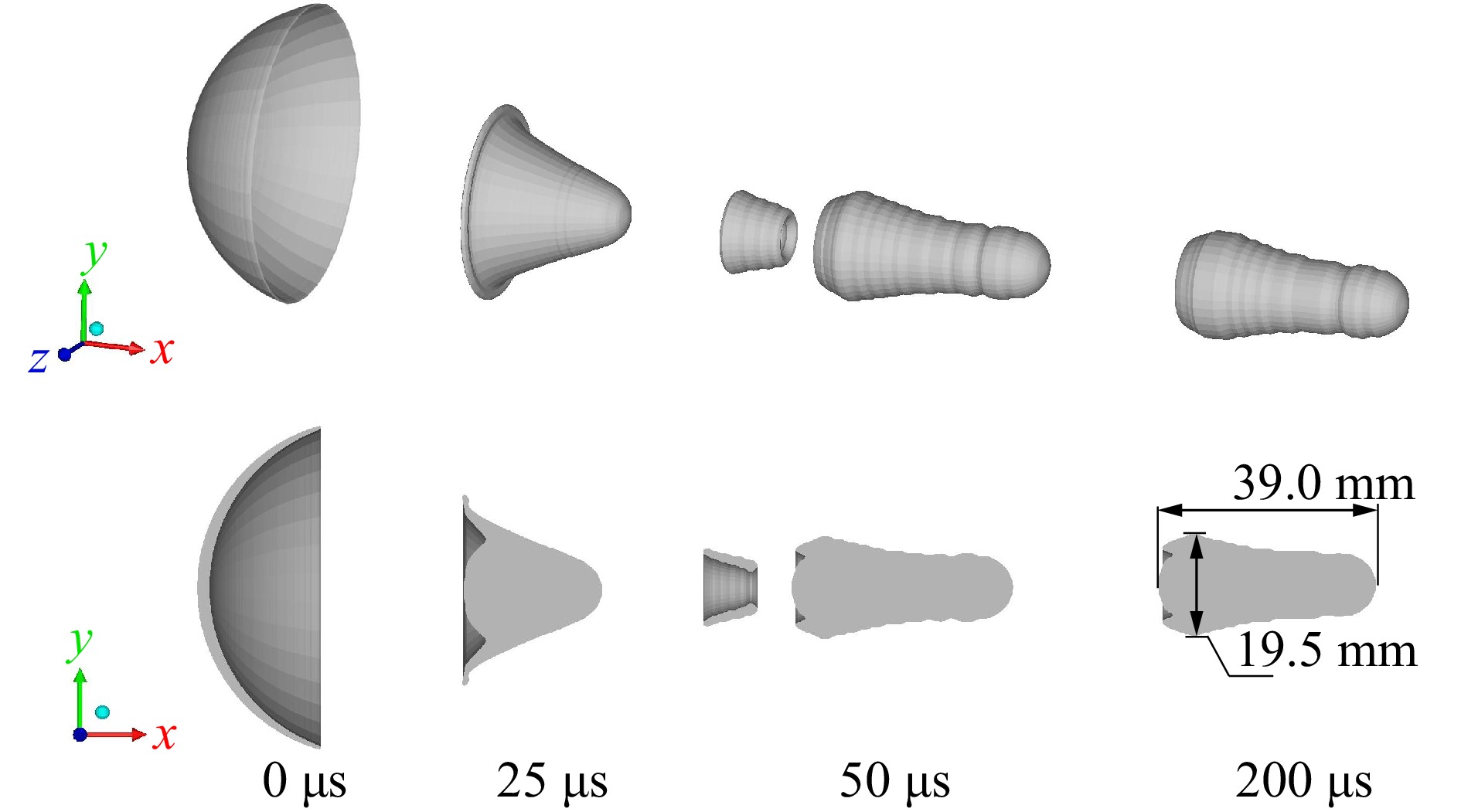 基于热最优输运无网格(hot optimal transportation meshfree, HOTM)方法,提出了能够准确预测弹药在冲击载荷下响应特性的无网格数值仿真方法,建立了炸药在冲击载荷下的高精度热-力-化学耦合模型,综合考虑了炸药起爆过程中的温度效应和压力效应,将炸药起爆的Arrhenius热-化学反应耦合模型和局部高压引发的Lee-Tarver压力三项式点火模型有机耦合,实现了对不同冲击速度下炸药不同起爆机制的准确模拟,从而预测弹药在遭受冲击载荷过程中的高速接触、金属外壳大塑性变形、材料断裂、热传导、炸药起爆、化学反应产物膨胀做功等复杂的物理现象。以子弹撞击弹药(850 m/s)和破片撞击弹药(