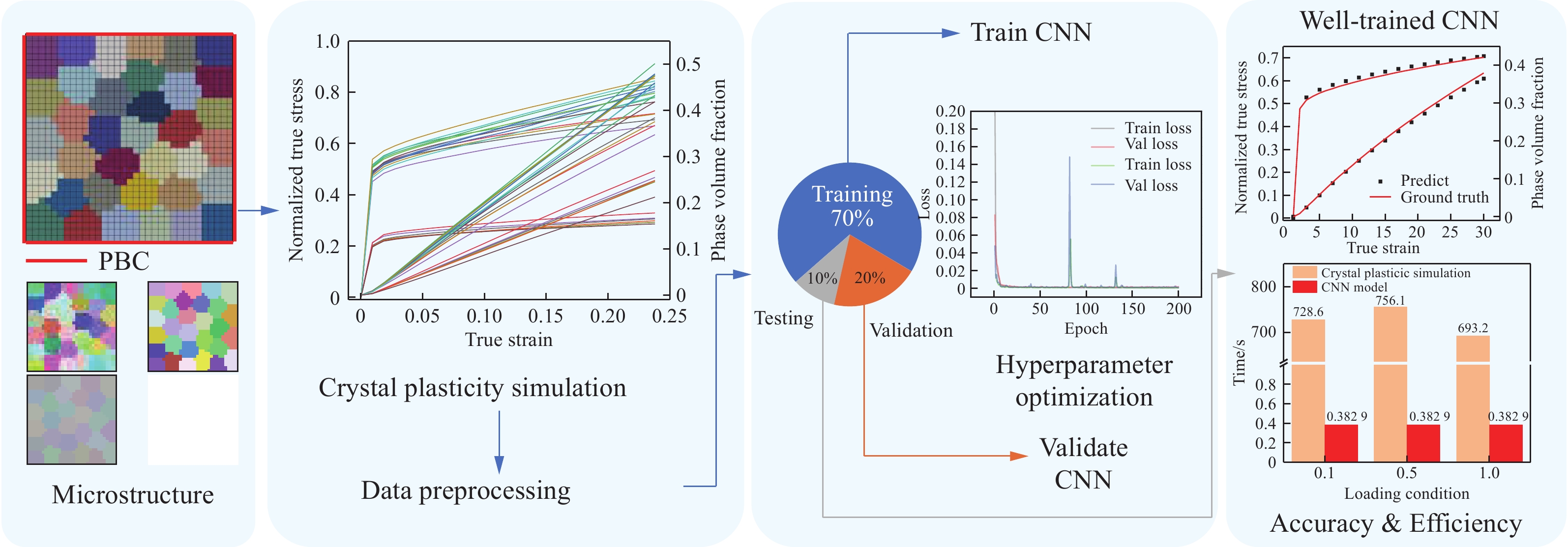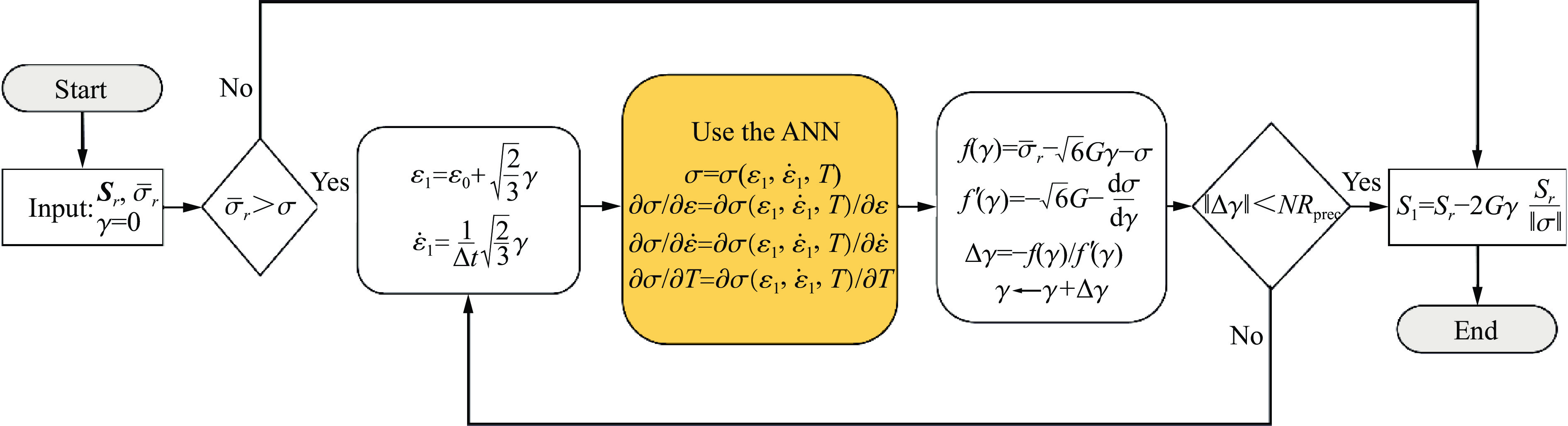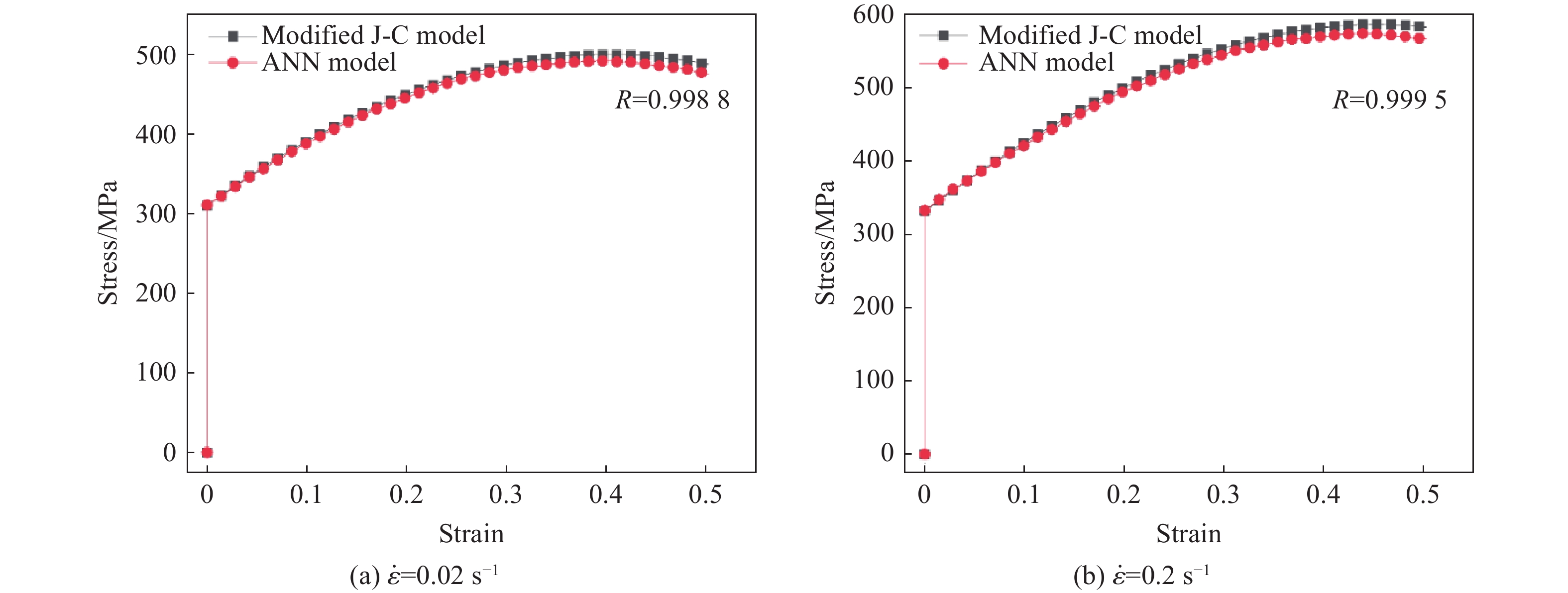 以CoCrFeNiMn高熵合金为研究对象,首先开展了不同温度与应变率下的压缩实验,获得了应力-应变数据;随后基于实验结果建立了修正的Johnson-Cook本构模型,并用于有限元仿真生成机器学习训练数据。在此基础上构建人工神经网络(artificial neural network, ANN)模型,对材料流动应力进行学习与预测。为实现神经网络在有限元框架中的高效应用,开发了基于FORTRAN的自动代码生成工具,将训练完成的ANN模型嵌入到Abaqus/Explicit计算平台中。结果表明,该方法预测精度高,相对误差低于1%,且计算效率优于传统本构模型。基于数据驱动的神经网络方法可有效替代传统本构模型在有限元中的应用,为金属材料的数值建模与模拟提供了一条有效路径。