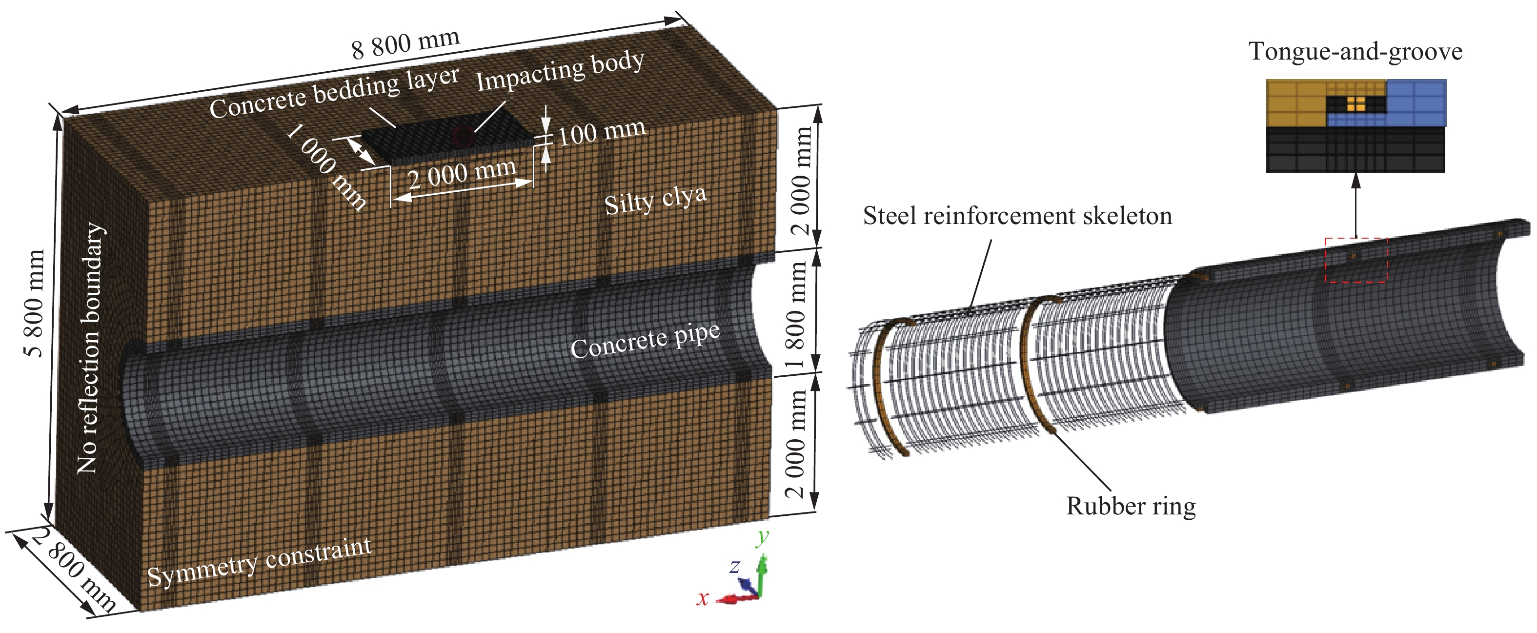 钢筋混凝土(RC)棚洞是山区公路和铁路设施抗落石冲击的有效原位防护手段,利用LS-DYNA商用有限元软件开展了落石冲击无垫层、铺设600mm和1200mm厚砂垫层以及1200mm厚砂-发泡聚乙烯泡沫(EPE)复合缓冲垫层的原型框架T梁式RC棚洞损伤破坏评估的精细化数值模拟分析。首先,建立了落石(质量:1t~30t,速度:10m/s~57m/s)冲击沪昆铁路某原型框架T梁式RC棚洞的精细化有限元模型。其次,通过对比落锤(石)冲击无垫层、带砂和EPE垫层RC板试验中的落石冲击力、加速度和侵入深度时程,以及RC板支座反力和挠度时程,充分验证了数值仿真方法中的材料模型、网格尺寸、接触算法及其参数取值的适用性和可靠性。进一步,对比分析了落石冲击下无垫层、铺设砂和砂-EPE复合垫层原型棚洞的损伤破坏和动态响应。最后,以落石最大侵入深度达到棚洞顶板与垫层总厚度作为棚洞失效破坏阈值,给出了棚洞失效破坏对应的落石质量与临界冲击速度关系式,实现棚洞防护性能的快速评估。/t/n(1)质量15t、速度10m/s和25m/s的落石冲击下,无垫层棚洞的损伤破坏集中于顶板冲击区域,铺设砂垫层以及砂-EPE复合垫层平均可分别降低落石冲击力峰值92.8%和91.6%,棚洞其余受弯构件的最大挠度范围为2mm~20mm,呈现轻微损伤;(2)落石冲击速度为10m/s时,砂-EPE复合垫层的缓冲耗能效果优于砂垫层,冲击速度增大至25m/s时,复合垫层中的EPE被快速压实导致其防护效果不及砂垫层,顶板承受的冲击力和冲击能量较铺设砂垫层分别增大了89.3%和37.8%;(3)棚洞失效破坏对应的落石临界冲击速度随落石质量增大呈幂函数衰减规律,铺设垫层可使临界冲击速度提高52%~155%,显著提升棚洞的防护性能。