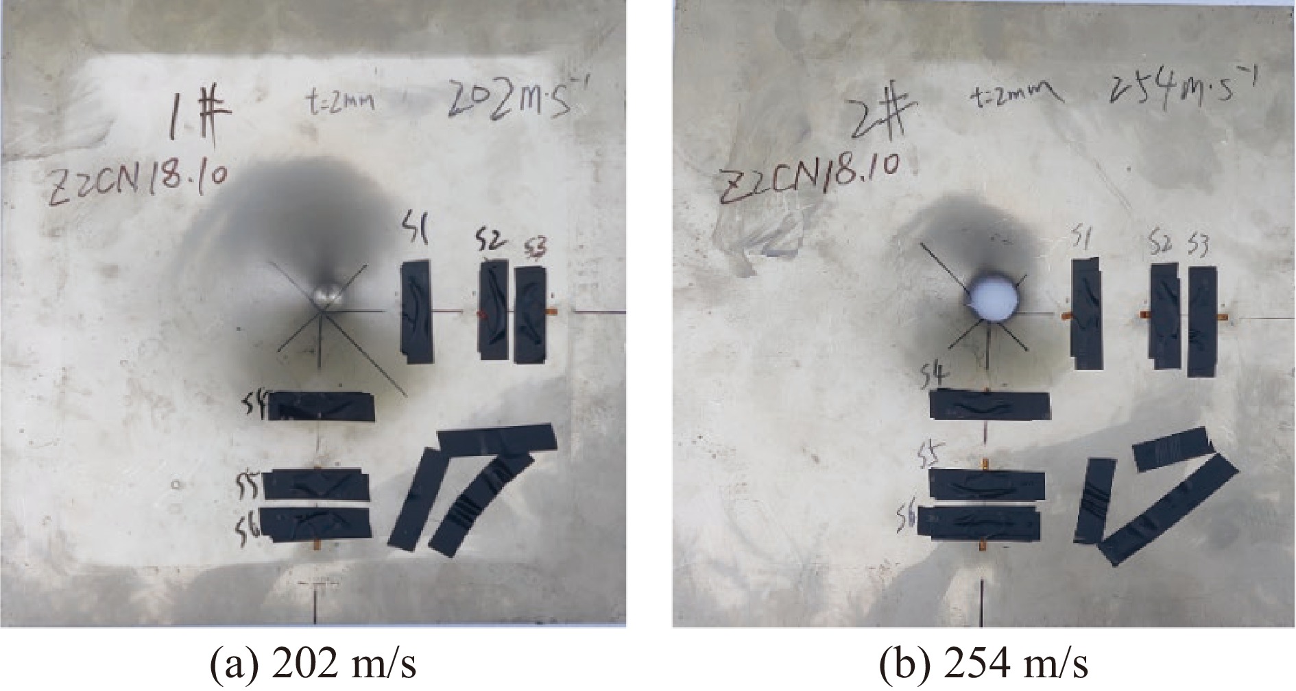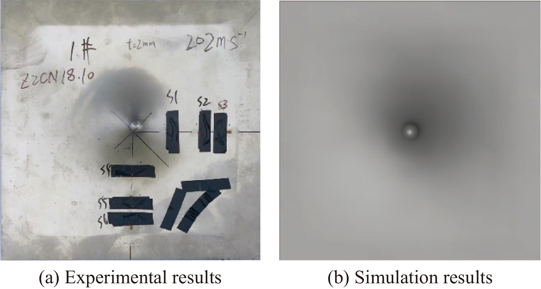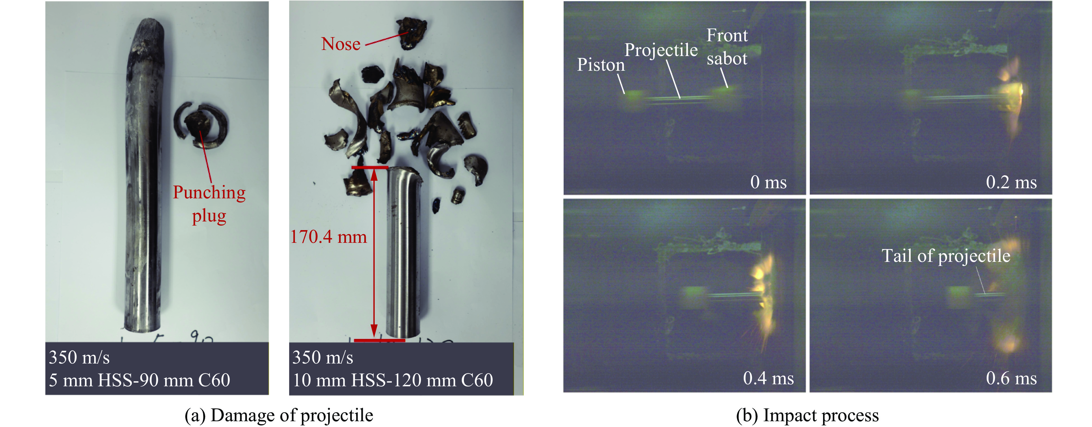 125 mm火炮开展了系列400 m/s冲击速度下的侵彻试验,得到了弹体破坏形态和靶体侵彻深度等试验数据。结合半无限厚混凝土靶体的抗侵彻试验进行对比分析,探讨了材料高强力学性能以及球状偏航结构等因素对弹体偏转破碎、侵彻能力的影响。结果表明:在400 m/s的侵彻速度下,设计的超高强球面结构的无量纲侵彻深度为0.11,弹体偏转角为呈83°,质量损失率达23.66%,结构抗侵彻能力为C40混凝土的9倍,防护能力较普通混凝土有显著提升。超高强球面结构的非对称撞击力促使来袭弹发生偏转破碎,使弹体头部产生严重侵蚀,并在侵彻过程中产生跳弹、二次着靶以及折断等行为,可有效阻挡弹体侵入结构内部,极大削弱来袭弹体在防护结构中的侵爆作用。