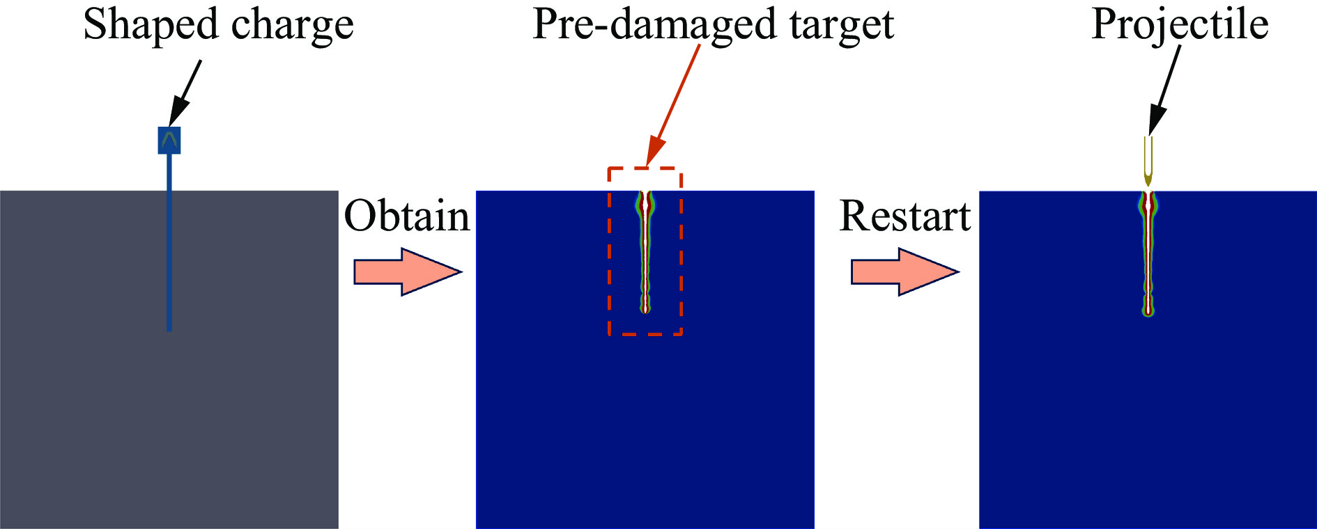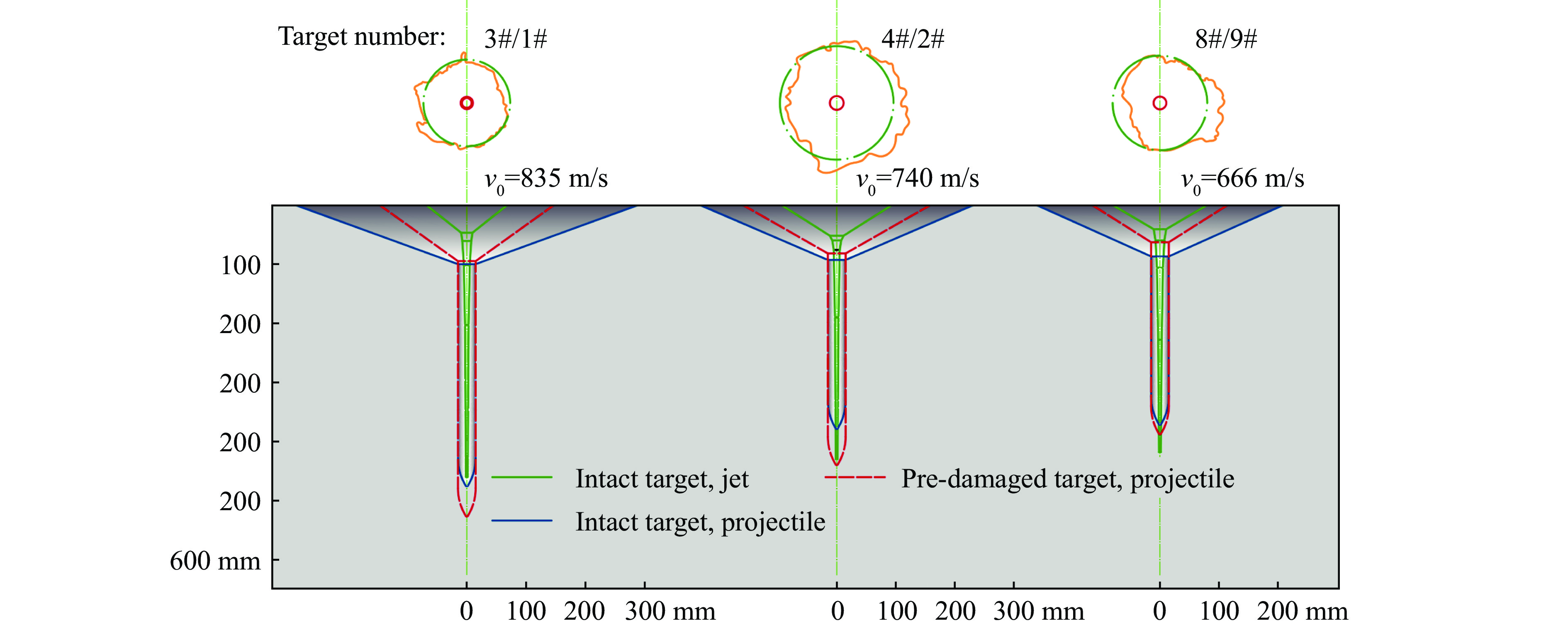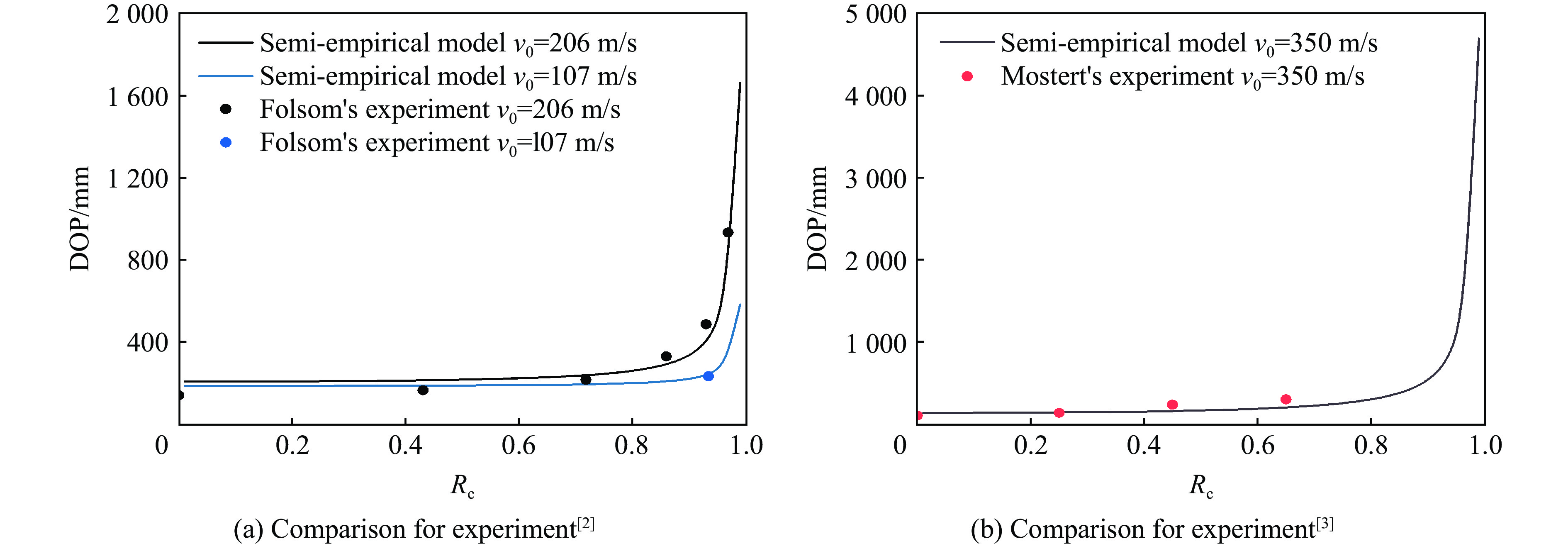 为研究混凝土靶体损伤对弹体侵彻性能的影响效果,基于空腔膨胀理论,完善了弹体侵彻预损伤混凝土半经验模型,采用前级射流、后级动能弹体对混凝土靶进行了连续侵彻试验,获得了影响弹体侵彻预损伤混凝土性能的关键因素,结合预损伤混凝土靶体中混凝土材料强度变化关系,分析了弹靶参数对弹体二次侵彻性能的影响规律。结果表明:靶体预损伤对弹体侵彻深度的增益效果由开坑体积差及混凝土损伤共同影响,且混凝土损伤为主要影响因素;当靶体内存在有限长损伤区,靶体开孔直径是弹体直径的0.3~0.5倍时,靶体损伤对弹体侵彻深度增益最为明显;当靶体内存在贯穿损伤区,靶体开孔直径与弹体直径的比值为0.3时,预损伤靶体与预开孔靶体中弹体侵彻深度差异较为明显,且随着比值进一步增加,两者差异逐渐增加;当靶体损伤状态一定时,减小弹体直径或增大尖卵形弹体头部CRH对增加侵彻深度更为有利。