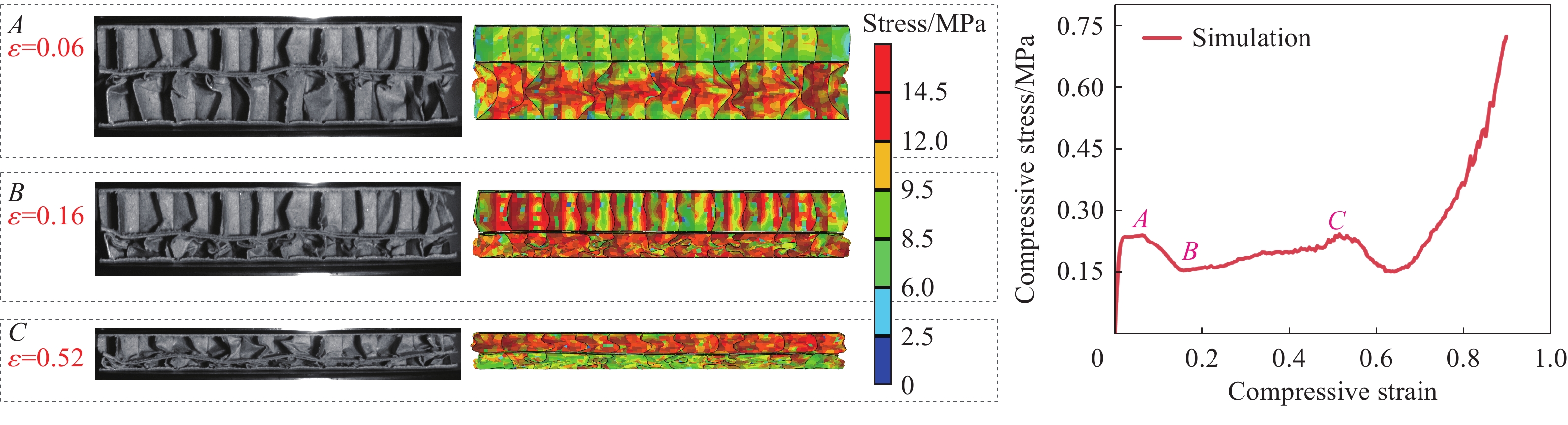 为提升防爆墙的抗爆性能,将负泊松比结构与超高韧性水泥基复合材料(ultra-high toughness cementitious composites, UHTCC)结合,并通过爆炸试验与数值模拟相结合的方法,分析负泊松比靶板的抗爆性能,证明UHTCC负泊松比靶板的抗爆优越性。首先,利用混凝土3D打印技术实现负泊松比结构建造,并通过靶板接触爆炸试验结果验证有限元模型的可靠性。在此基础上,利用该有限元模型模拟分析了靶板材料、结构、胞元内凹角及实心层厚度占比等因素对接触爆炸下结构破坏形态与能量消耗的影响。结果表明:(1) 具有高韧性的UHTCC靶板抗爆性能显著优于混凝土靶板;(2) 3种结构中,负泊松比结构板吸能能力最强,实心板更能保持结构的完整性;(3) 当负泊松比胞元内凹角为61°时抗爆性能最优,过小或过大均降低结构抗爆性;(4) 负泊松比结构厚度占靶板总厚度过大时抗爆性能弱,结构破坏严重,可上下层同时或仅背爆面增加实心层厚度,在有效削弱爆炸冲击波、吸收能量的同时,提高结构完整性。研究验证了负泊松比UHTCC板抗爆性能优越性,并为基于负泊松比结构的防爆墙设计提供了理论依据。