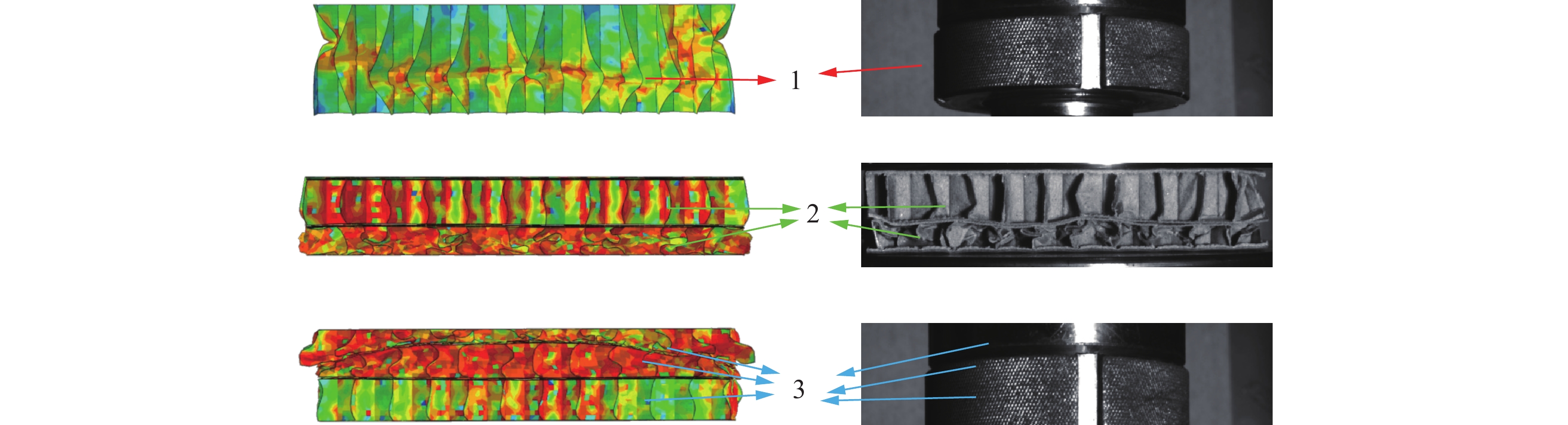 受三浦折纸和星形蜂窝的混杂拓扑设计启发,提出了一种新型折纸超材料夹芯复合结构,并融合机器学习实现了其低速冲击响应的预测和多目标优化。通过落锤冲击实验和有限元仿真,系统探究了该结构在低速冲击下的动态力学响应和变形失效模式。结果表明,折纸启发的拓扑结构有效地将传统蜂窝结构的瞬时完全断裂转化为了渐进压溃失效,从而显著提升了其抗冲击性能。随后提出了残差连接增强的深度学习模型,实现了对该结构完整低速冲击响应的快速精确端到端预测,计算效率较有限元仿真大幅提升。并基于此参数分析了关键角度对冲击响应和等效密度的调控机理,特别是角度变化诱导的壁板拉压变形与折痕弯曲变形间的载荷重新分布现象,使结构能在承载型与缓冲型功能间切换,提供了冲击响应与失效模式主动可调控的机理依据。最后,进一步结合强化学习和帕累托前沿分析,以训练完备的深度学习模型作为代理模型,针对承载防护和缓冲防护需求实现了结构的轻量化多目标优化。在等效密度相近时,折纸超材料能够实现峰值力的大范围调控,有益于针对不同防护场景按需定制化开发的防护结构。