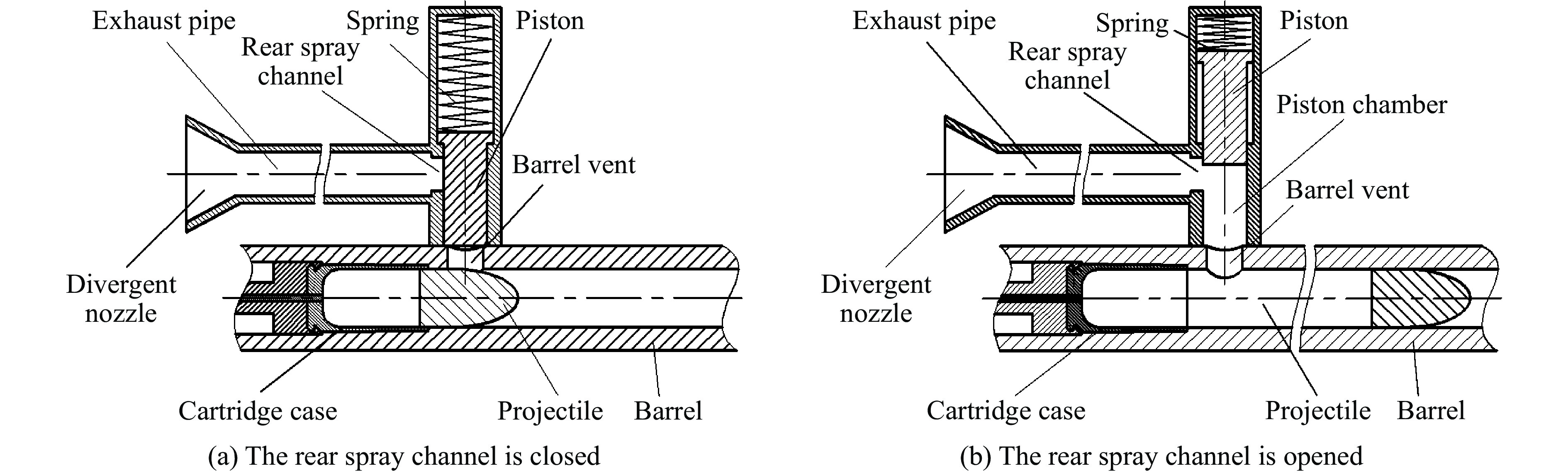 为研究活塞回复运动对火药燃气流动的影响,基于两相流理论对活塞控制侧向后喷武器的发射过程进行了数值模拟研究。考虑控制侧向后喷通道开闭的活塞-弹簧系统的往复运动,建立了结合膛内气固两相流、活塞腔内流固耦合和侧向排气管内气体瞬态流动的武器发射过程数学模型,并将数值模拟结果与相关文献进行了比较验证。得到了该武器发射过程中膛内流场分布与稀疏波传播特性,并与普通武器的膛内流场进行了对比分析。进一步研究了活塞回复运动对火药燃气流动和减后坐效率的影响。结果表明:相对于不考虑活塞的回复运动,在弹丸初速都降低1.52%的情况下,因为活塞回复关闭后喷通道,其减后坐效率由38.86%下降到32.88%,说明在此类武器研究中,不可忽视活塞回复运动。