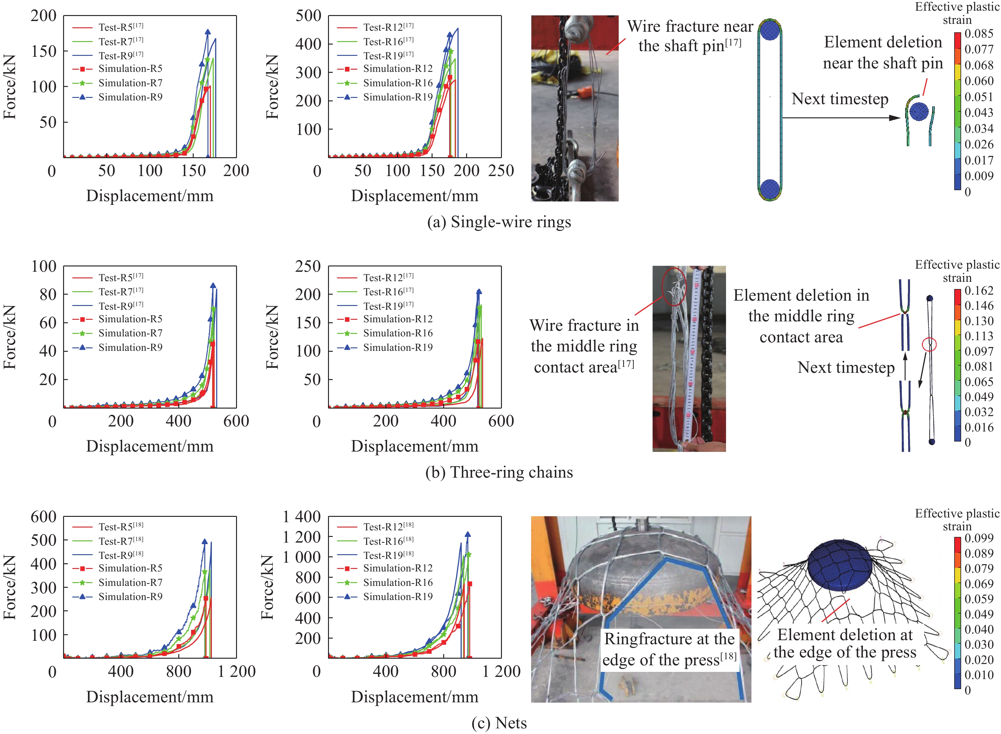 采用数值模拟方法开展了8 000 kJ能级被动柔性防护网的抗落石冲击分析与设计工作。首先,基于显式动力学有限元软件ANSYS/LS-DYNA对典型被动柔性防护网单环和三环环链拉伸试验、网片顶破试验以及2 000 kJ能级落石冲击足尺防护网试验进行数值模拟复现,通过与网环最大破断力、破断位移和破坏特征、落石冲击全过程以及防护网钢丝绳内力时程等试验数据进行对比,验证了所采用数值模拟方法的可靠性。然后,分析了钢柱倾角、跨距、高度以及消能装置规格等参数对落石冲击下防护网动力行为的影响,结果表明:消能装置规格是控制防护网内力与位移的关键参数;钢柱倾角建议取10°;增大钢柱跨距会降低结构的面内刚度,而对横向锚固力的影响较小;增加钢柱高度会显著提升柱底支反力;改变钢柱高度和跨距需同时合理调整各钢丝绳的锚固位置。最后,通过调整防护网几何尺寸、消能装置规格和添加横向辅助支撑绳等措施给出了2种8 000 kJ能级防护网设计方案,均通过EAD 340059-00-0106标准检验。