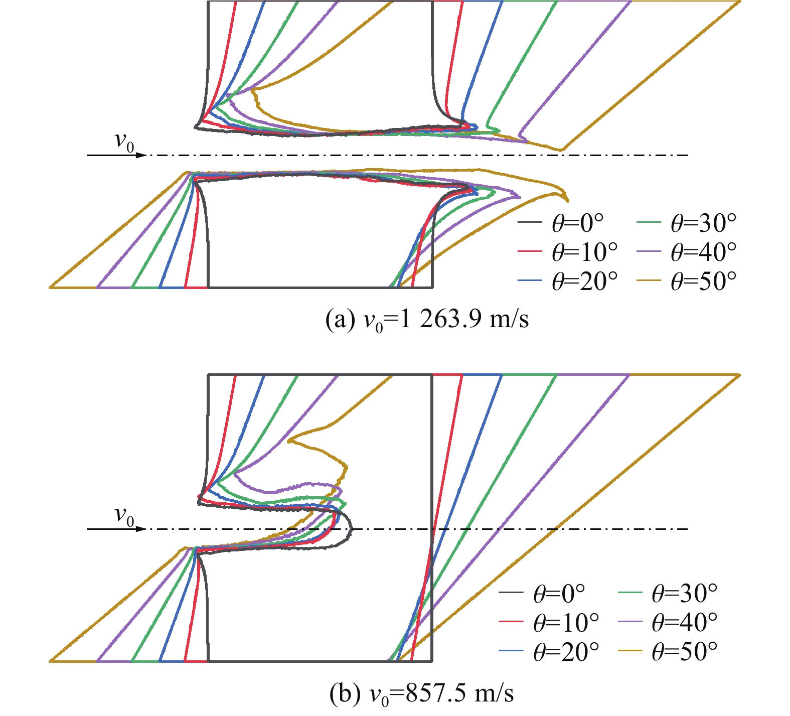 为了研究椭圆类截面弹体侵彻多层间隔钢靶的弹道特性,开展了典型弹体侵彻多层间隔Q355B钢靶试验,基于LS-DYNA软件开展有限元仿真研究,得到了弹体在侵彻过程中的姿态偏转和弹道参数,分析了弹体的偏转机制,获得了截面形状、截面压缩系数、初速、滚转角和着角等弹靶参数对椭圆类截面弹体侵彻弹道特性和姿态偏转特性的影响规律。研究结果表明:滚转角为0°时,圆截面弹体侵彻弹道的稳定性优于椭圆类截面弹体;弹体截面压缩系数越大,弹体侵彻弹道稳定性越好;弹体初速越大,弹体姿态偏转越小,侵彻弹道越平稳;滚转角为90°时,椭圆截面和非对称椭圆截面弹体在入射平面内的侵彻弹道最稳定,并且两种弹体在水平面内的弹道偏移量分别在滚转角为45°和90°时达到最大,非对称椭圆截面弹体在滚转角为钝角时的侵彻弹道稳定性优于锐角时的情况;弹体着角在[0°,50°]范围内时,侵彻弹道稳定性随着角的增大先减弱后增强,着角在30°左右时姿态偏转和弹道失稳最严重;弹体以较正姿态贯穿薄钢靶时,在弹头部侵彻阶段就已经与靶体分离;弹体以较大攻角贯穿薄钢靶时,弹靶接触主要发生在弹体的上表面。