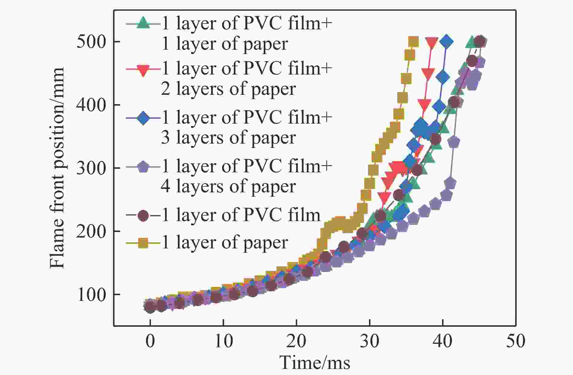 甲烷浓度/% 爆炸压力/kPa 1层PVC薄膜 1层纸膜 1层PVC薄膜+1层纸膜 1层PVC薄膜+2层纸膜 1层PVC薄膜+3层纸膜 1层PVC薄膜+4层纸膜 6.5 6.7 15.3 19.4 34.3 52.2 69.2 7.5 6.7 14.2 18.7 33.6 57.7 70.0 9.5 7.7 15.2 20.1 33.7 55.4 70.2 11.5 6.8 14.9 19.4 35.4 57.0 70.6 -