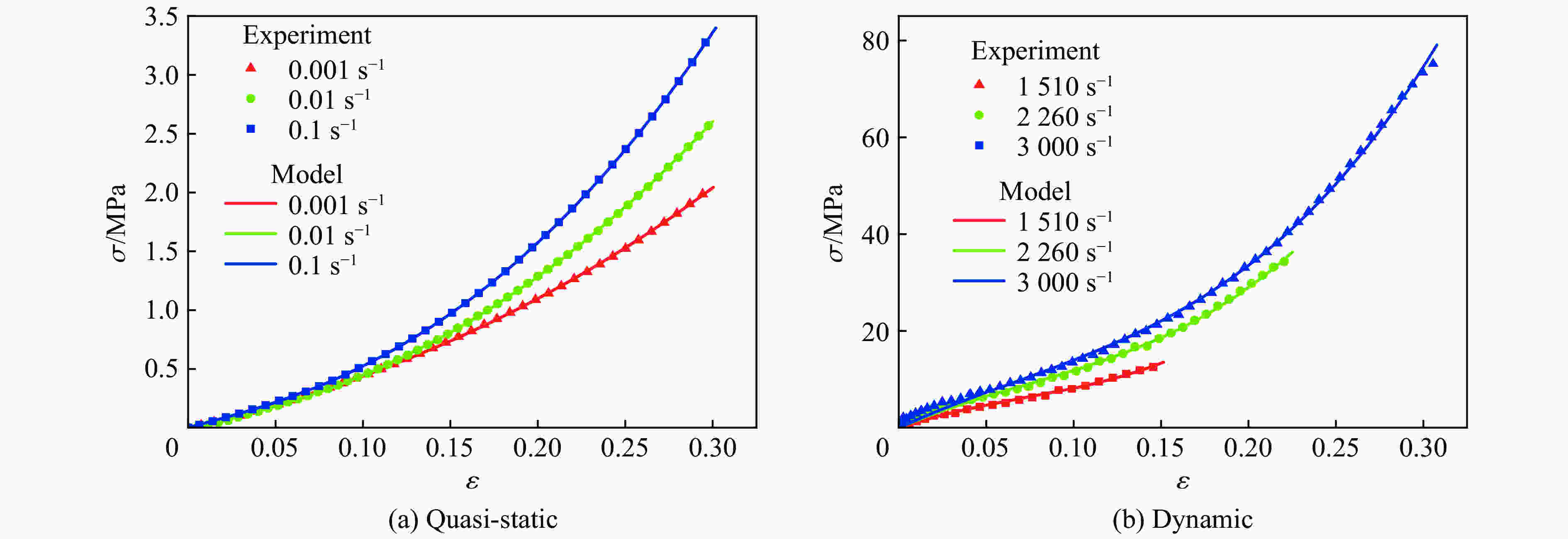 摘要: 为揭示聚氯乙烯弹性体在静、动态载荷下的力学性能,采用万能材料试验机和改进的分离式霍普金森压杆实验装置获得了材料在应变率为0.001、0.01、0.1、1 510、2 260和3 000 s−1下的应力应变曲线,并以屈服强度为整形器优选参数,对比了紫铜、铜版纸和铅等3种整形器材料的整形效果。使用修正的ZWT非线性黏弹性本构模型描述聚氯乙烯弹性体在静、动态载荷下的力学性能。结果表明:聚氯乙烯弹性体在静态载荷下具有应变率效应和显著的超弹性特性,动态载荷下表现出较明显的应变率效应和较强的抗变形能力,且静动态载荷下的力学行为受应变历史影响较大。3种整形器材料中铜版纸的整形效果最好。修正后的ZWT非线性黏弹性本构模型能够得到统一参数的本构表达式,且各应变率下的拟合结果与实验结果具有较好的一致性。