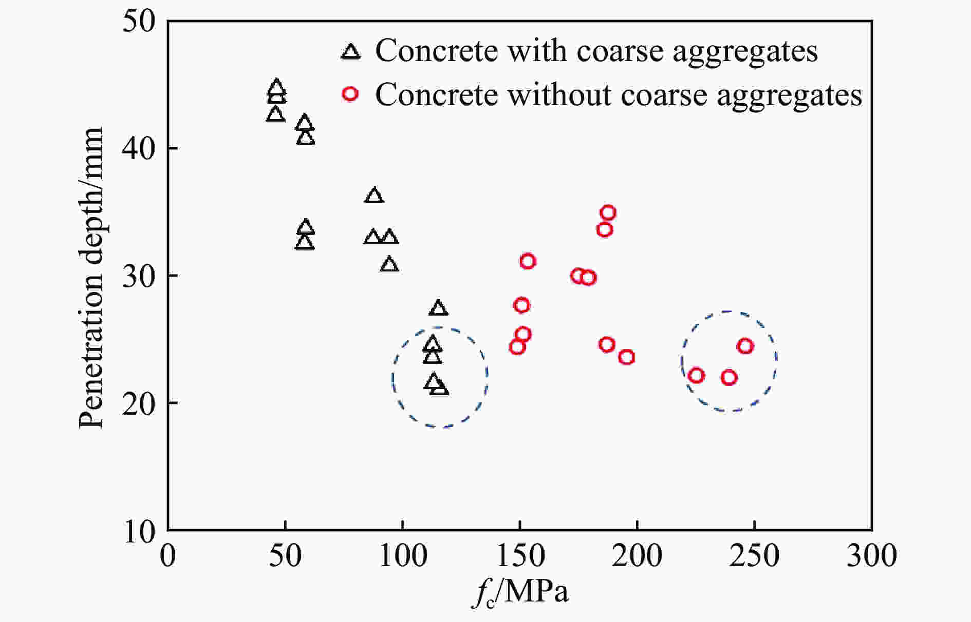 图  5  不同fc条件下混凝土侵彻深度的实验结果[28]