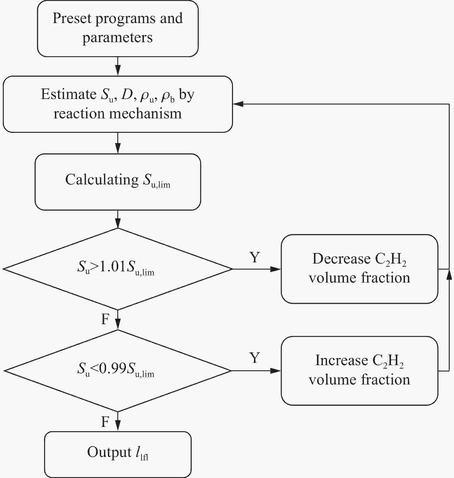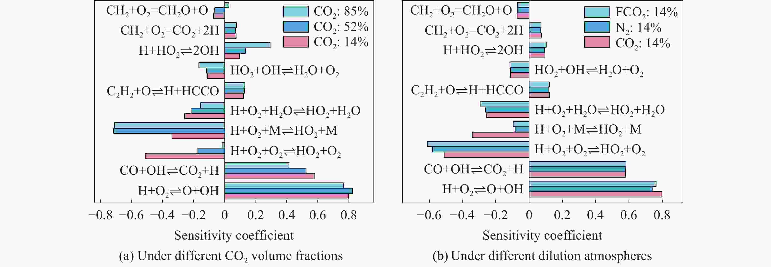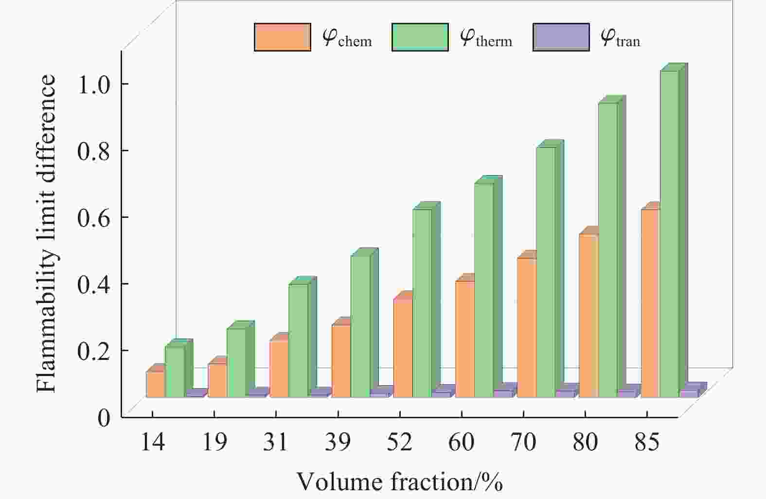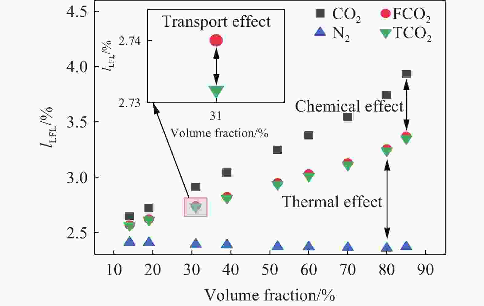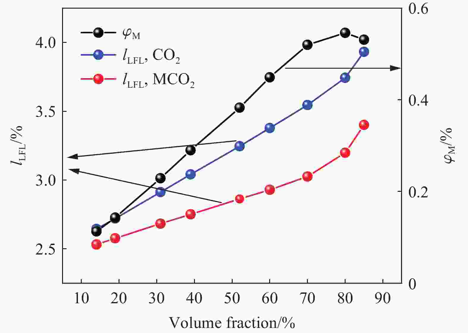 摘要: 为探究清洁燃料乙炔在O2/CO2气氛下的可燃下限,在5 L圆柱体爆炸反应装置中进行实验,测得了乙炔的可燃下限。随着CO2的体积分数从14%增加到85%,乙炔的可燃下限从2.64%增长到3.93%,在较小的范围内呈线性增加。烷烃、烯烃和炔烃的可燃下限依次降低,表明炔烃具有更大的燃烧范围。基于极限层流速度法计算模型,建立了适用于乙炔可燃下限的预测模型。通过实验数据验证了该模型的可靠性,采用该模型讨论了CO2的热力学、化学、输运效应对可燃下限的影响。结果表明:热力学效应的平均占比为64%,化学效应占比35%,输运效应占比1%。Abstract: Oxy-fuel combustion is one of the effective means to reduce greenhouse gases. To grasp the combustion characteristics of the clean fuel acetylene in O2/CO2 atmosphere and to investigate the effect of different CO2 volume fraction on the lower flammable limit of acetylene, the lower flammable limit of acetylene was experimentally measured in a 5 L cylindrical explosive reaction device. With the increase of CO2 volume fraction from 14% to 85%, the experimental value of the lower flammable limit of acetylene increased from 2.64% to 3.93%, which was linearly increased in a small range. Compared with hydrocarbon fuels such as ethylene, ethane, and propylene, the lower flammability limit of alkanes, olefins, alkynes decrease sequentially, indicating that alkynes have a larger combustion range and a higher hazard factor. Based on the calculation model of limiting laminar burning velocity method, a prediction model applicable to the lower flammability limit of acetylene was established. Through the verification of experimental data, the average absolute error of this prediction model using the USC Ⅱ combustion reaction mechanism is at 0.52%, and the model is accurate and reliable. To explain the reason for the existence of the lower flammability limit from the perspective of the competition between the temperature rise of the heat generation from fuel consumption and the temperature drop of the heat dissipation from the expansion of the fuel body, this study examines the thermodynamic, chemical, and transport effects of CO2 on the lower flammability limit. The combustion reaction mechanism of USC Ⅱ is modified to incorporate the virtual substances FCO2, TCO2, and MCO2, and comparing the flammability limits of the three virtual substances as well as those of the five atmospheres of N2 and CO2. The thermodynamic, chemical and transport effects of CO2 on the lower flammability limit were discussed. The results show that the average proportion of thermodynamic effect is 64%, chemical effect is 35% and transportation effect is 1%.