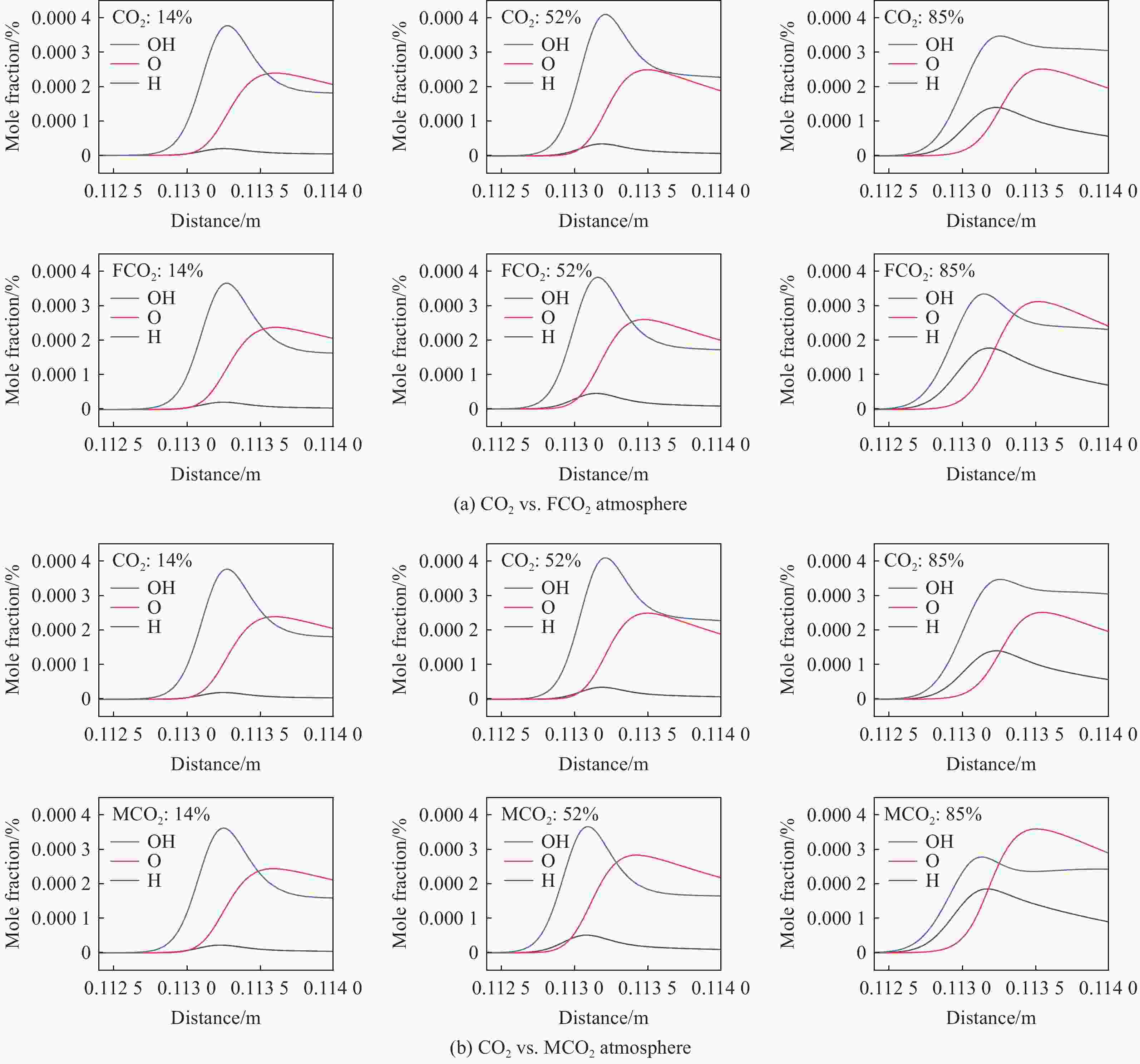 体积分数/%自由基峰值摩尔分数比 H_CO2∶H_FCO2 O_CO2∶O_FCO2 OH_CO2∶OH_FCO2 H_CO2∶H_MCO2 O_CO2∶O_MCO2 OH_CO2∶OH_MCO2 14 0.928 1.001 1.030 0.881 0.983 1.042 52 0.769 0.959 1.070 0.681 0.881 1.120 85 0.790 0.805 1.038 0.760 0.702 1.251 -