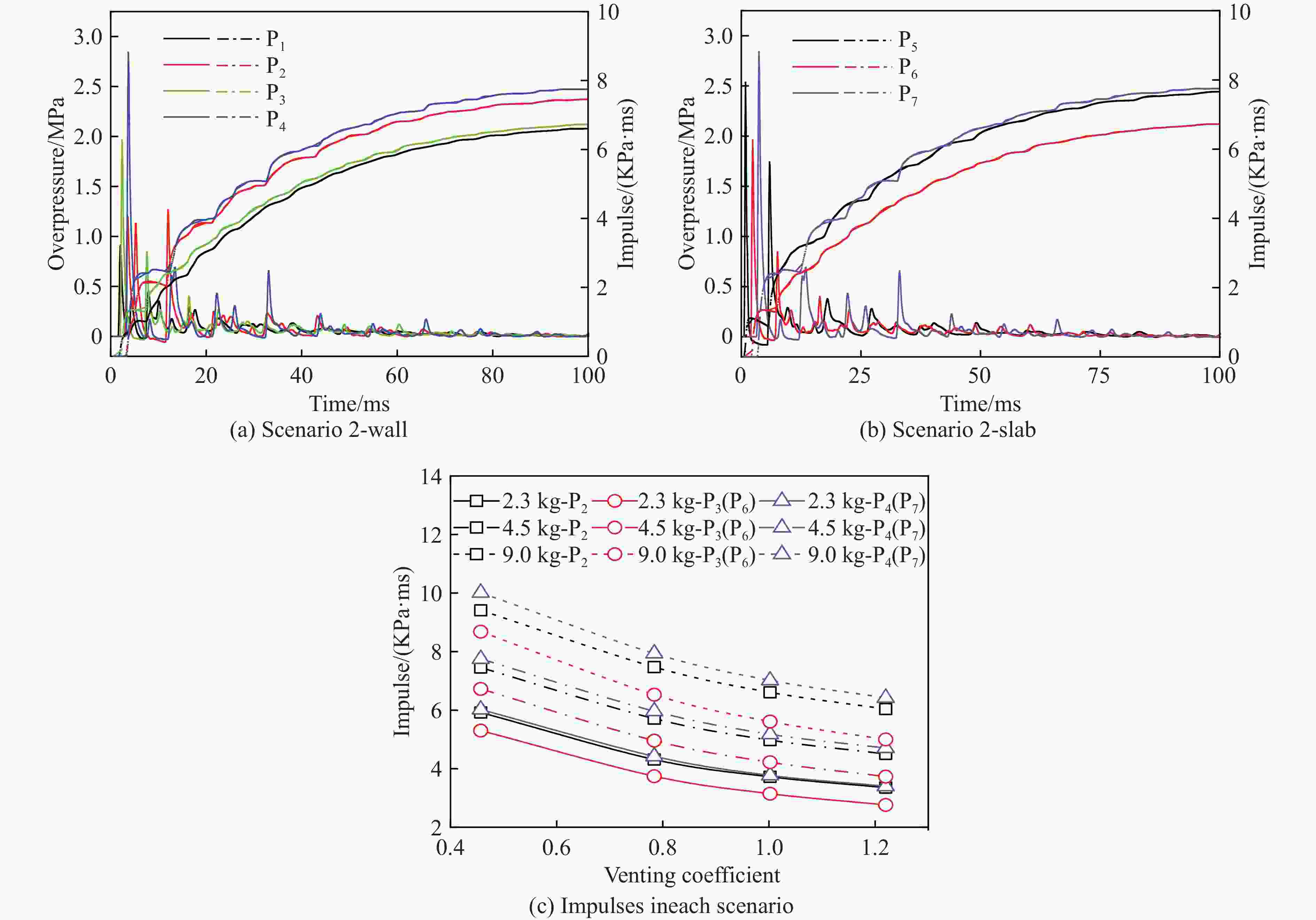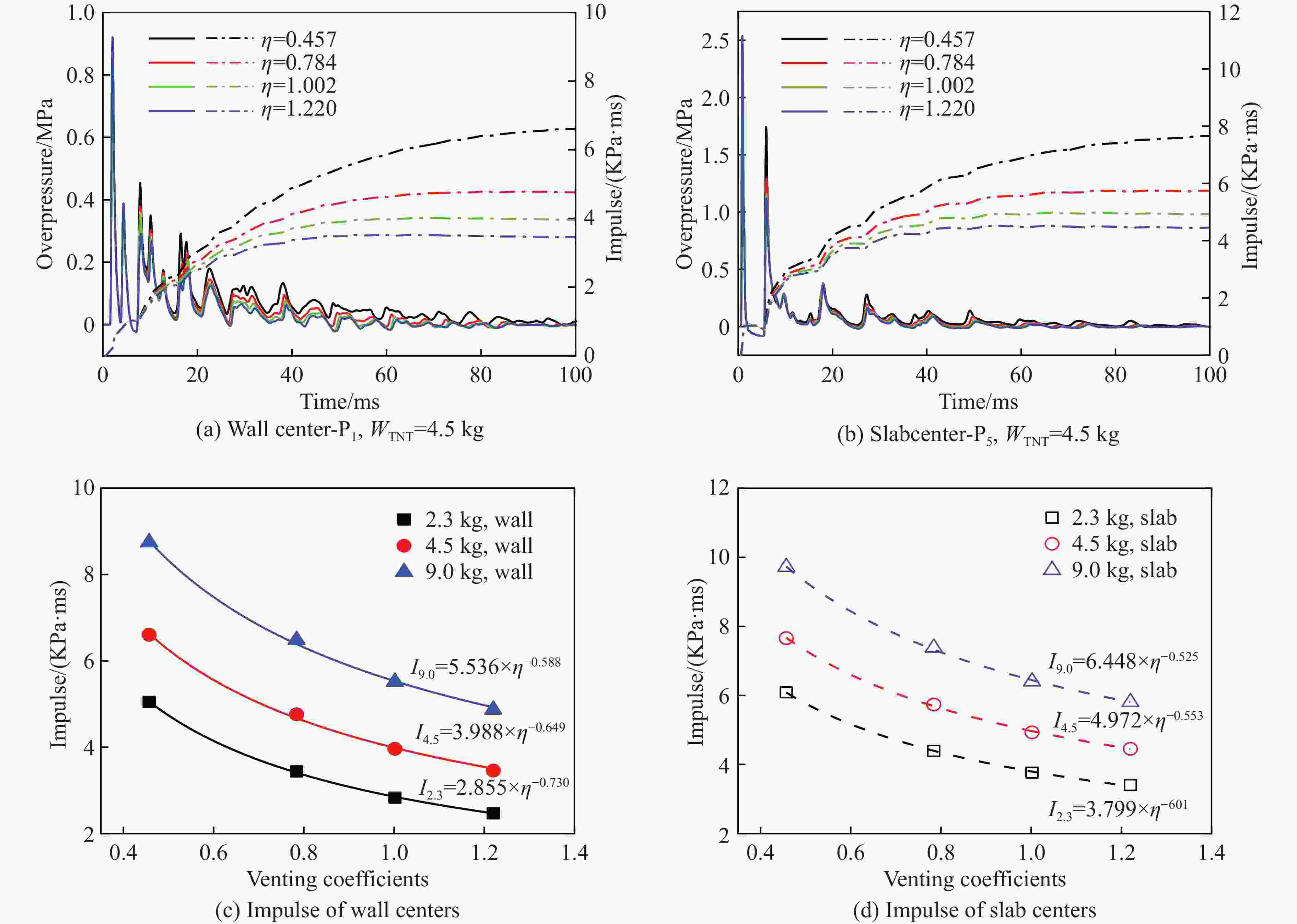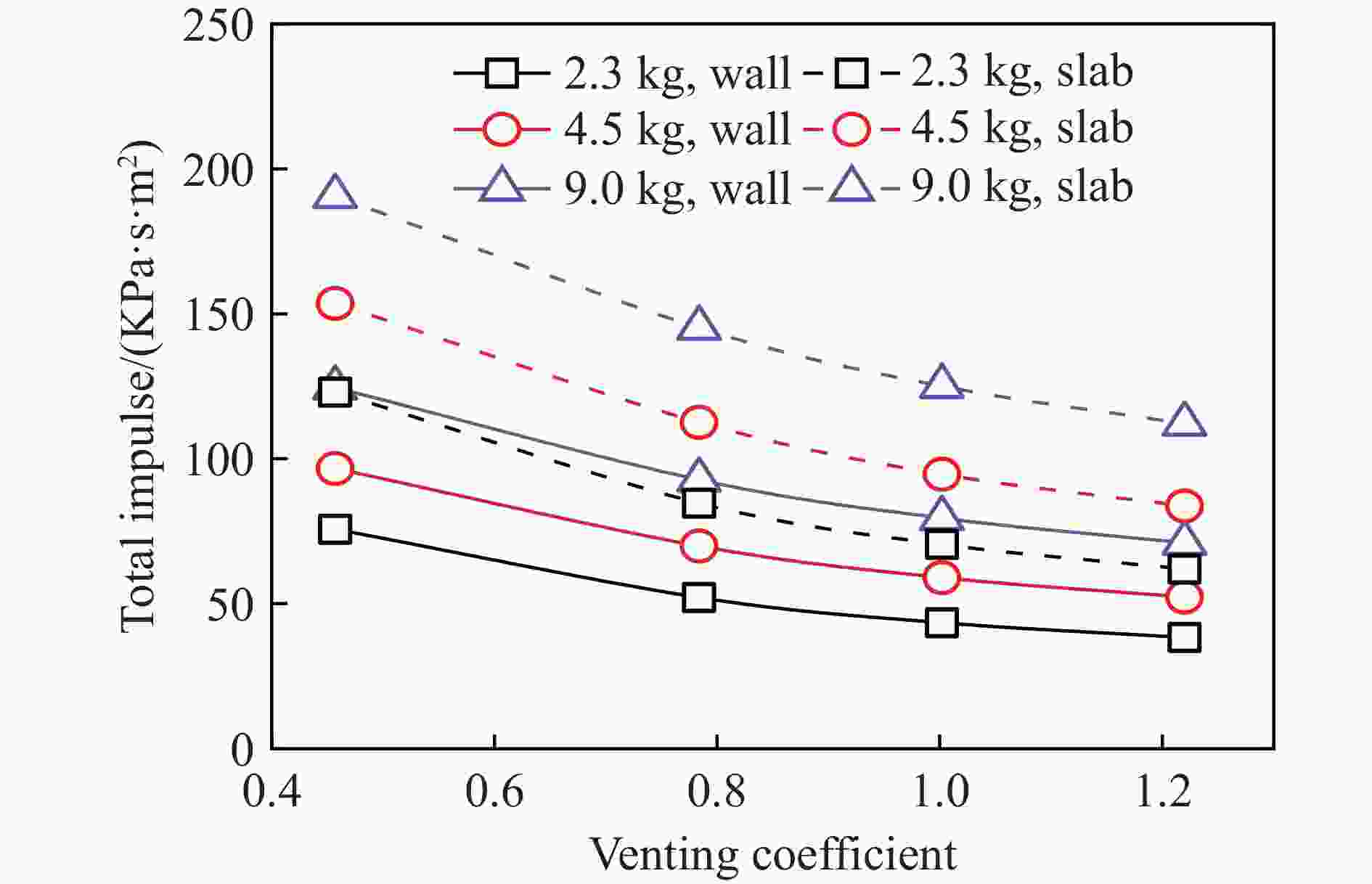 工况 泄爆面积/m2 泄爆系数 TNT当量/kg 工况 泄爆面积/m2 泄爆系数 TNT当量/kg 1 1.89 0.457 2.3 7 4.14 1.002 2.3 2 1.89 0.457 4.5 8 4.14 1.002 4.5 3 1.89 0.457 9.0 9 4.14 1.002 9.0 4 3.24 0.784 2.3 10 5.04 1.220 2.3 5 3.24 0.784 4.5 11 5.04 1.220 4.5 6 3.24 0.784 9.0 12 5.04 1.220 9.0 表 4 自由场爆炸作用于墙体和顶板的反射超压冲量
