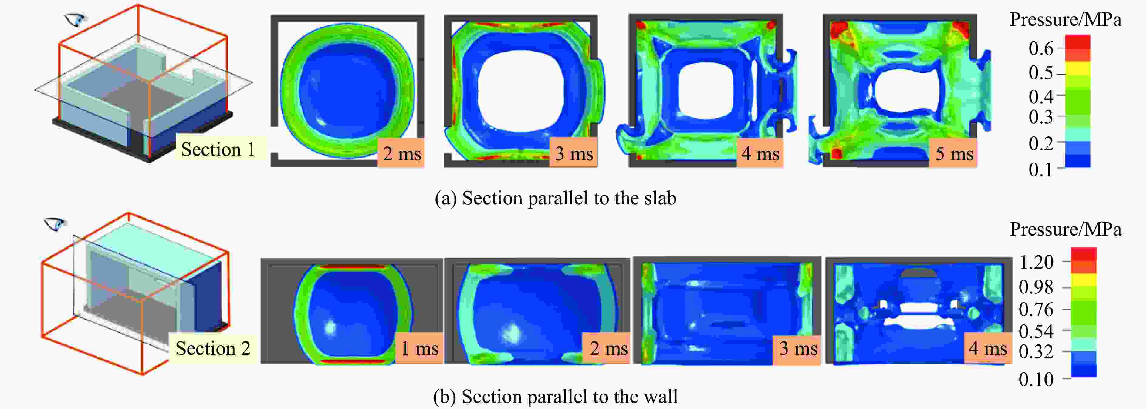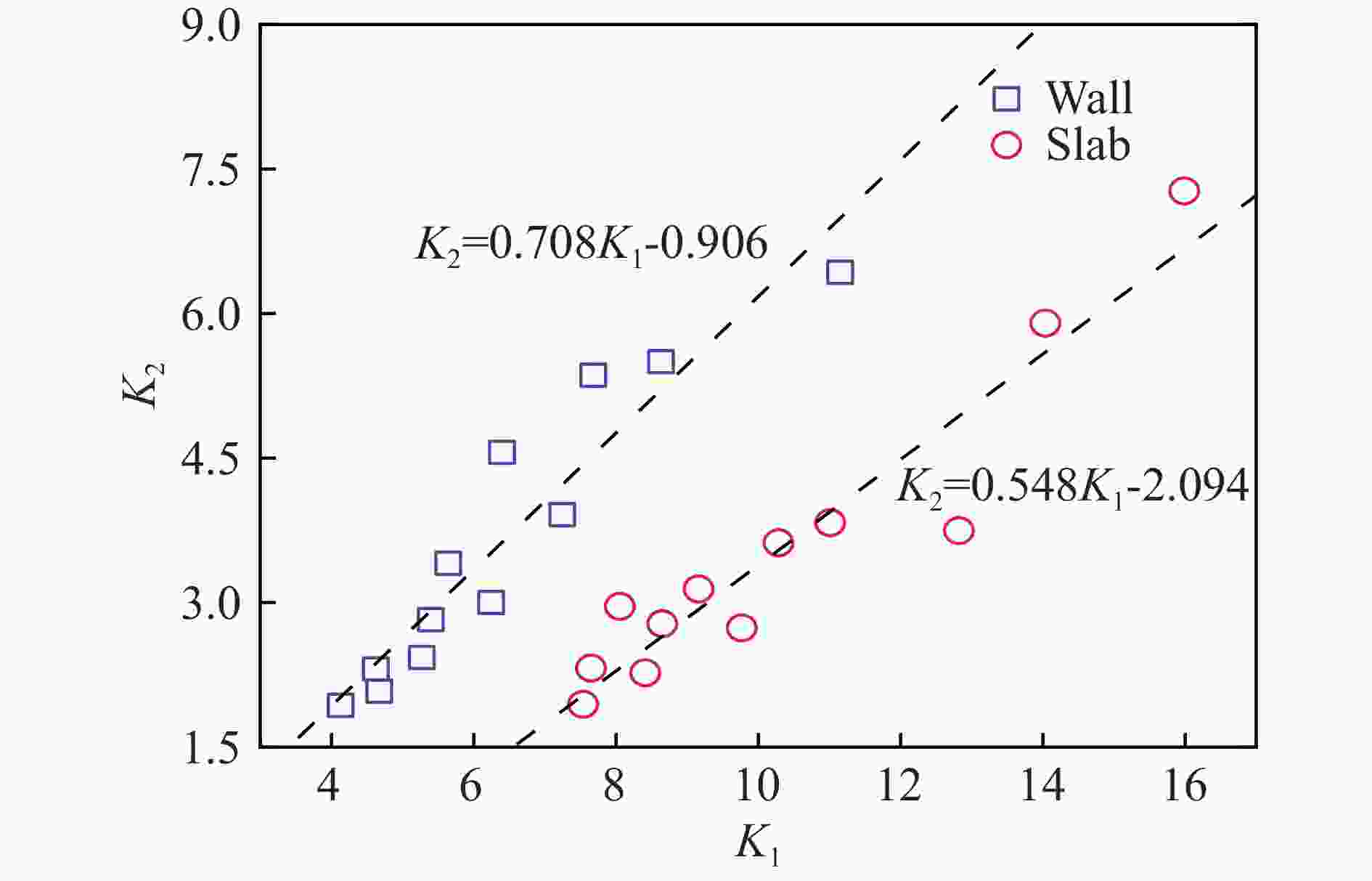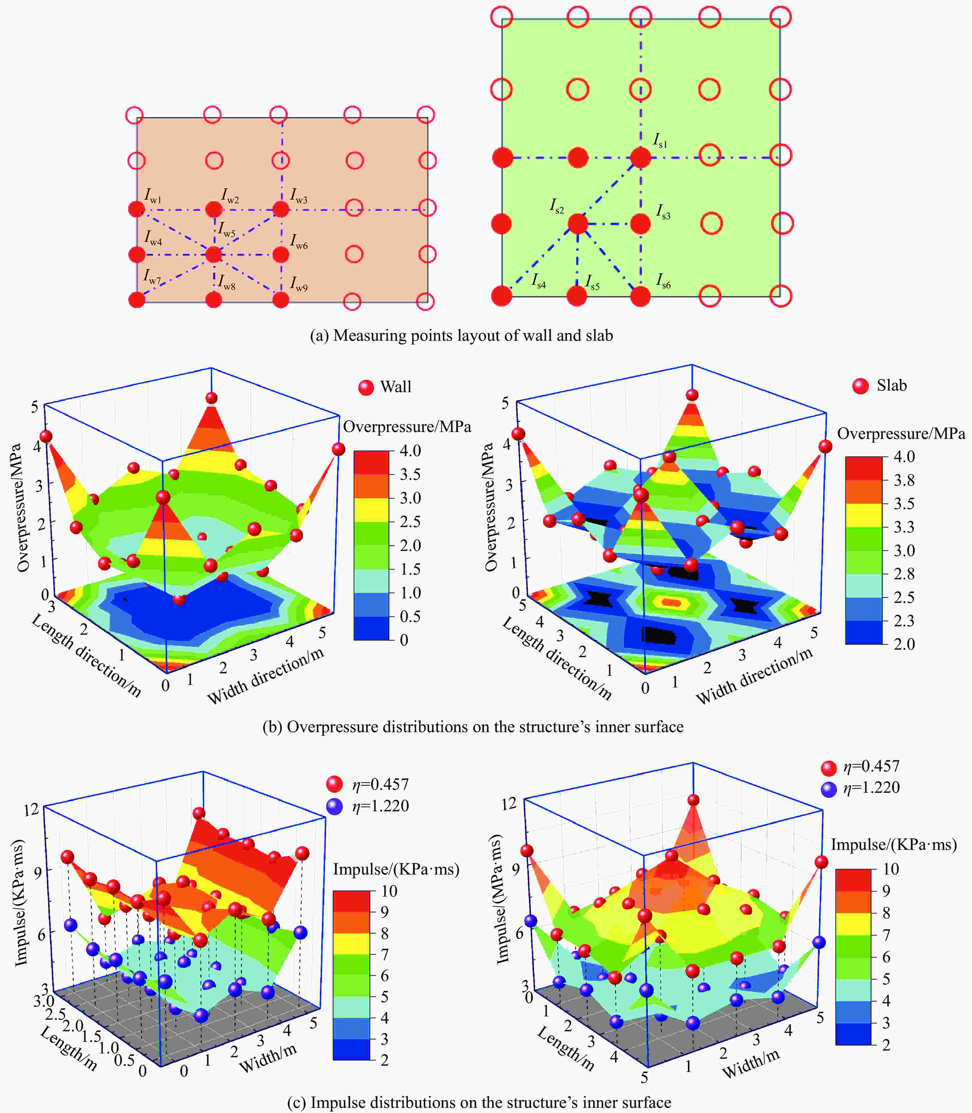 工况 泄爆面积/m2 泄爆系数 TNT当量/kg 工况 泄爆面积/m2 泄爆系数 TNT当量/kg 1 1.89 0.457 2.3 7 4.14 1.002 2.3 2 1.89 0.457 4.5 8 4.14 1.002 4.5 3 1.89 0.457 9.0 9 4.14 1.002 9.0 4 3.24 0.784 2.3 10 5.04 1.220 2.3 5 3.24 0.784 4.5 11 5.04 1.220 4.5 6 3.24 0.784 9.0 12 5.04 1.220 9.0 表 4 自由场爆炸作用于墙体和顶板的反射超压冲量