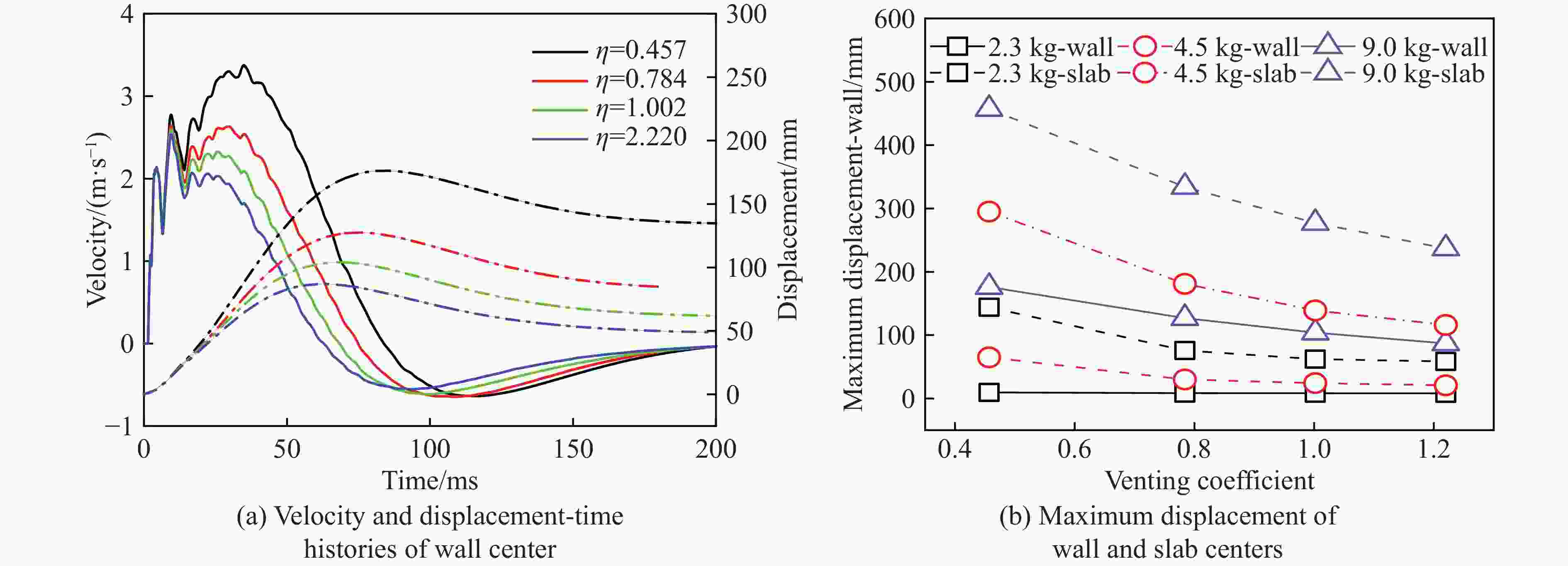 TNT当量/kg I1-wall/(kPa·s) I2-wall/(kPa·s) I3-wall/(kPa·s) I4-wall/(kPa·s) 墙体/(kPa·s·m2) 2.3 0.33 0.66 0.49 0.28 6.78 4.5 0.59 1.01 0.81 0.52 11.19 9.0 1.00 1.40 1.25 0.91 17.19 TNT当量/kg I1-slab/(kPa·s) I2-slab/(kPa·s) I3-slab/(kPa·s) I4-slab/(kPa·s) 顶板/(kPa·s·m2) 2.3 0.45 0.91 0.45 0.17 7.69 4.5 0.60 1.11 0.60 0.33 10.94 9.0 0.97 1.38 0.97 0.61 14.86 表 5 自由场爆炸作用下结构墙板中心点最大位移