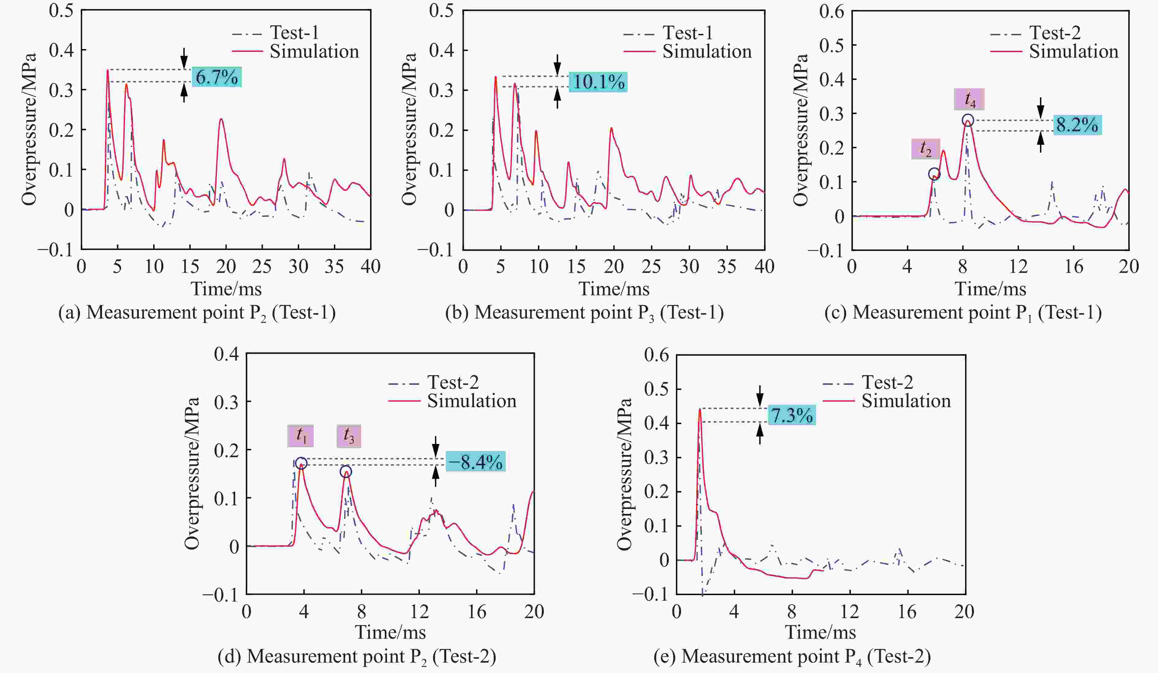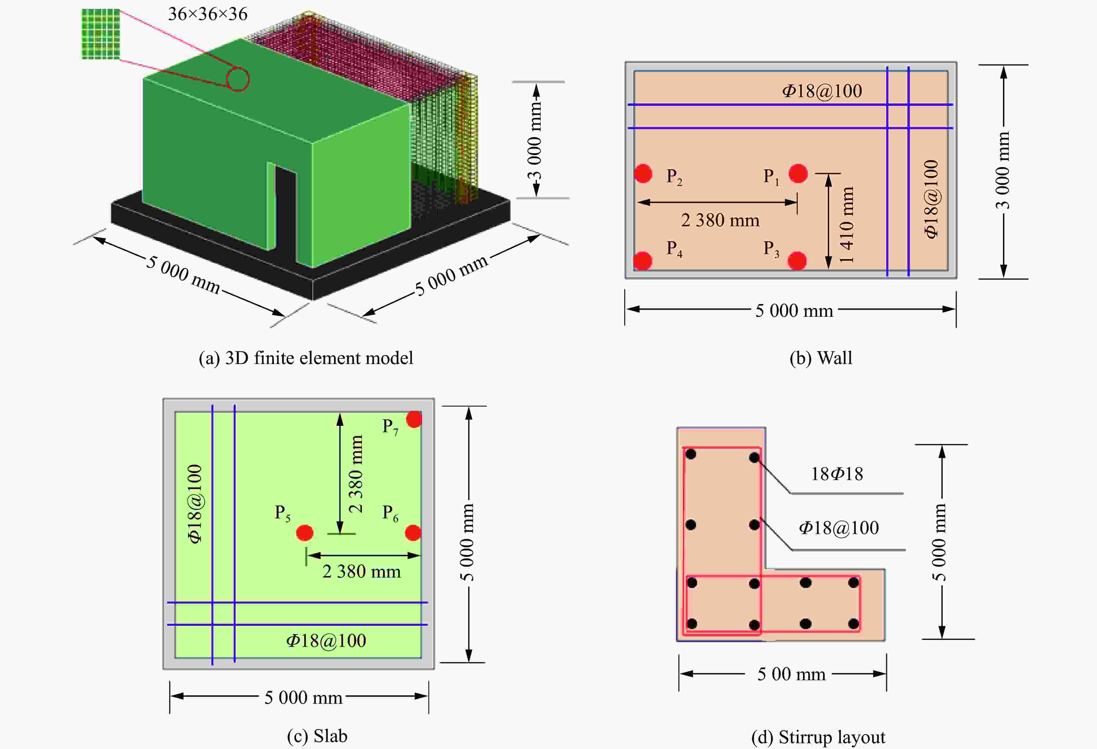 摘要: 爆炸冲击波在钢筋混凝土(reinforced concrete,RC)箱型结构中难以向外自由扩散,经多次反射叠加后可加剧结构的破坏程度。为全面探究RC箱型结构内爆炸载荷特性及其动力行为特征,通过复现完全密闭和半密闭(带泄爆口)RC箱型结构的内爆炸试验,验证了所采用有限元建模与分析方法的适用性。进一步,针对典型RC箱型结构和美国联邦应急管理署(FEMA)规定的恐怖爆炸袭击类型,开展了3种爆炸威胁和4种泄爆面积下的内爆炸数值模拟分析,考察了结构内壁面中心和内角隅处载荷及其分布以及结构动力行为特征。结果表明:泄爆面积对各特征点爆炸波峰值超压影响较小,而爆炸波冲量随泄爆面积增加近似指数型降低;结构内壁面载荷分布受结构尺寸的显著影响,呈“内凹”或“W”型;泄爆系数从0.457增大至1.220时,墙板最大位移可降低50%以上;相较于超压准则,冲量准则可以更加准确地评估构件毁伤等级。最后,提出了考虑泄爆面积的冲量增强因子和毁伤增强因子计算方法,能够较好地预测不同泄爆系数下的内爆炸载荷和结构动力行为。Abstract: In a reinforced concrete (RC) box structure, the dissipation of blast waves is restricted, and damage to the structure can be intensified due to multiple reflections. To thoroughly investigate the load characteristics and dynamic behavior of internal explosions in an RC box structure, the applicability of the finite element method was verified by replicating internal explosion tests on fully enclosed and semi-enclosed (with venting openings) RC box structures. Based on this, numerical simulations of internal explosions were conducted for the prototypical RC box structure and the type of terrorist bombing attacks specified by the Federal Emergency Management Agency (FEMA) under three explosion scenarios and four venting areas. The influence of venting area on the load characteristics at the inner surfaces and corners, the load distribution on the inner surfaces, and the time histories of displacement and velocity at the centers of the inner surfaces under internal explosion loads were explored. Additionally, a formula for calculating the total impulse of the structure’s inner surface was proposed, considering both the venting area and the spatial distribution of the impulse. The results show that the venting area has a negligible effect on the overpressure, while the impulse decreases exponentially with increasing venting area. The load distribution characteristics on the structure’s inner surface are significantly influenced by the structural dimensions, exhibiting an “indented” or “W” pattern. The maximum displacement at the centers of walls and slabs is reduced by about 50% as the venting coefficient changes from 0.457 to 1.220. Finally, based on the total impulse and maximum displacement response of each component under free-field explosion loads, a calculation method for the impulse and damage enhancement coefficient was proposed based on the venting area, effectively predicting the internal explosion load and the structure’s dynamic behavior at various venting coefficients.