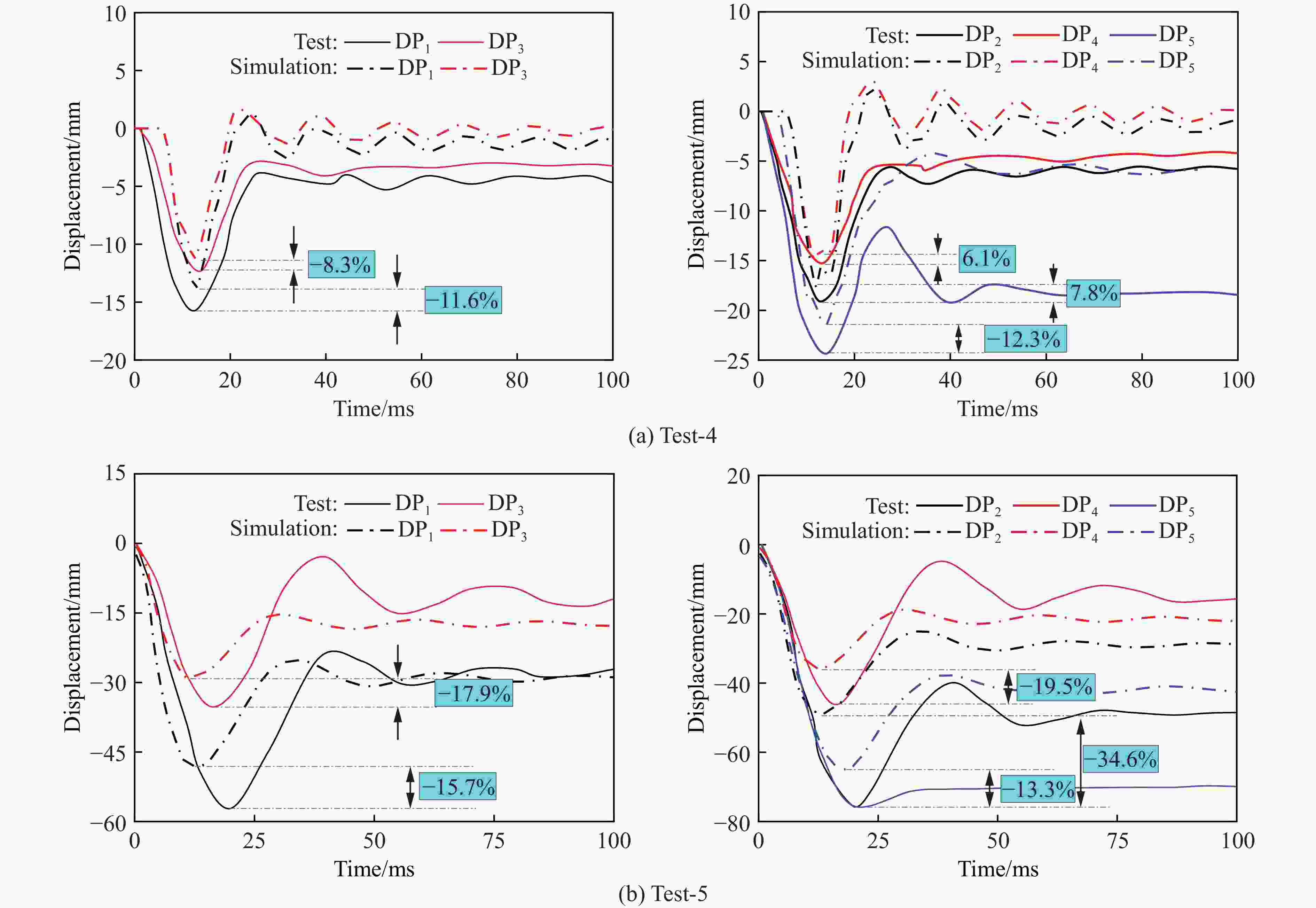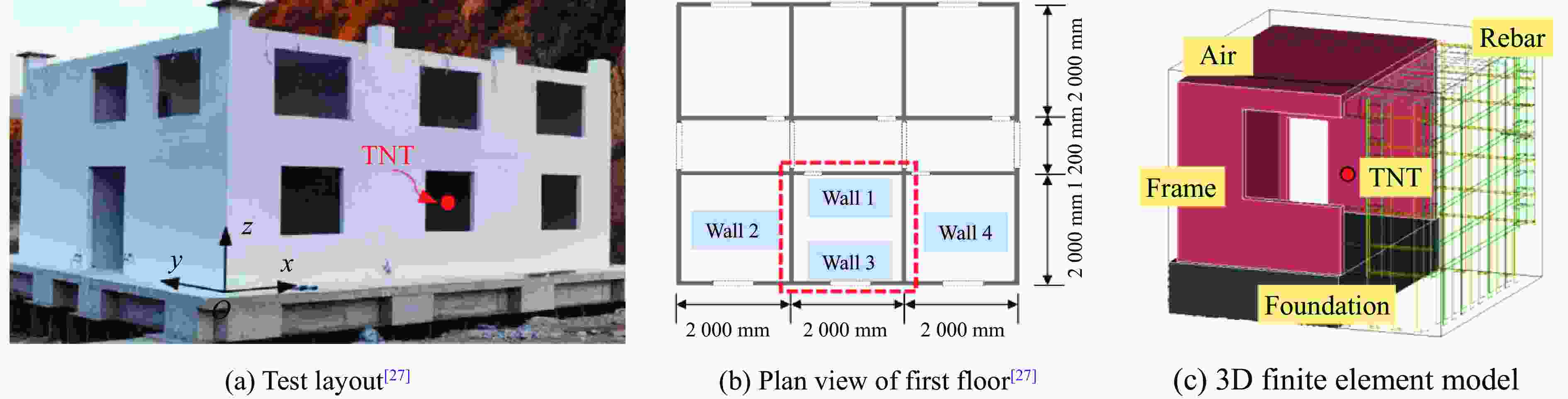 试验 工况 TNT当量/g 2D模型 3D模型 炸药尺寸/mm 空气网格尺寸/mm 等效炸药网格密度 空气网格/mm 结构网格/mm 杨亚东等[22] Test-1 720 76.2×76.2 12×12 255.8 72×72×72 36×36×36 Test-2 315 57.8×57.8 9.1×9.1 255.8 72×72×72 36×36×36 Guo等[27] Test-3 95.3 38.8×38.8 6.1×6.1 255.8 24×24×24 12×12×12 Test-4 253 53.8×53.8 8.5×8.5 255.8 24×24×24 12×12×12 Test-5 400 62.9×62.9 10×10 255.8 24×24×24 12×12×12 混凝土结构(*MAT_CONCRETE_DAMAGE_REL3) ρ/(kg·m−3) 抗压强度/MPa 最大失效主应变 2 400 30.0/40.0 0.3 钢筋(*MAT_PLASTIC_KINMATIC) 类型 直径/mm 弹性模量/GPa 泊松比 屈服强度/MPa 拉伸强度/MPa 最大伸长率/% D4 4 208 0.3 581 640 3.43 D6 6 205 0.3 486 670 8.87 D8 8 204 0.3 451 676 11.56 炸药(*MAT_HIGH_ENERGY_BURN&EOS_JWL) ρ/(kg·m−3) D/(m·s−1) p/GPa A/GPa B/GPa R1 R2 $ \omega $ E0/(J·m−3) 1 630 6 930 21 370 3.747 4.15 0.9 0.35 7×109 空气(*MAT_NULL&*EOS_LINEAR_POLYNOMIAL) ρ/(kg·m−3) E/(J·m−3) γ0 pc/MPa C0 C1 C2 C3 C6 C4 C5 1.29 2.5×105 0 −0.1 0 0 0 0 0 0.4 0.4 表 3 爆炸工况设计