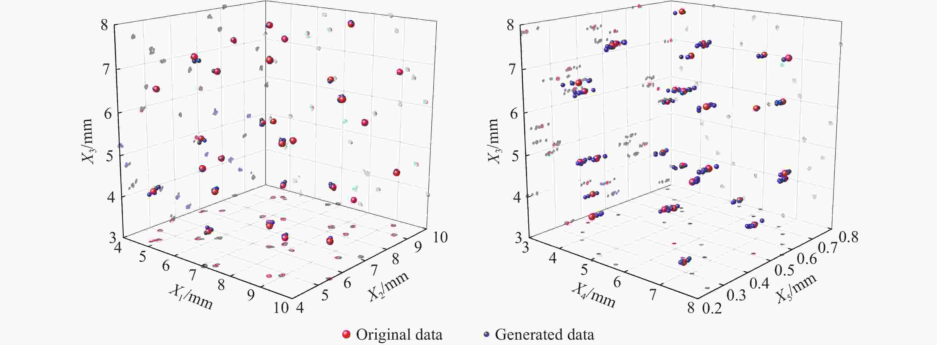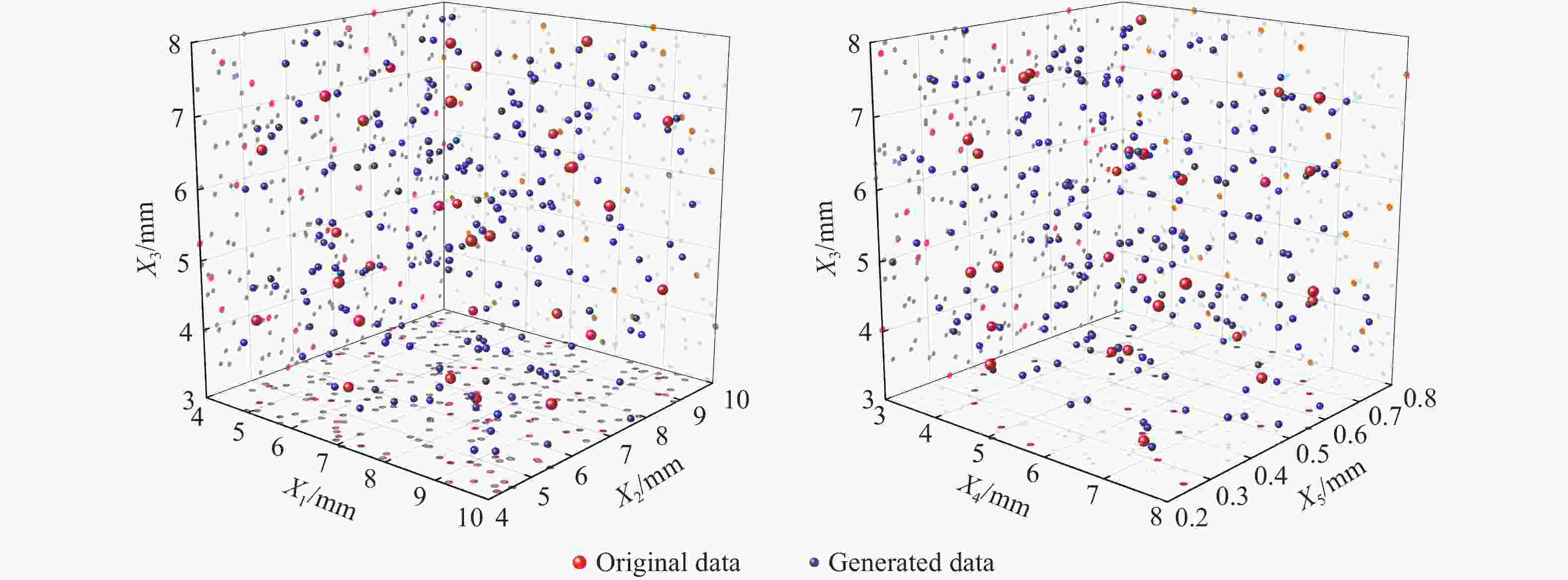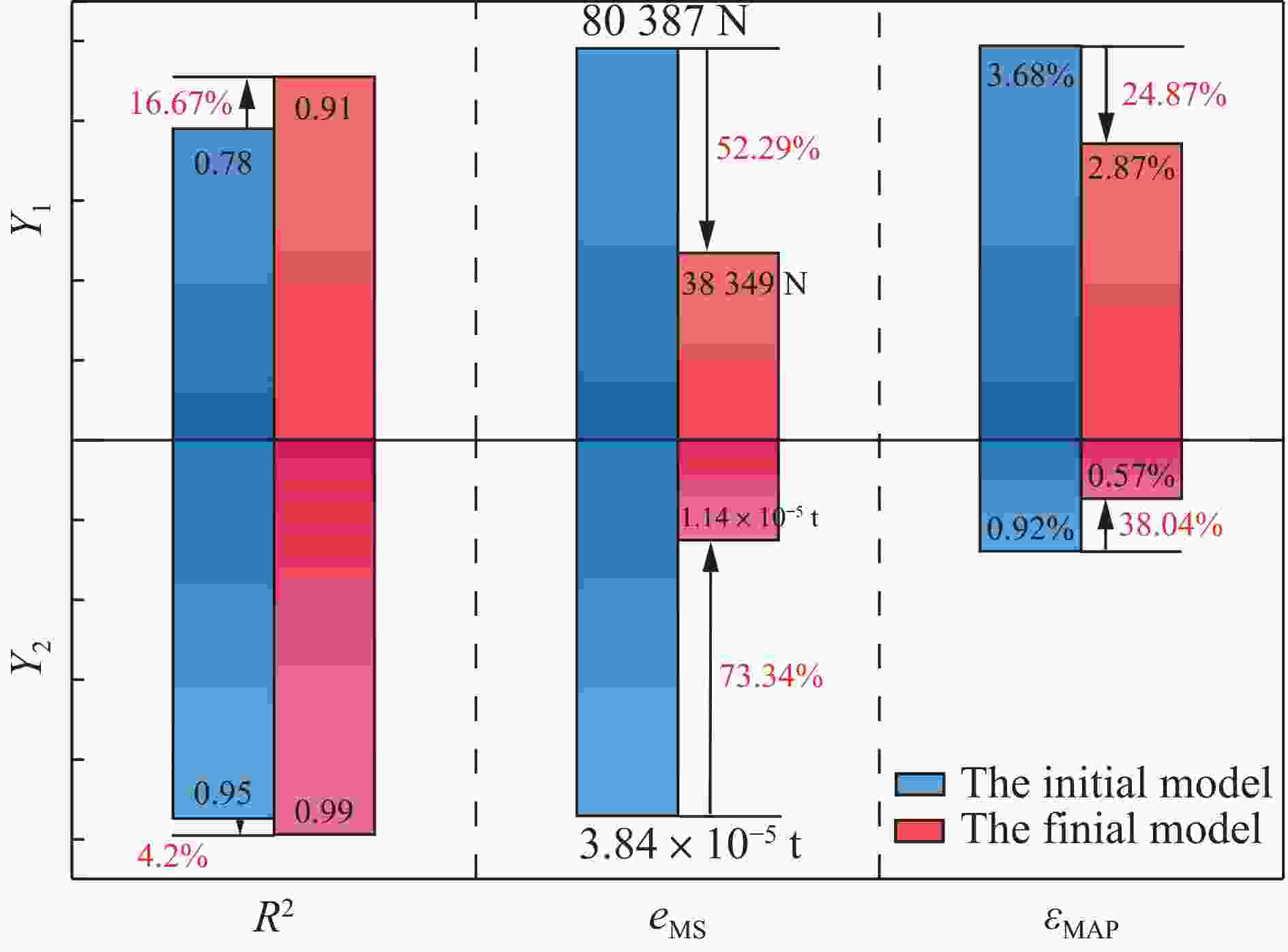 模型 X1/mm X2/mm X3/mm X4/mm X5/mm $ {Y}_{1} $/N $ {Y}_{2} $/t 初始模型 9.7 8.0 5.7 5.6 0.60 4574.1 0.595 最终模型 9.9 7.7 5.6 5.1 0.57 4438.0 0.593 表 6 初始模型和最终模型预测结果与仿真计算结果的对比