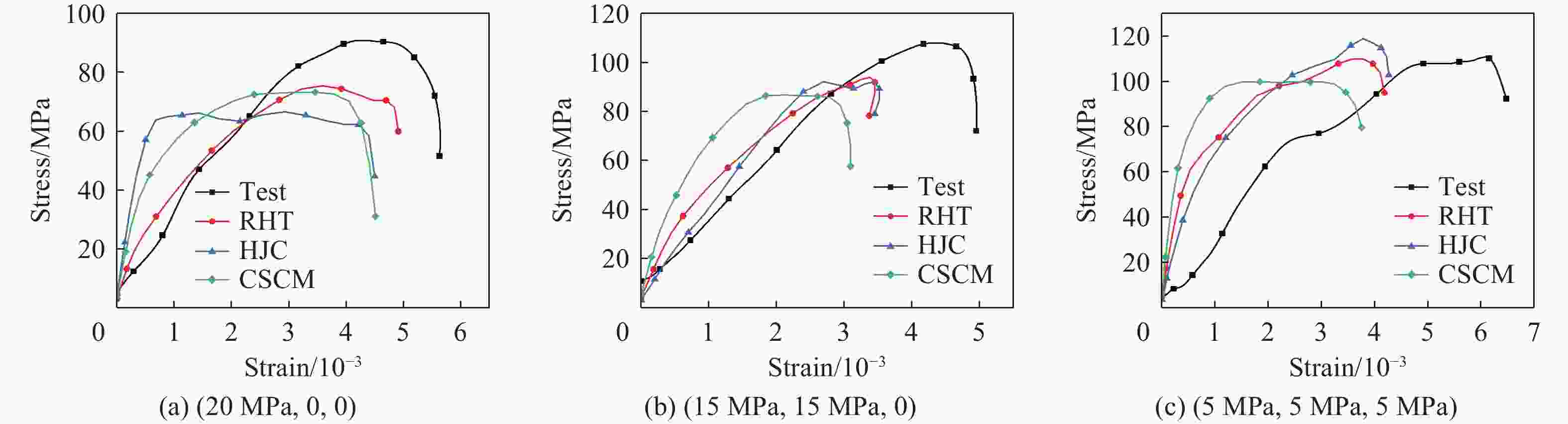 ρ0/(kg·m−3) AH BH CH NH fc/MPa pcrush/MPa 2400 0.456 0.119 0.0173 1.795 39.67 13.22 plock/MPa μcrush μlock D1 D2 Smax $ {\varepsilon}_{\text{min}} $ 810 0.0022 0.0101 0.04 1 7 0.01 T/MPa G/GPa K1/GPa K2/GPa K3/GPa $ {\dot{\varepsilon}}_{\text{0}} $/s−1 4.5 2.69 18.56 25.29 94.12 1 表 5 CSCM本构模型参数