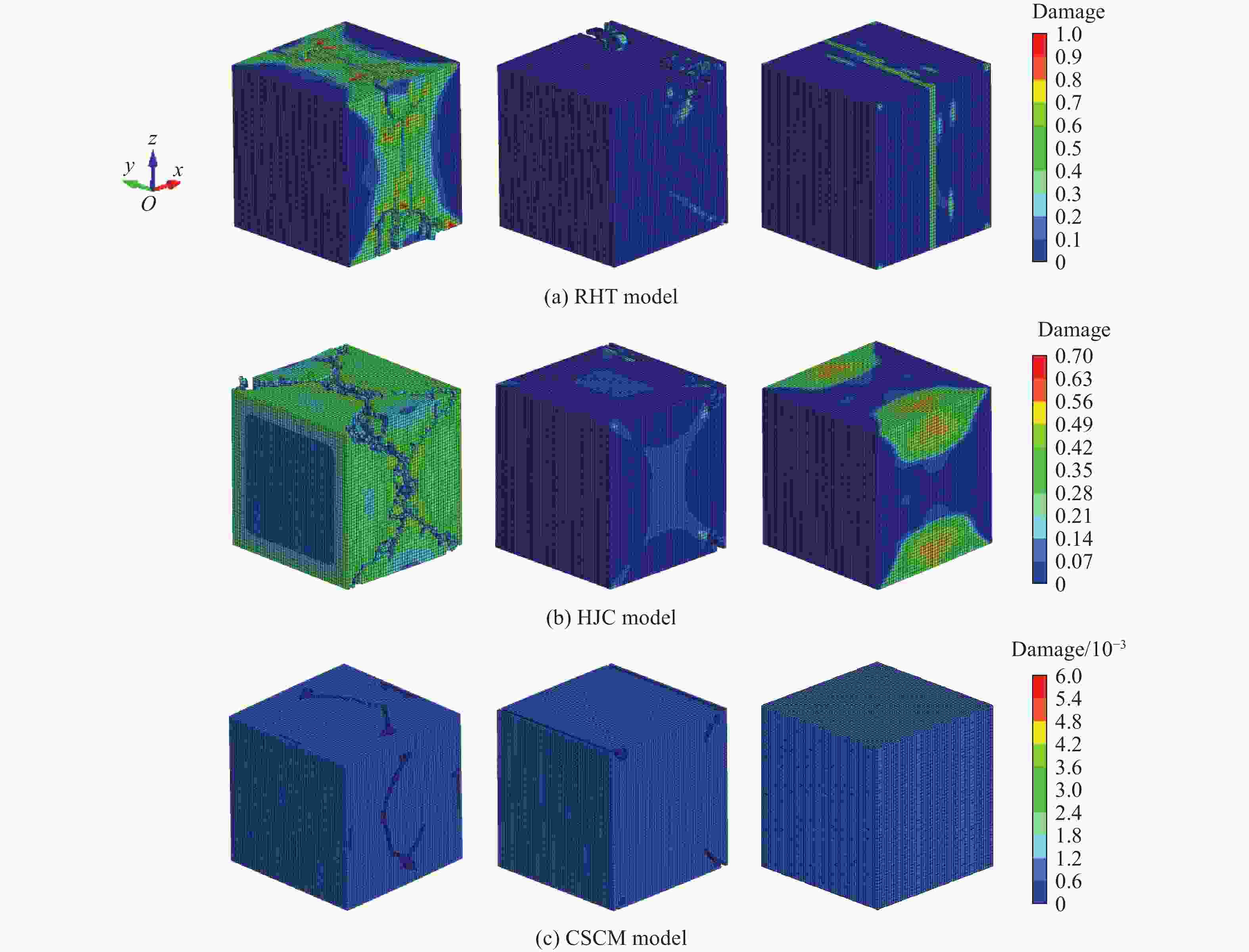 方法 入射能/J 反射能/J 透射能/J 吸收能/J 比吸能/(J·cm−3) 实验 143.128 51.792 54.606 36.730 0.29 RHT本构模型 131.462 41.347 31.613 58.502 0.47 HJC本构模型 131.457 35.718 34.323 61.416 0.49 CSCM本构模型 131.466 34.732 35.753 60.981 0.49 -