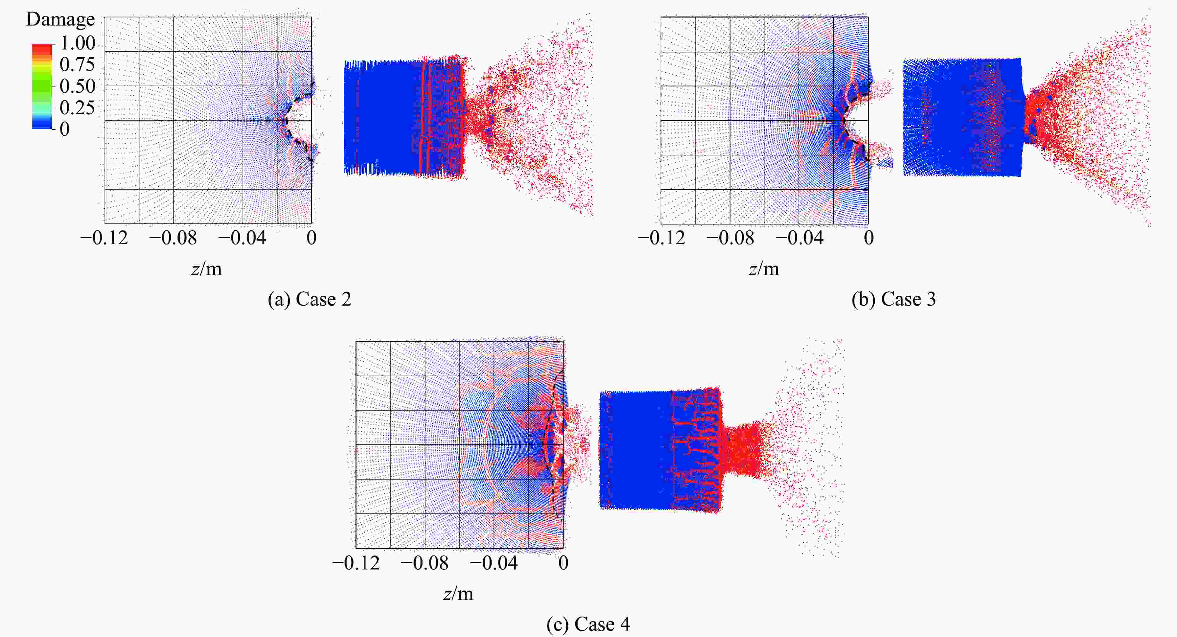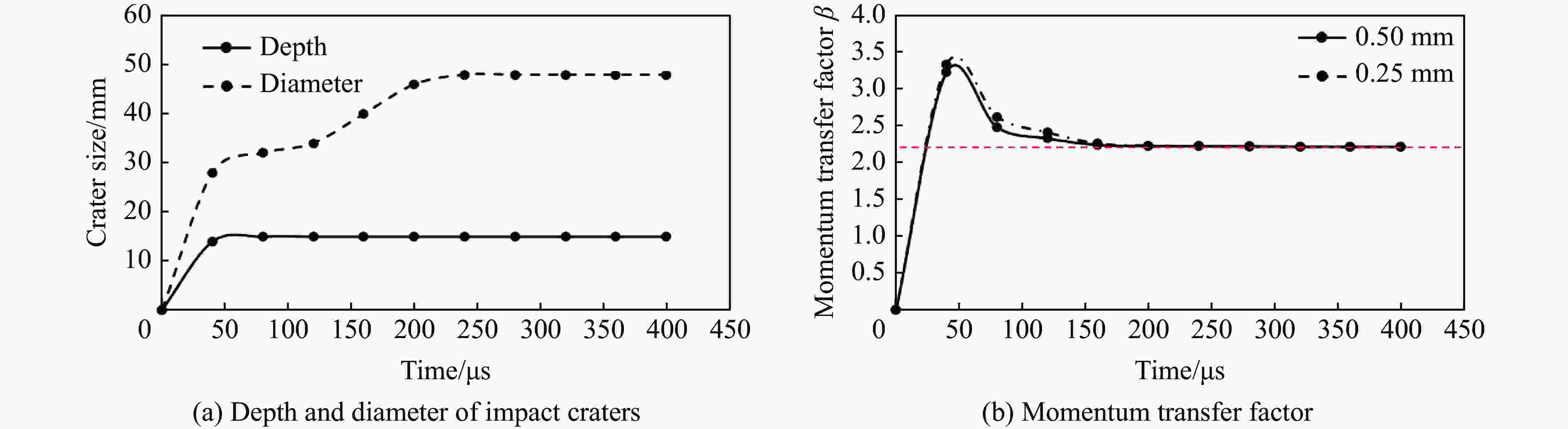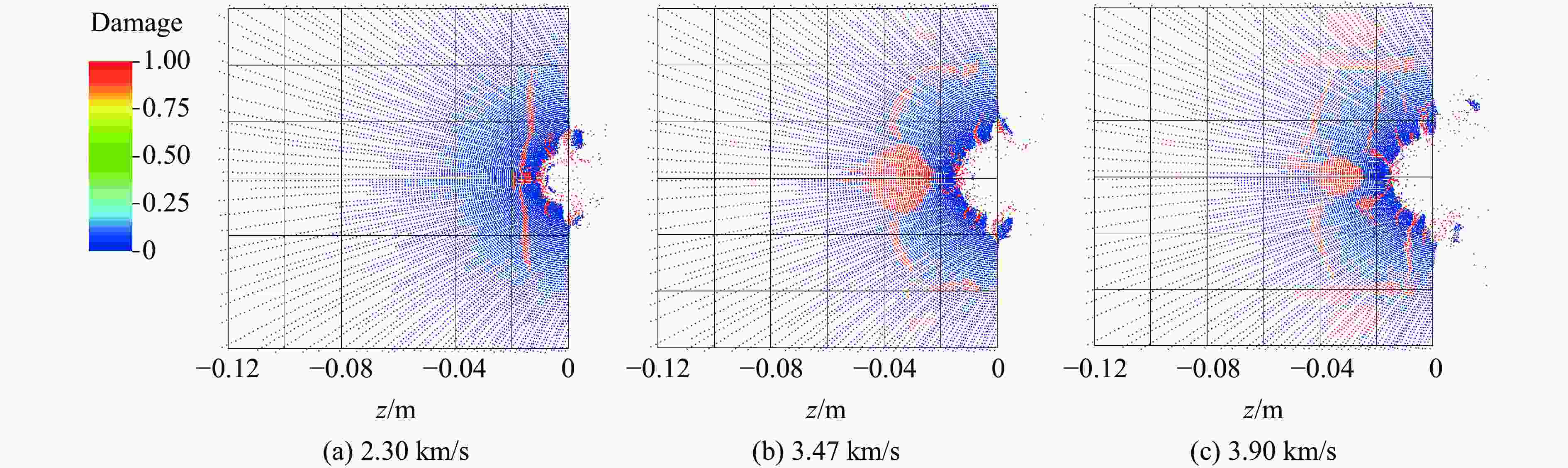 工况 强度模型 Y0/MPa 损伤模型 σb/MPa 坑直径/mm 坑深度/mm β 1 Lundborg 26.5 Benz-Asphaug概率 9.62 48 15 2.19 2 恒定强度 66.0 Benz-Asphaug概率 9.85 38 16 2.20 3 Lundborg 26.5 最大拉应力 33.0 50 15 2.20 4 Drucker-Prager 146.0 最大拉应力 50.0 84 12 2.22 表 5 不同极限强度下的仿真结果