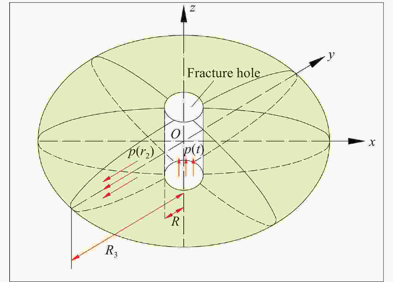 摘要: 超临界CO2相变破岩是冲击波与高压气体协同作用下的动态破坏过程。为深入探究多孔同步激发与地应力耦合条件下的超临界CO2相变破岩机制,针对CO2现场破岩实际工况,基于薄壁圆筒理论解析了单孔初始破岩压力,结合一维爆生气体膨胀理论,构建了地应力作用下多孔冲击波与高压气体联合破岩半径预测模型,并通过现场多孔CO2相变破岩试验进行了对比验证。结果表明:当致裂管埋深较浅时,地应力对岩体应力分布的影响较微弱;当单孔压力一致时,致裂孔数量越多,各孔的叠加峰值应力越大;在垂直于测试孔布置方向,各孔的峰值应力均呈U形抛物线分布,两端的致裂孔的叠加应力最大;而在平行于测试孔布置方向,各孔的峰值应力均呈倒U形抛物线分布,中部致裂孔的叠加应力最大。此外,利用声波测试得到的现场多孔冲击下岩体损伤破坏范围呈三维漏斗状,竖向损伤破坏范围在5.05~5.73 m之间,平面损伤破坏范围在4.3~5.6 m之间,其中平面损伤破坏范围测试值与理论计算值的相对误差在5.0%~18.7%之间,计算误差多来自各致裂孔叠加应力的不均匀性。进一步分析可知:超临界CO2相变破岩半径随致裂孔叠加应力呈半抛物线式增长,随致裂孔深度呈对数式增长;当岩体抗压强度增大时,岩石断裂韧度近线性增长,对应破岩半径近线性下降。研究成果可为多孔超临界CO2相变破岩工程参数优化提供定量化设计依据。Abstract: Supercritical CO2 phase transition rock-breaking is a dynamic destruction process under the combined action of shock waves and high-pressure gas. To deeply investigate the rock-breaking mechanisms of supercritical CO2 phase transition under multi-hole synchronous initiation and in-situ stress coupling conditions, targeting the actual working conditions of CO2 field rock-breaking, the initial rock-breaking pressure of a single hole was analyzed based on the thin-walled cylinder theory. A predictive model for the joint rock-breaking radius of multi-hole shock waves and high-pressure gas under in-situ stress was developed by integrating the one-dimensional detonation gas expansion theory. Field experiments on multi-hole CO2 phase transition rock-breaking were subsequently conducted for comparative validation. The results show that when the fracturing pipe is buried shallowly, the influence of in-situ stress on the stress distribution of the rock mass is relatively weak. When the pressure of a single hole is consistent, the more fracturing holes there are, the greater the superposed peak stress of each hole. In the direction perpendicular to the layout of the test hole, the peak stress of each hole shows a U-shaped parabolic distribution. The superposed stress of the fracturing holes at both ends is the largest. In the direction parallel to the layout of the test hole, the peak stress of each hole shows an inverted U-shaped parabolic distribution, and the superposed stress of the middle fracturing hole is the largest. In addition, the rock mass damage and fracture range under multi-pore impact obtained by acoustic wave testing in the field is in the shape of a three-dimensional funnel. The vertical damage and fracture range is between 5.05 and 5.73 m, and the planar damage and fracture range is between 4.3 and 5.6 m. The error between the measured value of the planar damage and fracture range and the theoretically calculated value is between 5.0% and 18.7%. The calculation error mainly comes from the uneven superposition stress of each fracturing hole. Further analysis shows that the radius of supercritical CO2 phase transition rock-breaking increases semi-parabolically with the superposed stress of the fracturing hole and increases logarithmically with the depth of the fracturing hole. As the compressive strength of the rock mass increases, the rock fracture toughness increases nearly linearly, and the corresponding rock-breaking radius decreases nearly linearly. The research results can provide a quantitative design basis for optimizing engineering parameters in the multi-pore supercritical CO2 phase transition for rock-breaking.
