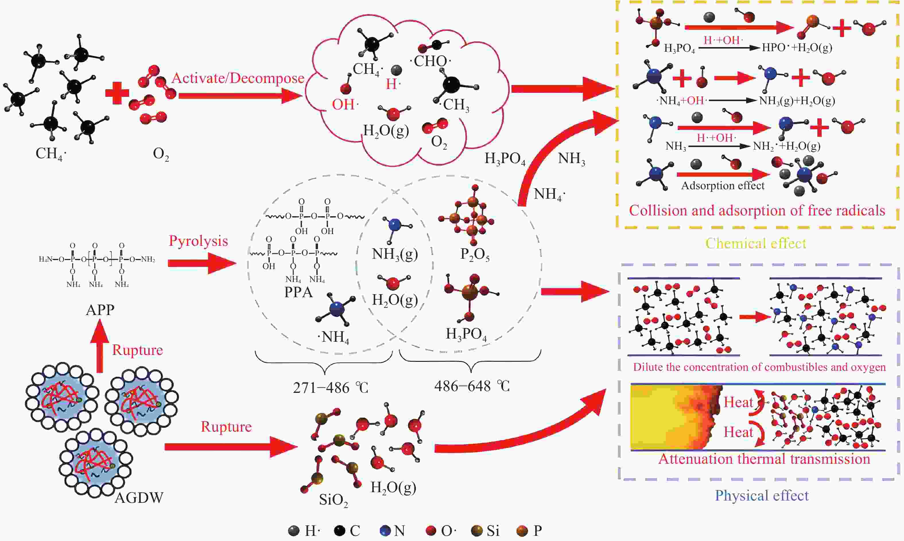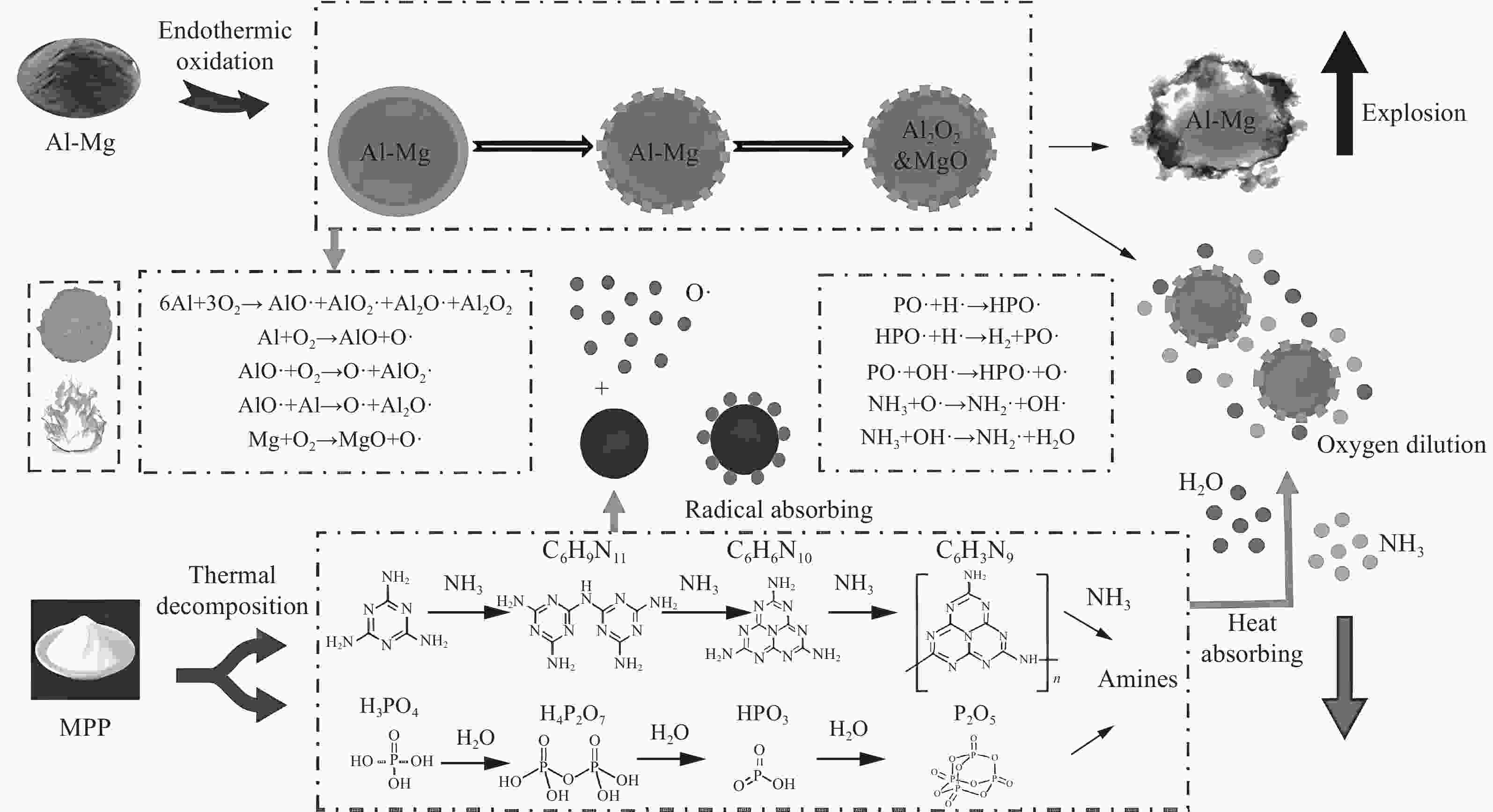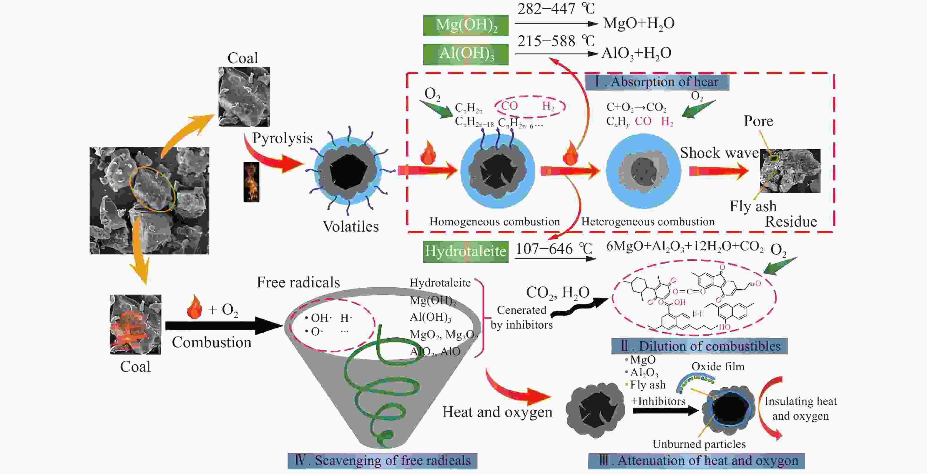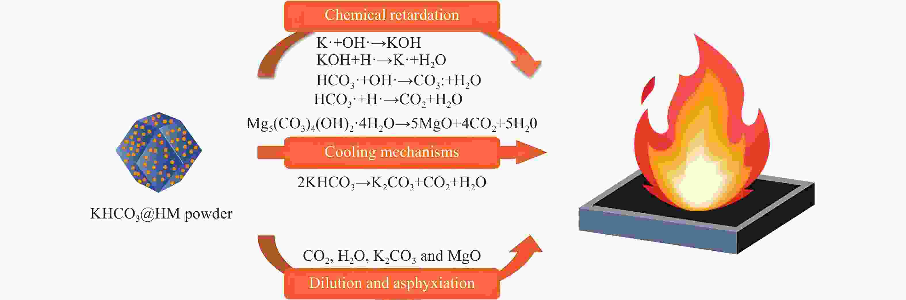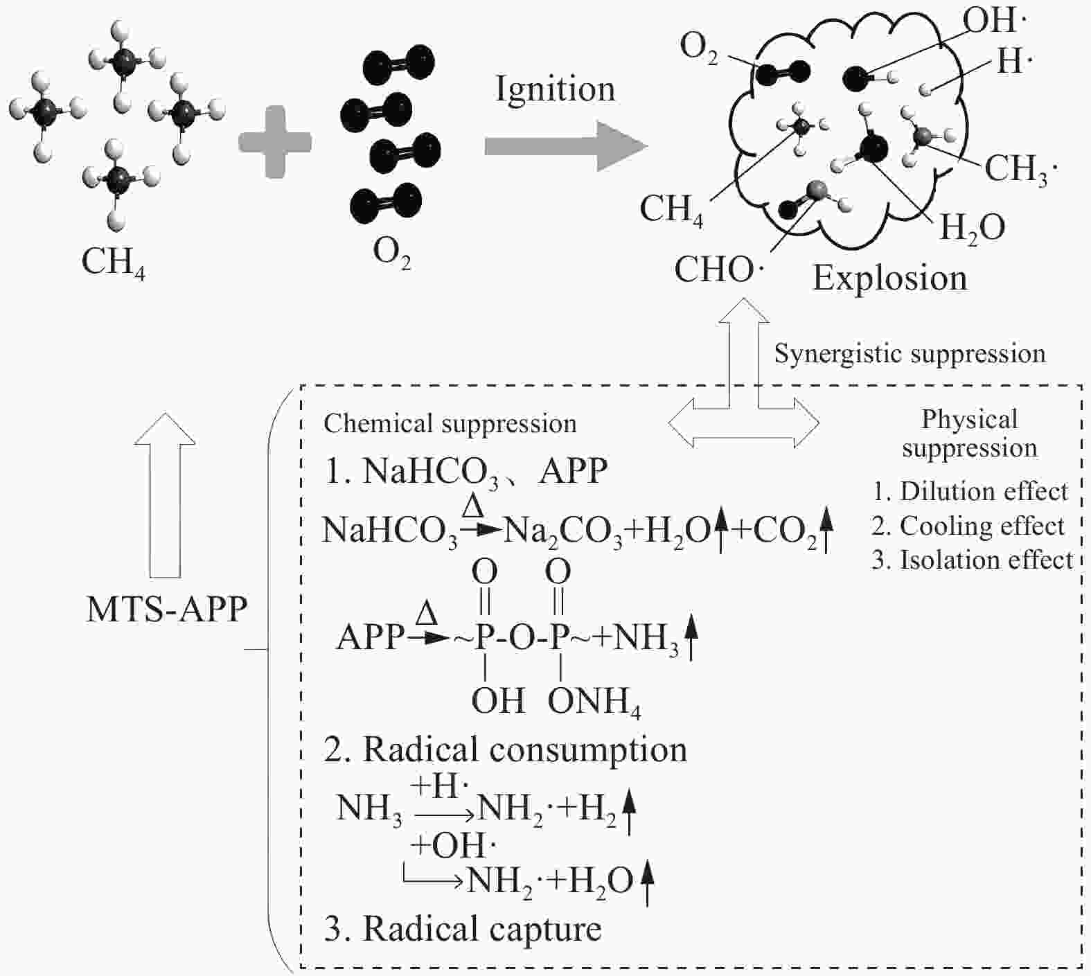 抑制剂 编号 反应 ΔE/(kcal·mol−1) ΔH/(kcal·mol−1) 抑制剂 编号 反应 ΔE/(kcal·mol−1) ΔH/(kcal·mol−1) 蒙脱石 1 Al+3OH·→Al(OH)3 84.6 −289.4 NH4H2PO4 1 PO·+H·→HPO −27.6 2 Ca+2OH·→Ca(OH)2 −178.2 2 HPO+H·→H2+PO· 548.6 3 Mg+2OH·→Mg(OH)2 −151.6 3 NH3·+O2→H2NO+OH· 28.9 17.1 4 AlO+H·→Al+OH 37.1 4 NH3·+O2→NH2·+HO2 30.6 57.5 5 CaO+H·→Ca+OH 22.6 −98.4 5 NH3·+OH·→NH2+H2O −10.2 6 MgO+H·→Mg+OH 24.5 −124.6 KHCO3 1 2KHCO3→K2CO3+H2O+CO2 45.6 −12.3 7 AlO+O·→Al+O2 −179.4 2 K2CO3→K2O+CO2 19.9 48.3 8 CaO+O·→Ca+O2 −93.3 3 K2O+H2O→2KOH 21.6 −64.4 9 MgO+O·→Mg+O2 18.9 −88.9 4 K·+O2→KO2 32.4 −19.9 坡缕石 1 Al+3OH·→Al(OH)3 78.9 −290.2 5 K+OH→KOH −50.4 2 Ca+2OH·→Ca(OH)2 −178.8 6 K·+O·→KO· 50.2 −121.3 3 Mg+2OH·→Mg(OH)2 −152.1 7 KO·+H·→KOH 126.9 −95.0 4 AlO+H·→Al+OH 37.5 8 KO·+O·→KO2 28.3 −168.6 5 CaO+H·→Ca+OH 20.8 −98.8 9 KOH+H·→K·+H2O 39.6 −55.5 6 MgO+H·→Mg+OH 21.6 −124.9 10 KOH+OH·→KO·+H2O 78.9 −24.4 7 AlO+O·→Al+O2 −179.8 11 KOH+O·→KO·+OH· 66.7 −122.4 8 CaO+O·→Ca+O2 −93.9 9 MgO+O·→Mg+O2 16.8 −89.1 注:1 cal=4.184 J。 -