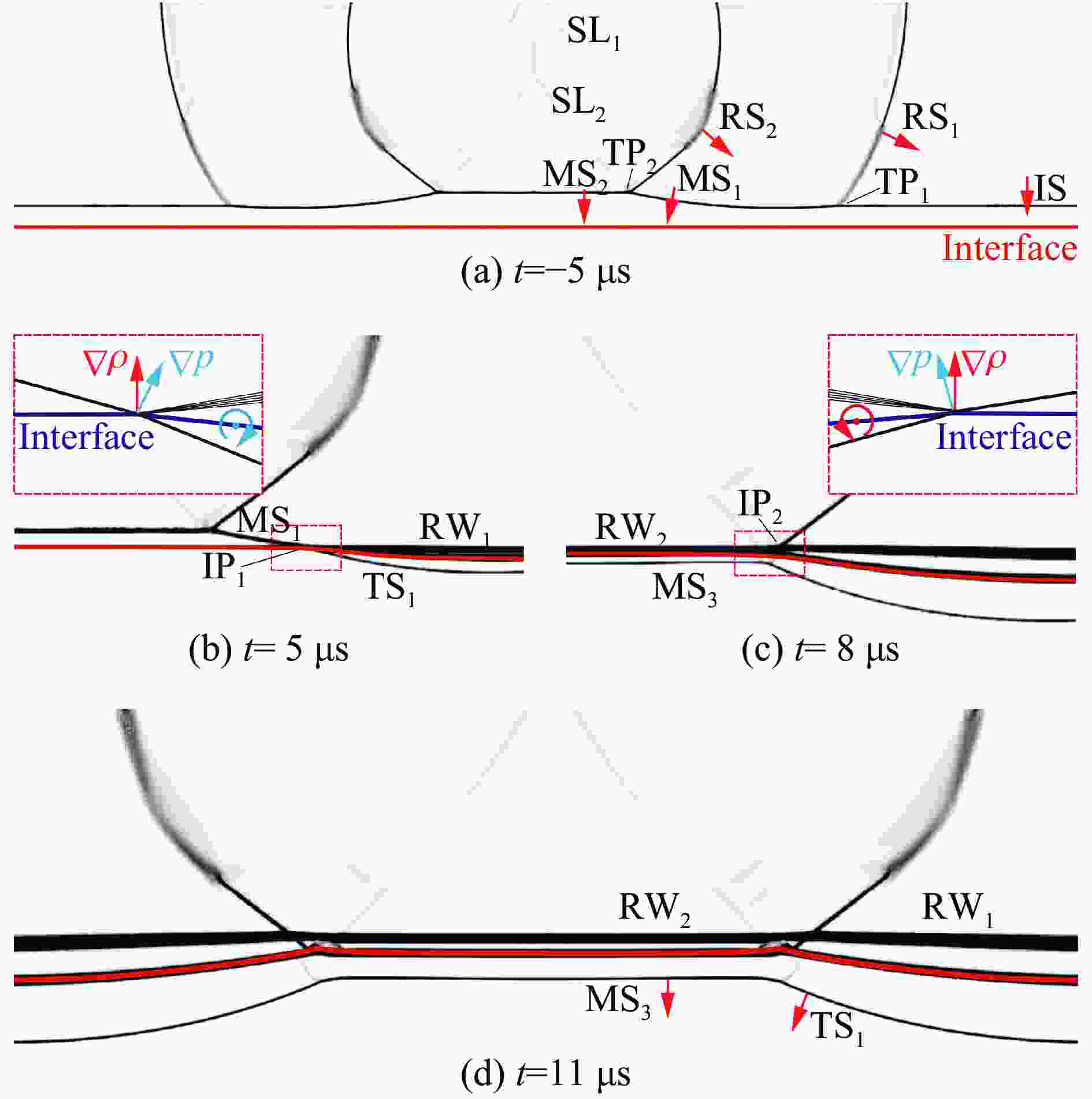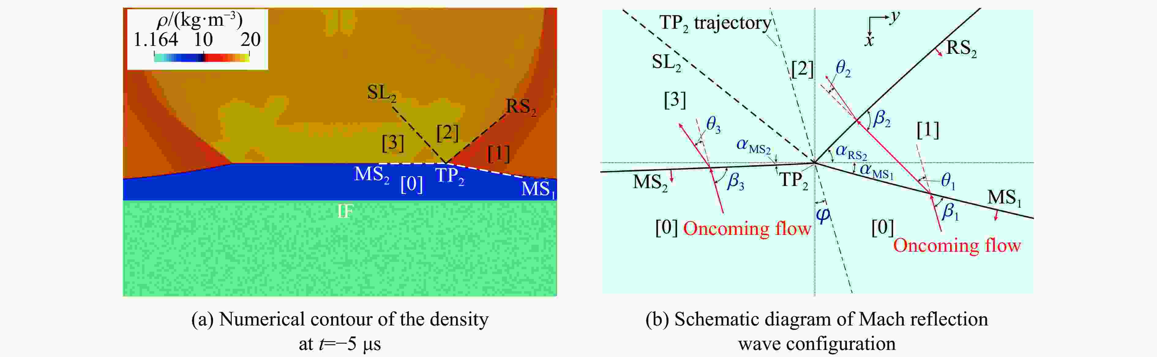 Abstract: The evolution of a planar heavy/light gas interface (SF6/N2) subjected to a perturbed shock wave produced by diffracting a planar incident shock over a rigid cylinder is investigated by numerical and theoretical analysis, particularly focusing on the incident impact stage of Mach reflection wave configuration. While the Mach number of incident planar shock wave is 1.8, numerical schlieren images of the Mach reflection wave over a rigid cylinder are provided, and the wave evolution during the incident impact on the heavy/light interface is quantitatively analyzed. Utilizing the three-shock theory, a theoretical solution describing the refraction process is derived, which accurately predicts the post-refraction shock wave shape, as well as the velocity perturbation and circulation deposition on the interface. Additionally, by drawing shock polar curves and rarefaction wave characteristic lines, the pressure changes and flow deflection across the wave configuration during the incident impact process are straightly described. Both the results of theoretical analysis and numerical simulation indicate that the differences in shock intensity and incident angles within the Mach reflection wave configuration lead to the velocity perturbation on the interface. And the tangential velocity caused by the shock impact results in circulation deposition on the interface. Velocity perturbation and circulation deposition dominate the early evolution of the heavy/light interface. -