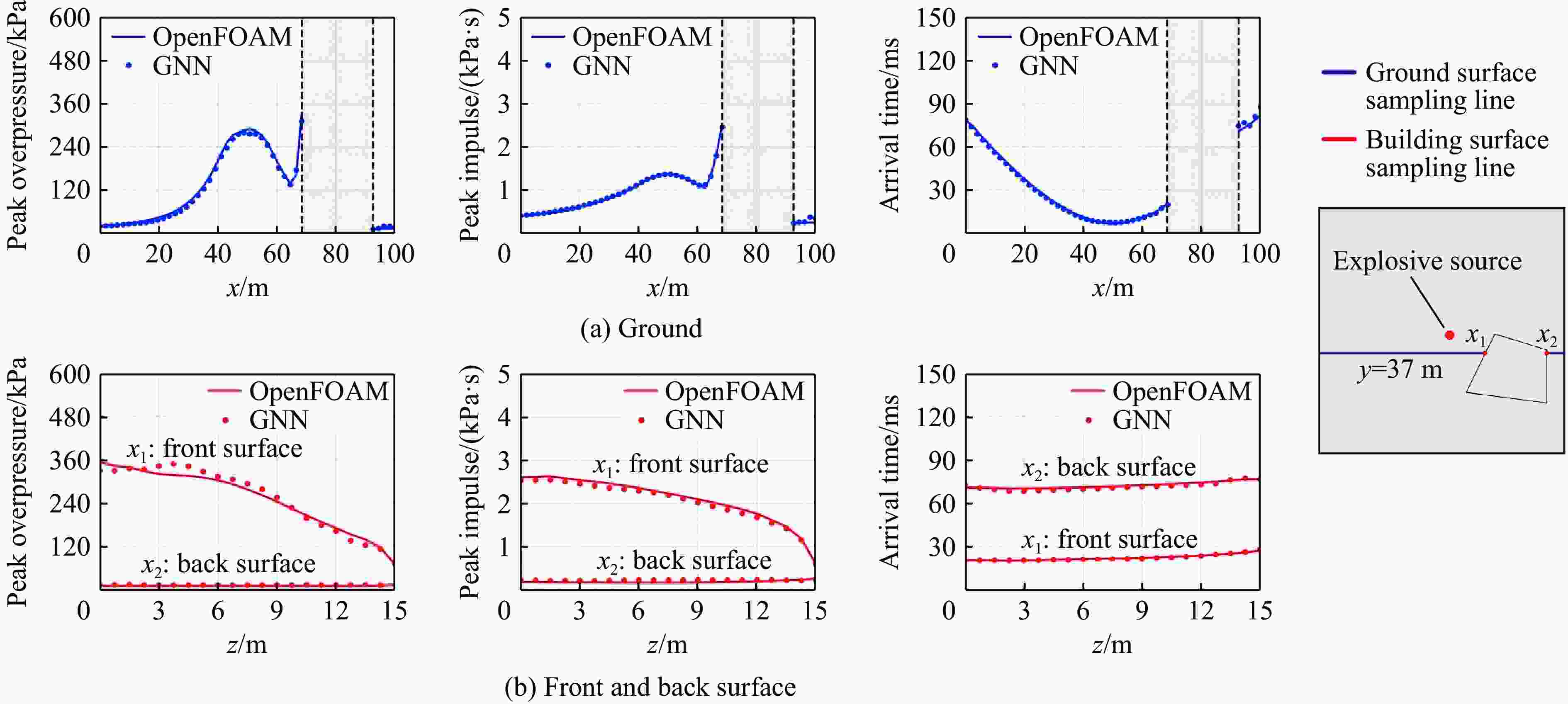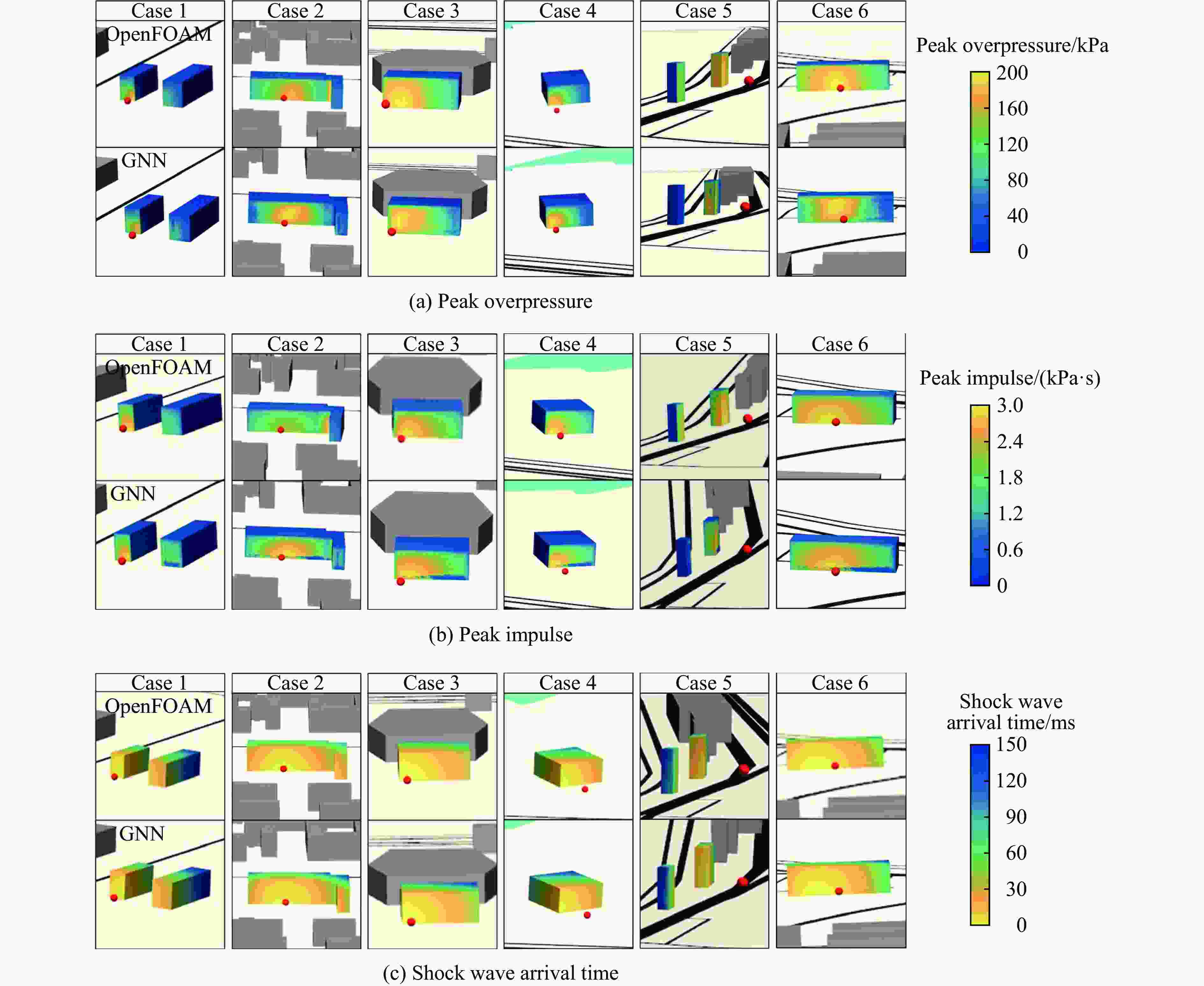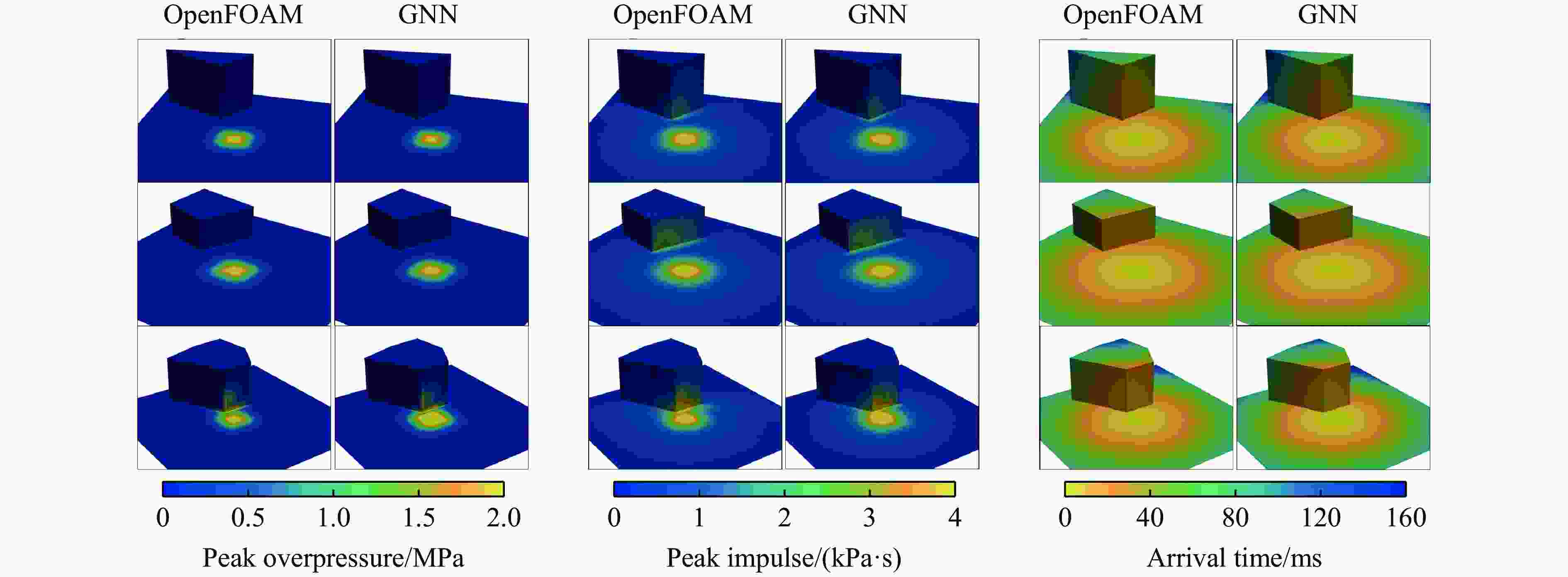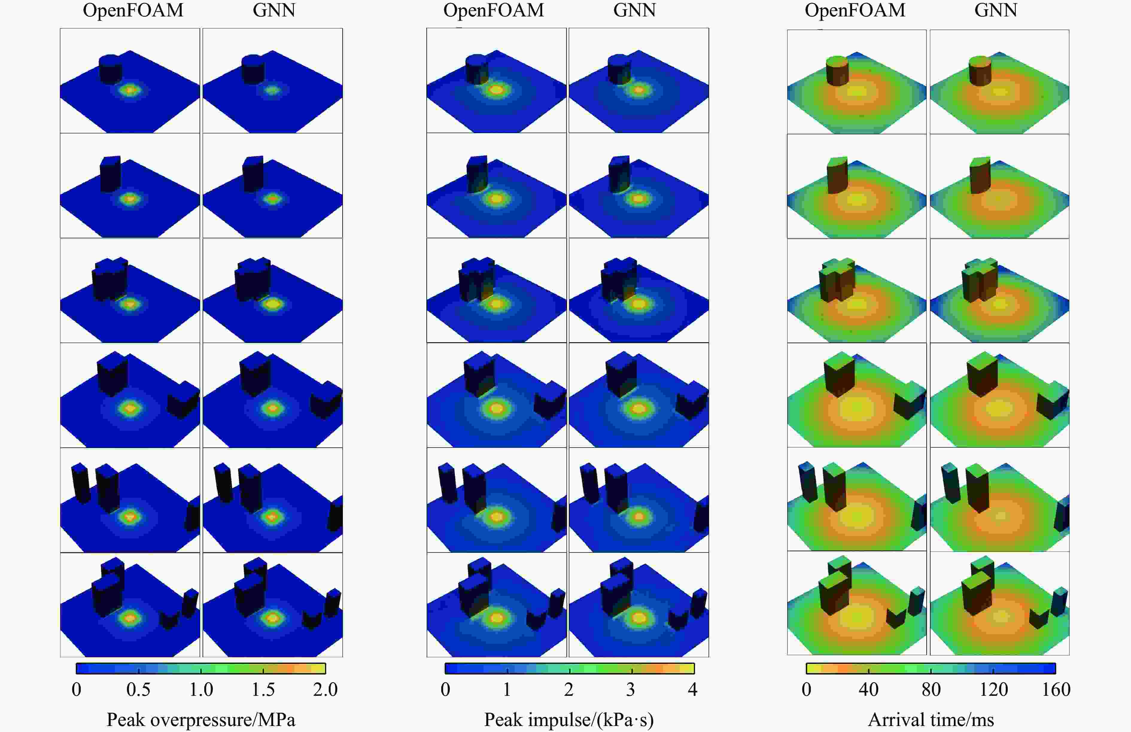 建筑类型 εRSE/% 计算时间/s 峰值超压 峰值冲量 到时 OpenFOAM GNN 复杂建筑—十二边形 1.15 2.34 0.85 991 0.15 复杂建筑—扇形 1.51 3.68 1.33 857 0.14 复杂建筑—十字形 1.16 6.69 2.74 984 0.35 建筑群落—2栋 1.95 8.16 2.04 991 0.27 建筑群落—3栋 1.67 7.57 3.07 1450 0.36 建筑群落—4栋 2.61 6.52 1.99 2045 0.51 表 3 城市区域爆炸事件GNN模型预测性能