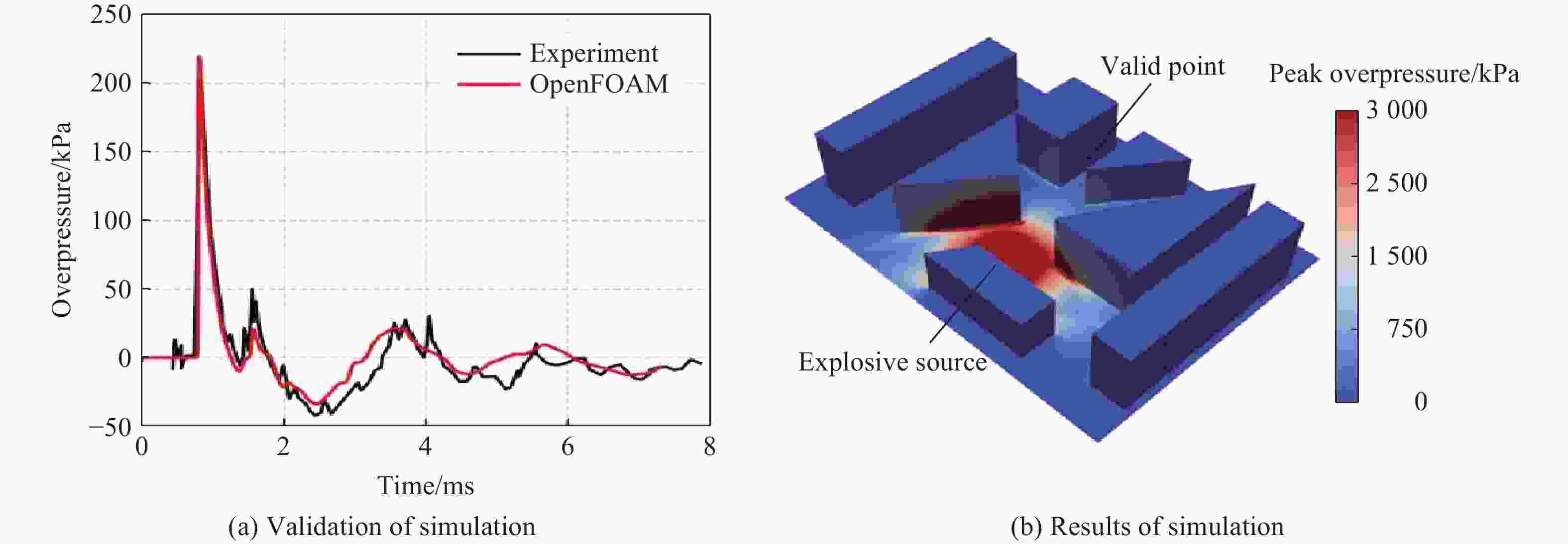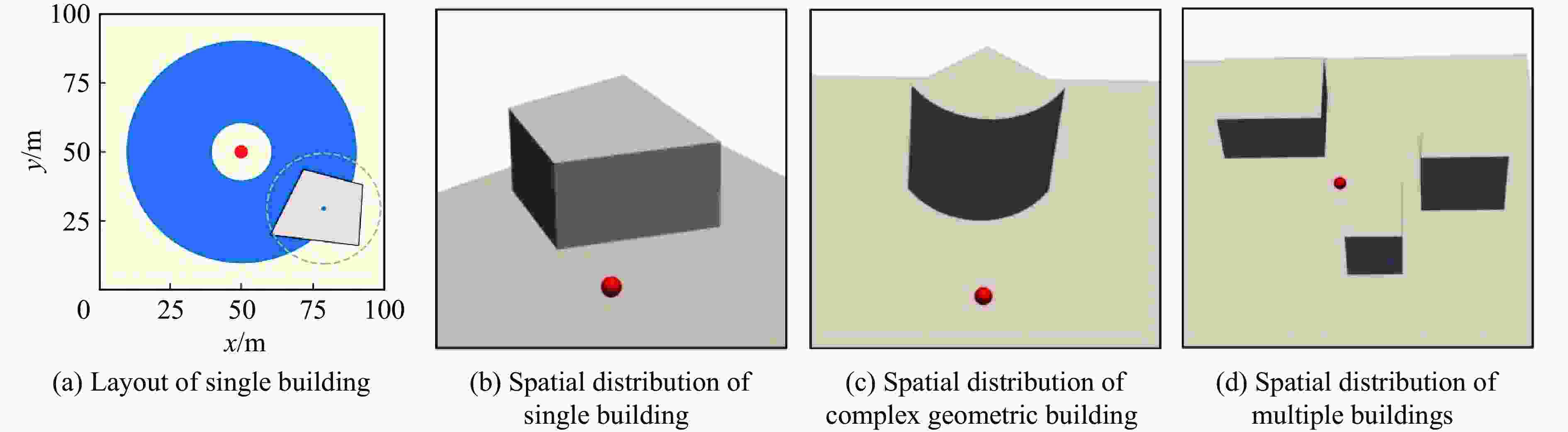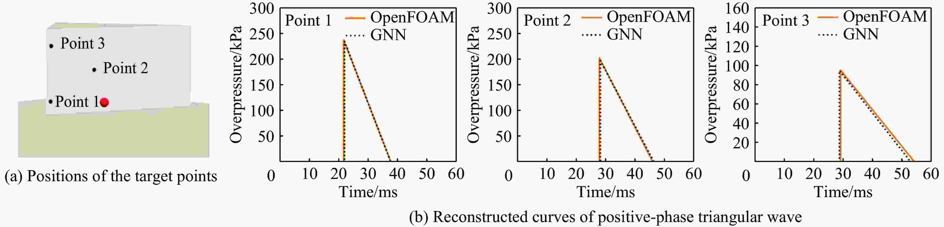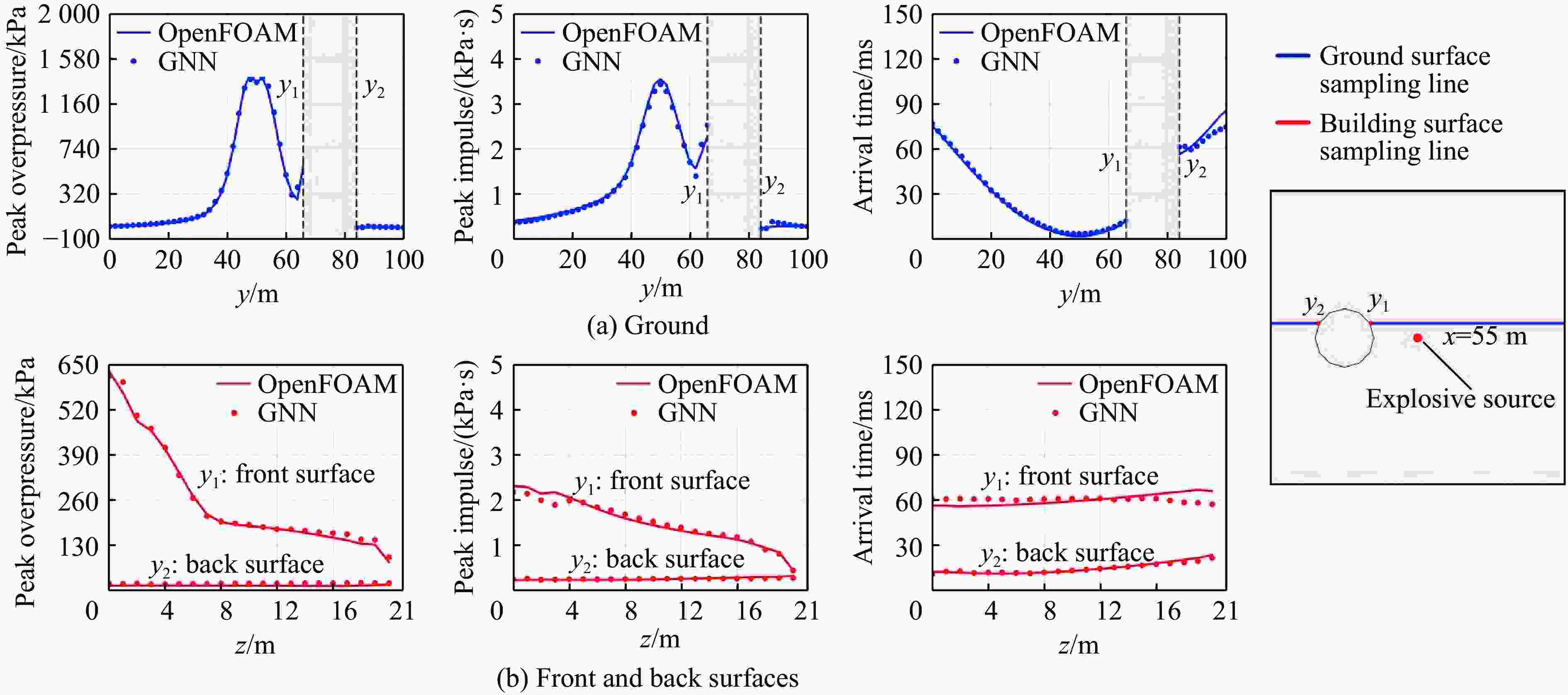 建筑类型 εRSE/% 计算时间/s 峰值超压 峰值冲量 到时 OpenFOAM GNN 复杂建筑—十二边形 1.15 2.34 0.85 991 0.15 复杂建筑—扇形 1.51 3.68 1.33 857 0.14 复杂建筑—十字形 1.16 6.69 2.74 984 0.35 建筑群落—2栋 1.95 8.16 2.04 991 0.27 建筑群落—3栋 1.67 7.57 3.07 1450 0.36 建筑群落—4栋 2.61 6.52 1.99 2045 0.51 表 3 城市区域爆炸事件GNN模型预测性能