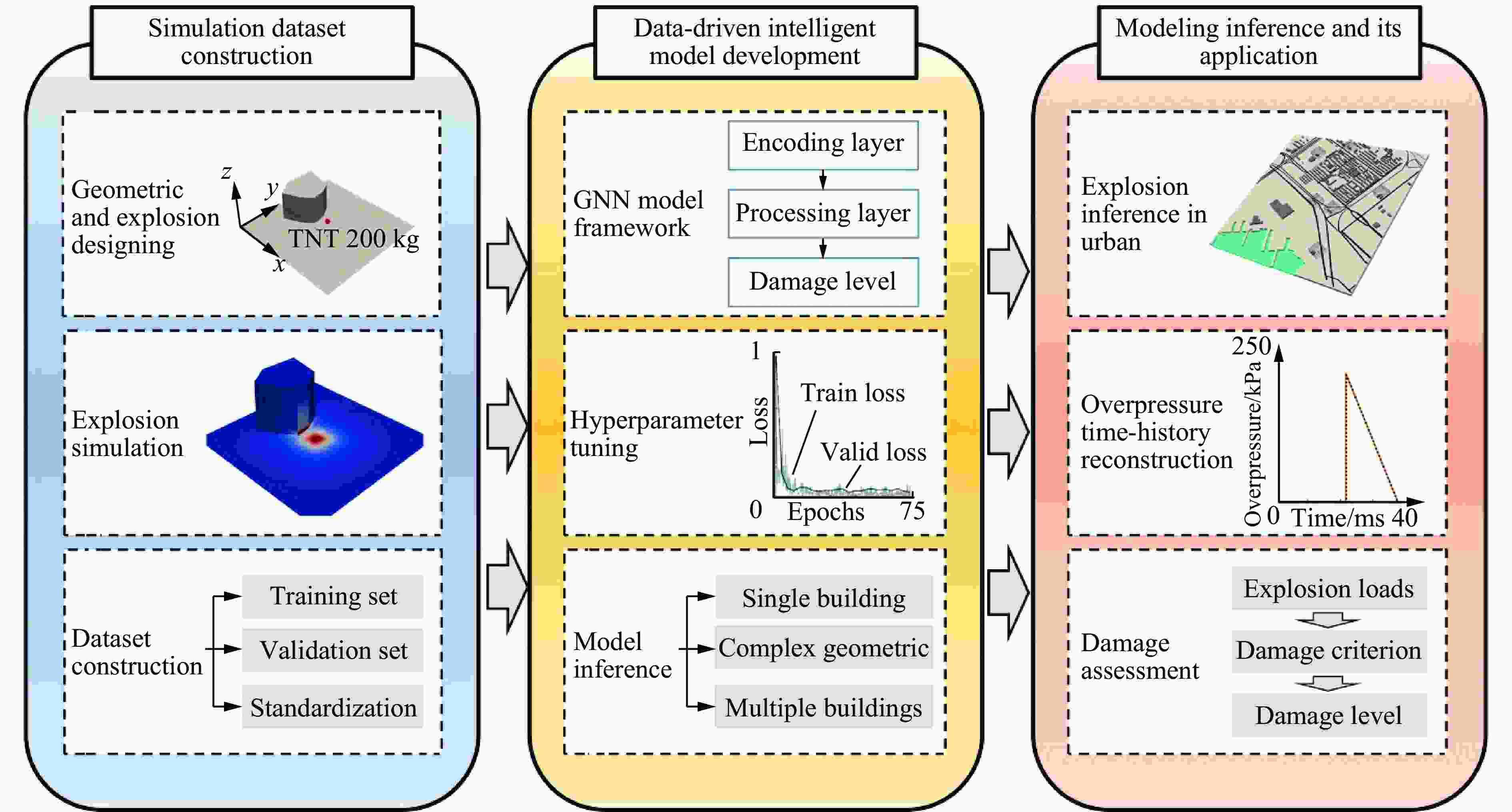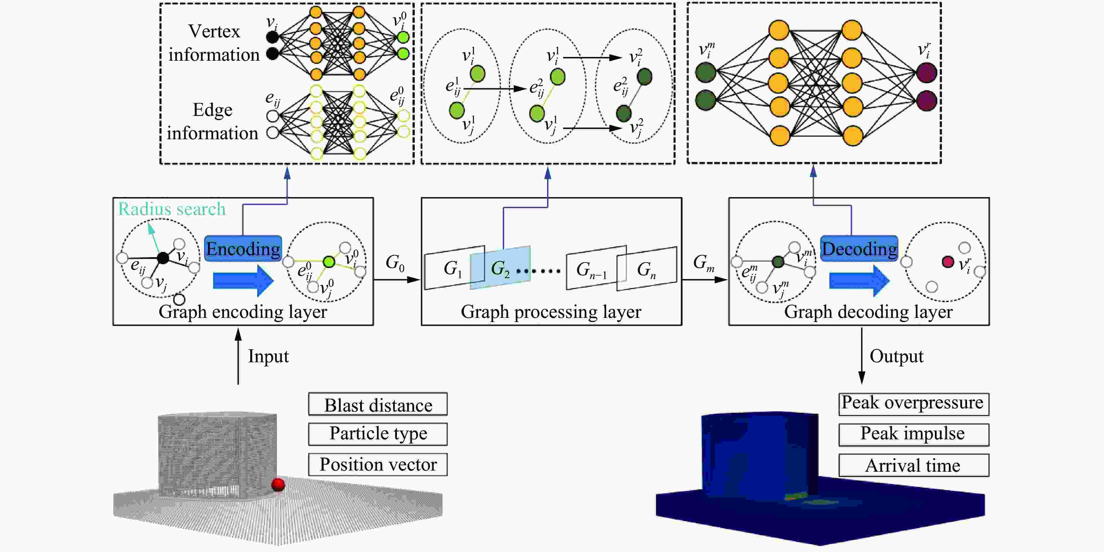 摘要: 为准确预测建筑外爆威力场,并解决传统经验公式中未能充分考虑环境因素的复杂性而导致的精度受限、数值仿真在处理大规模城市场景时效率低下的难题,构建了一种基于图神经网络(graph neural network, GNN)的爆炸威力场预测模型,直接利用建筑的几何特征,对其表面的爆炸峰值超压、峰值冲量及冲击波到达时间等三维物理场的进行预测。与数值仿真结果的对比验证表明,本文模型展现出了卓越的预测性能:对不同几何结构的单体建筑表面超压参数的预测均方误差为0.97%;对复杂几何建筑、建筑群落建筑表面超压参数的平均预测误差为3.17%;当应用于实际城市区域时,平均预测误差为1.29%;物理场单次预测耗时不超过0.6 s,与数值仿真相比速度提升3~4个数量级。基于模型的高精度预测,不仅可以重构建筑表面任意位置的超压时程曲线,还能准确评估结构的毁伤程度。Abstract: To accurately predict the explosion power fields in buildings, solving the failure of traditional empirical formulas often failing to account for complex environmental factor due to their inability to account for complex environmental factors, and that of numerical simulations inefficient for large-scale urban scenarios and do not meet the needs of rapid damage assessment. Addressing this challenge, an innovative prediction model for explosion power fields based on graph neural networks (GNN) was constructed using an end-to-end strategy. This model enabled rapid and precise forecasting of three-dimensional physical fields, including peak overpressure, peak impulse, and shock-wave arrival times on building surfaces. Compared with numerical simulations, the proposed GNN model demonstrated excellent predictive performance: it achieved a mean square error of 0.97% for predicting surface overpressure parameters of single buildings with varying geometries, and an average prediction error of 3.17% for complex geometric buildings and building communities. When applied to real-world urban settings, the model maintains an average prediction error of 1.29%, completing individual physical field predictions in under 0.6 seconds—three to four orders of magnitude faster than numerical simulations. Furthermore, the model's high-precision predictions allow for the reconstruction of overpressure time history curves at any building surface location and the accurate assessment of structural damage. The proposed GNN model offers a novel approach for rapidly and accurately predicting explosion power fields in urban buildings during blast events. This advancement significantly enhances the capabilities for explosion damage assessment and anti-explosion design in ultra-large-scale complex engineering scenarios, providing substantial engineering value.