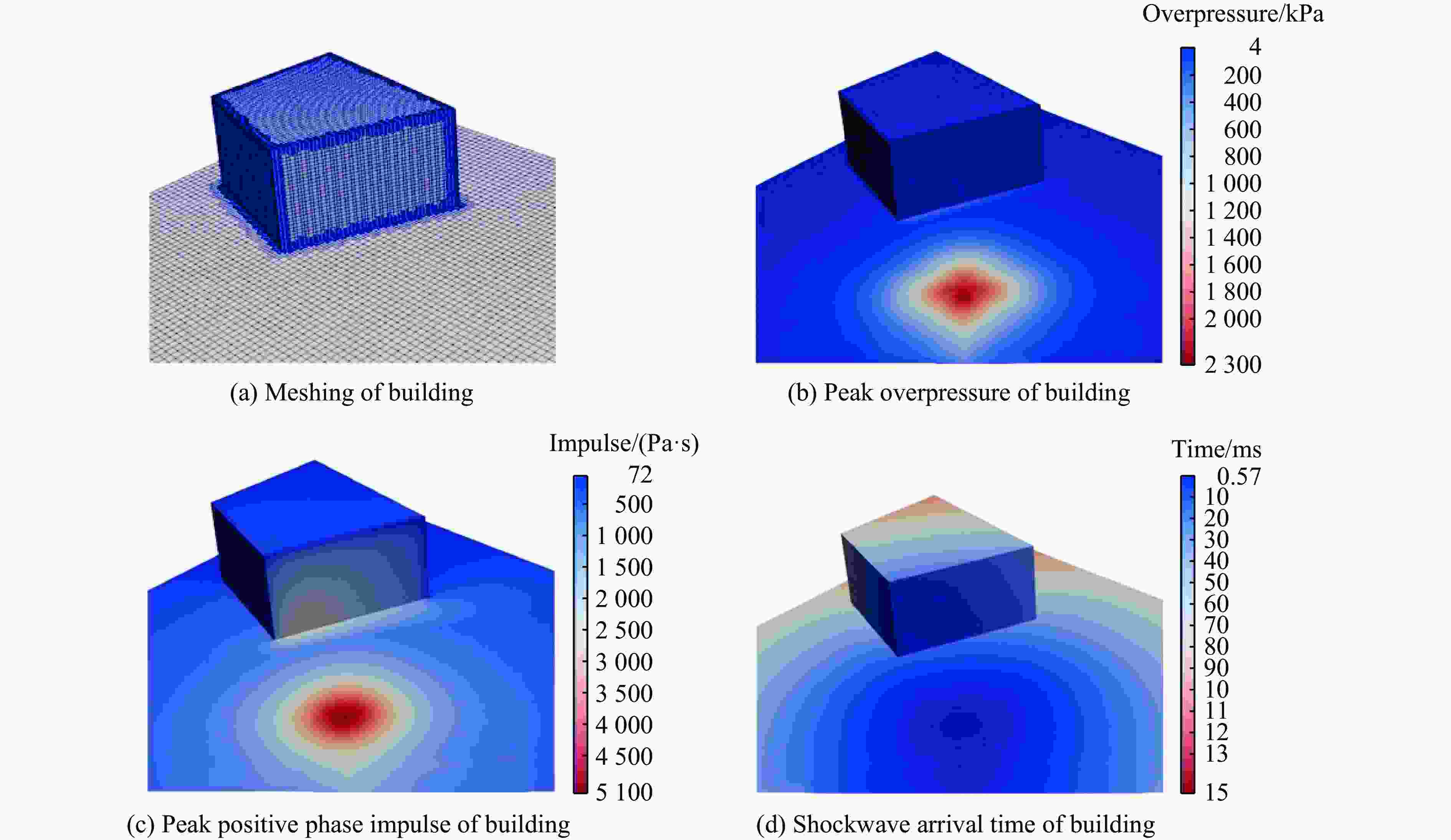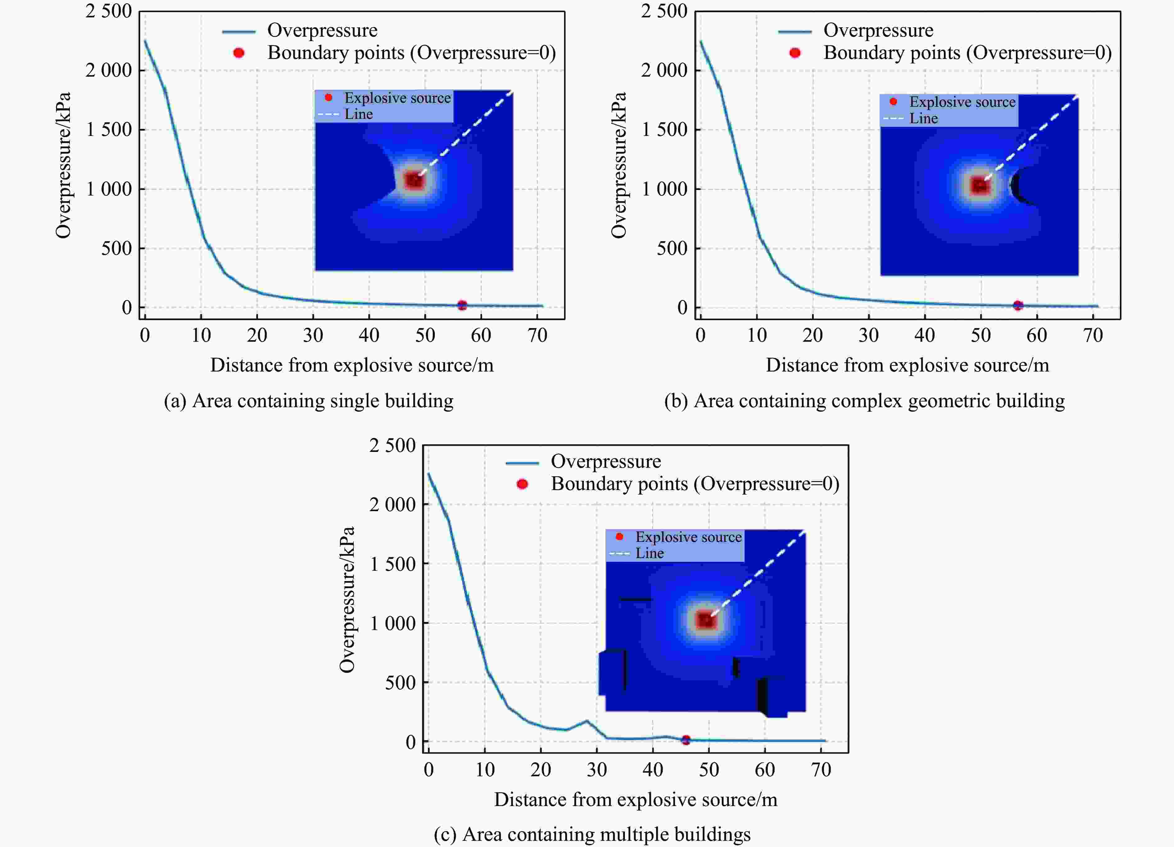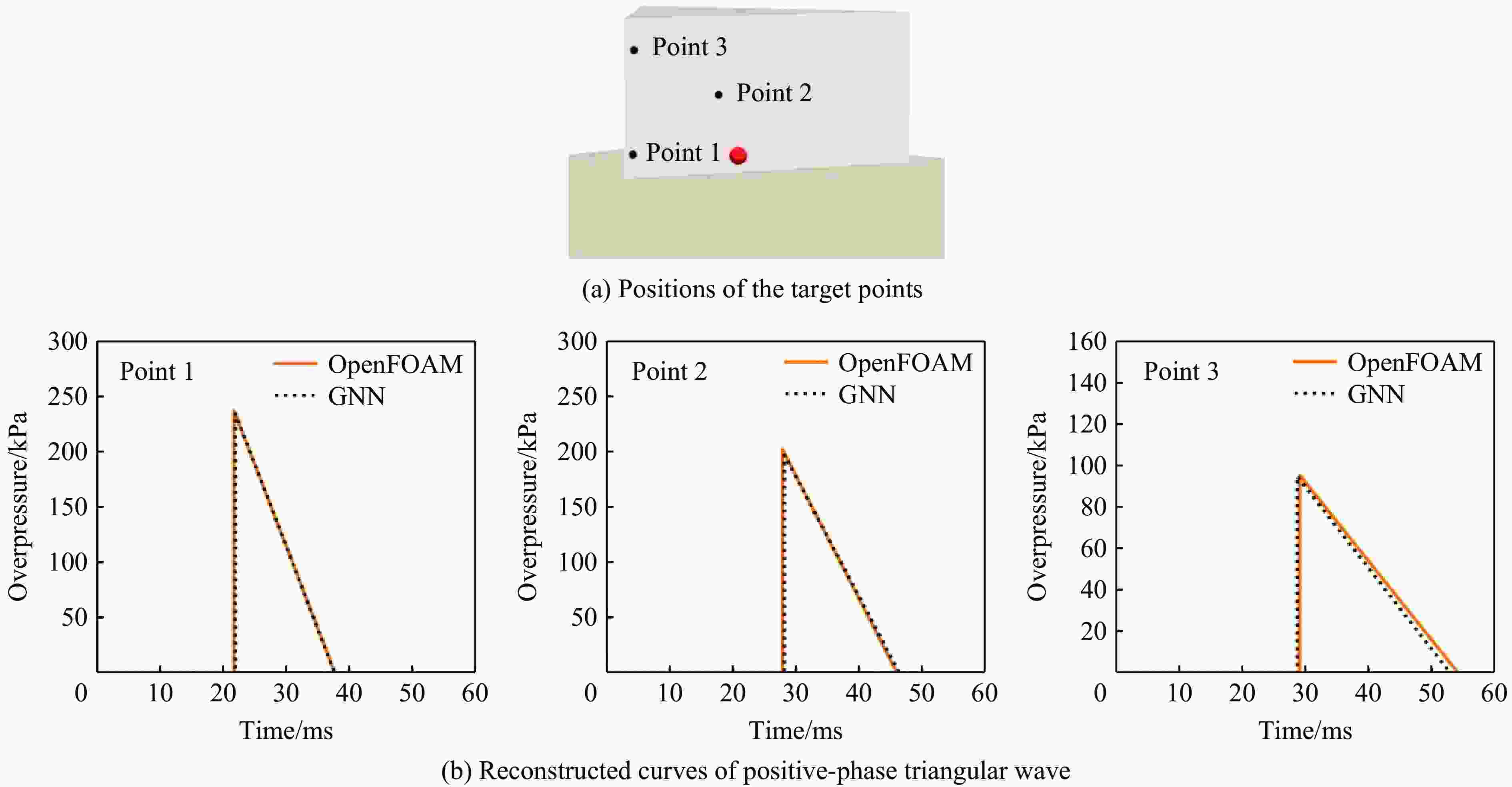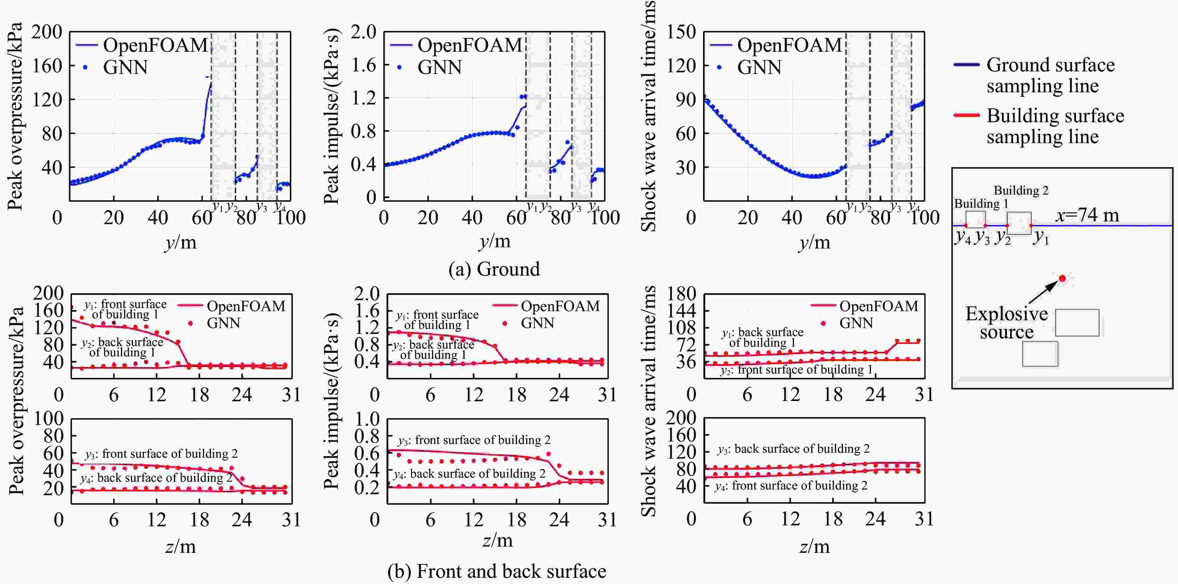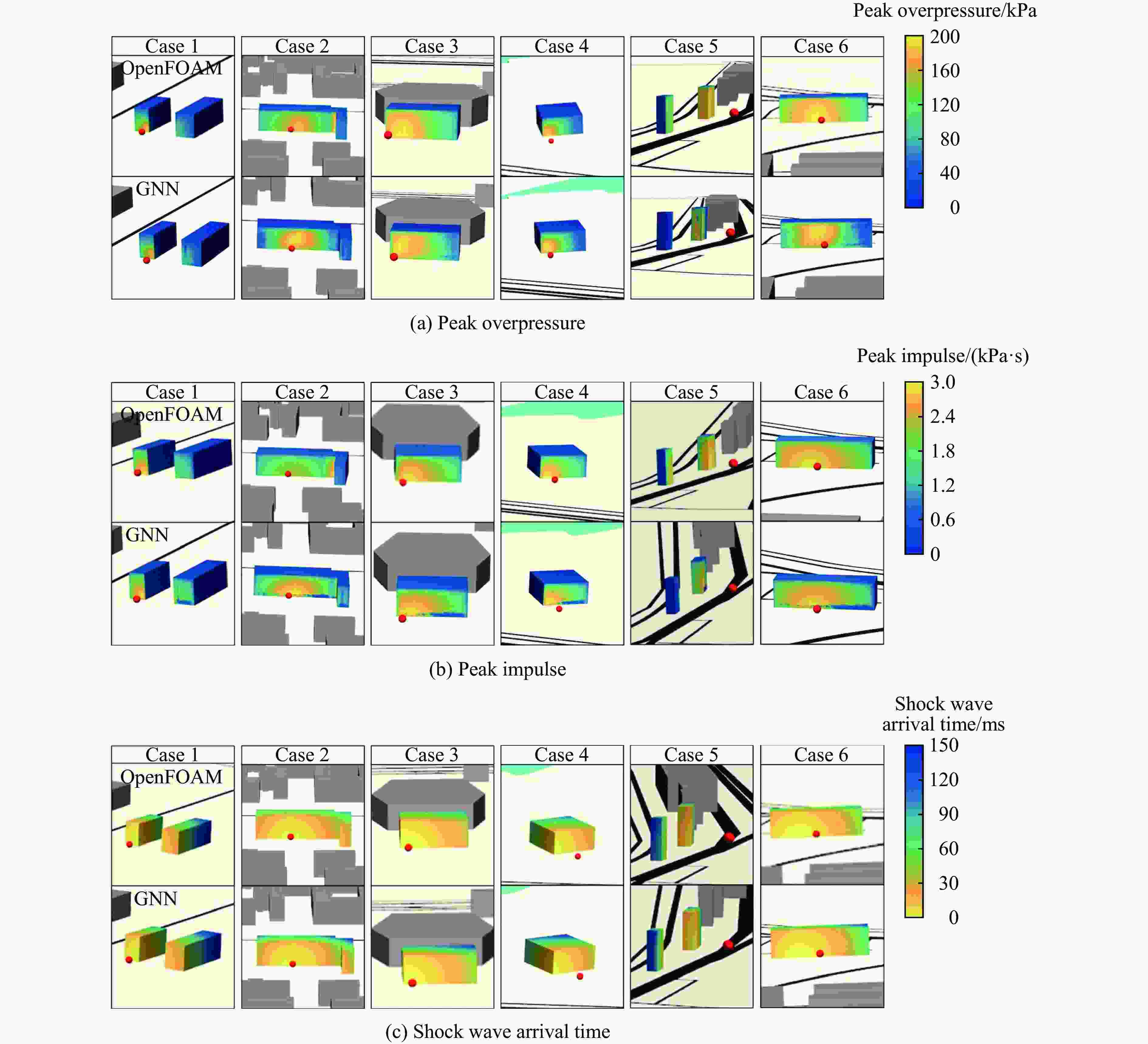 建筑类型 εRSE/% 计算时间/s 峰值超压 峰值冲量 到时 OpenFOM GNN 复杂建筑—十二边形 1.15 2.34 0.85 991 0.15 复杂建筑—扇形 1.51 3.68 1.33 857 0.14 复杂建筑—十字形 1.16 6.69 2.74 984 0.35 建筑群落—2栋 1.95 8.16 2.04 991 0.27 建筑群落—3栋 1.67 7.57 3.07 1450 0.36 建筑群落—4栋 2.61 6.52 1.99 2045 0.51 表 3 城市区域爆炸事件GNN模型预测性能