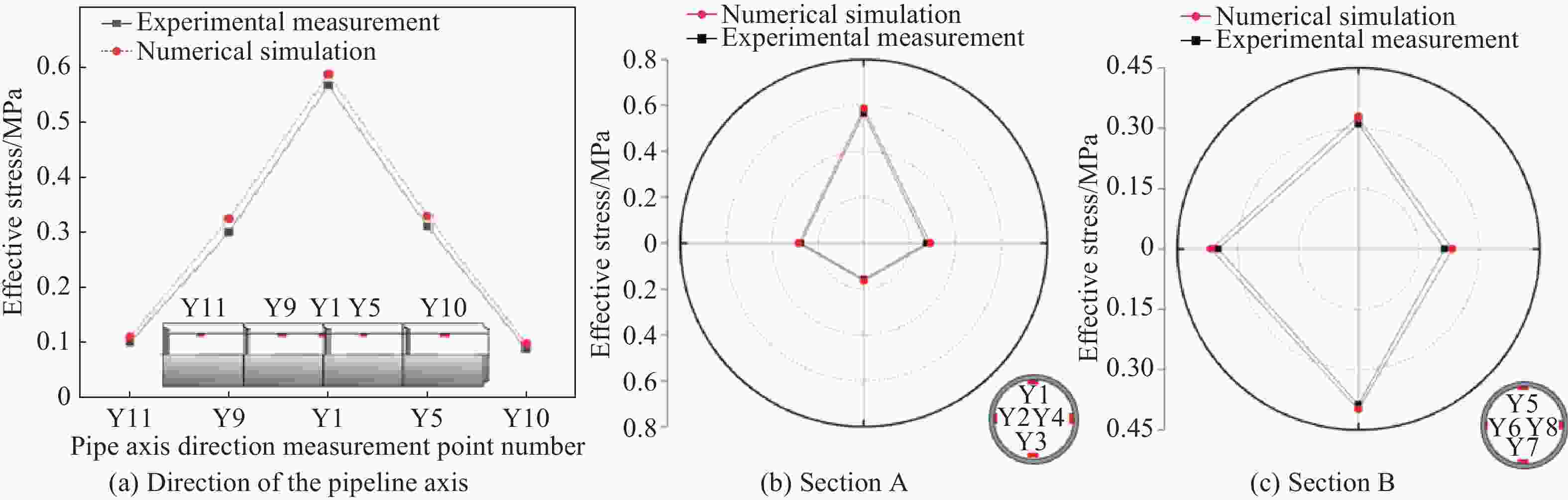 测点 有效应力/MPa 误差/% 测点 有效应力/MPa 误差/% 测点 有效应力/MPa 误差/% 试验 模拟 试验 模拟 试验 模拟 Y1 0.566 0.586 3.47 Y5 0.310 0.329 5.75 Y9 0.300 0.324 7.45 Y2 0.274 0.284 3.48 Y6 0.349 0.367 4.91 Y10 0.088 0.098 10.39 Y3 0.157 0.164 4.10 Y7 0.387 0.399 3.09 Y11 0.100 0.110 9.08 Y4 0.275 0.290 5.33 Y8 0.214 0.233 8.13 -