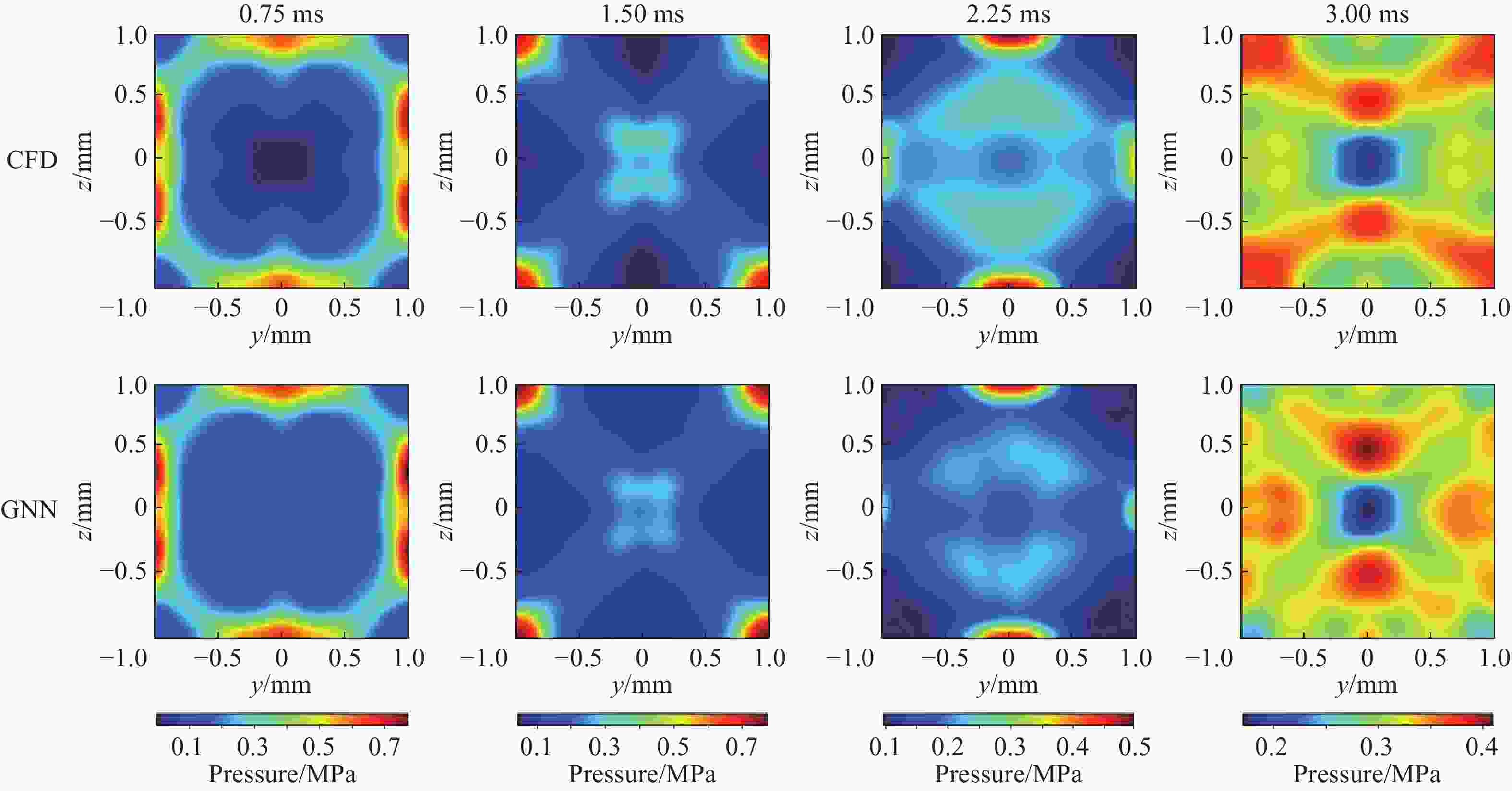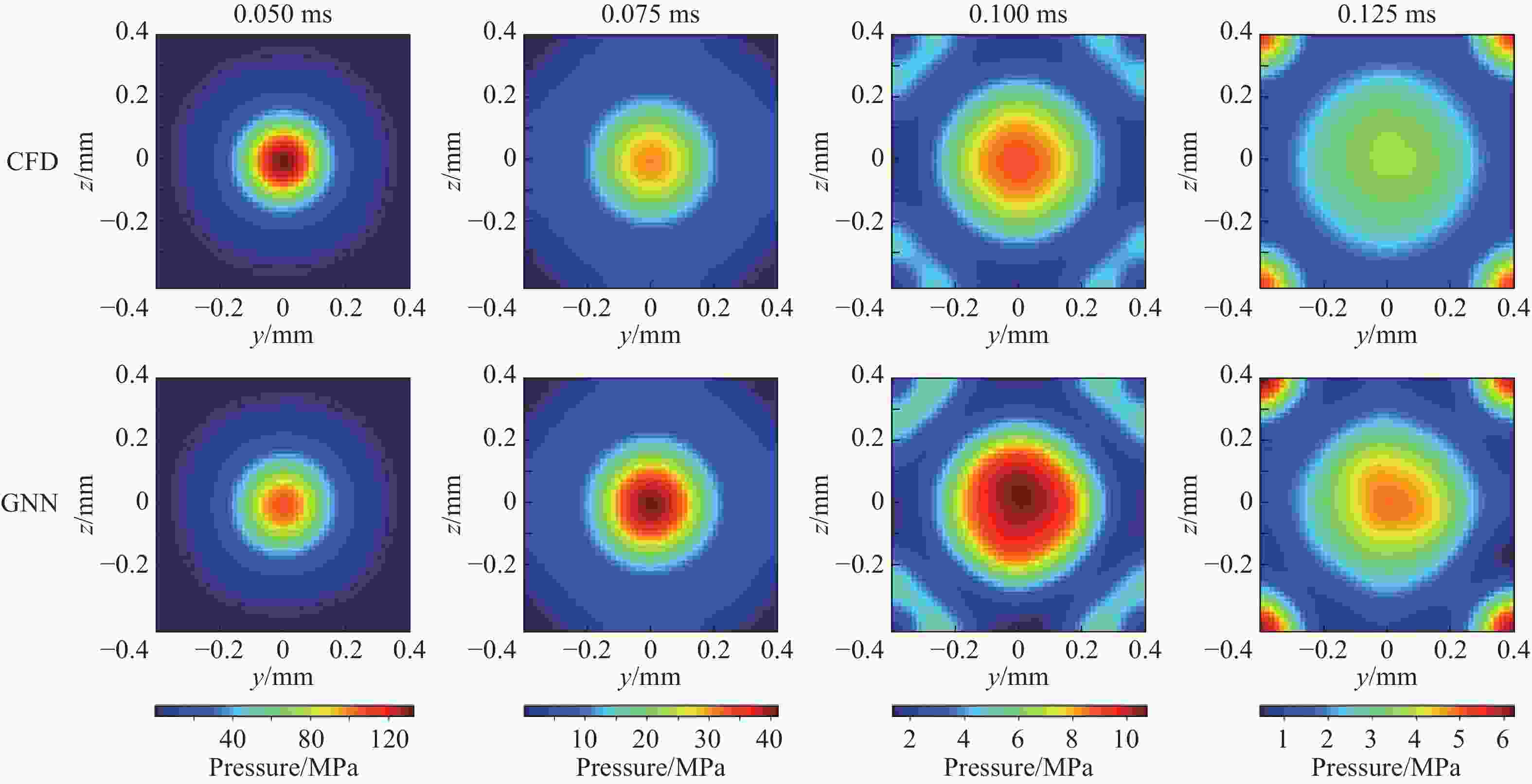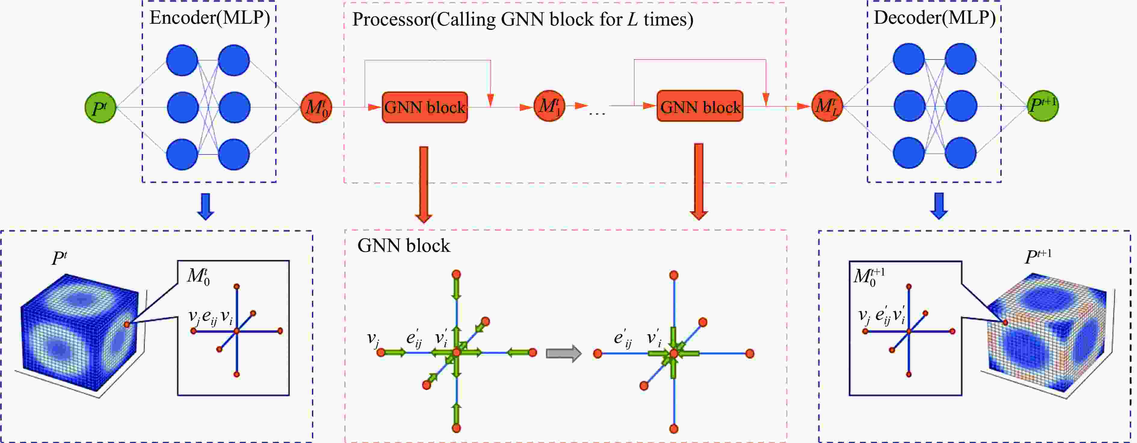 摘要: 为了满足对爆炸产生的压力荷载进行准确快速预测的需求,提出了一项基于图神经网络(graph neural network, GNN)的爆炸压力时空分布预测人工智能模型:利用开源软件blastFoam进行计算流体动力学(computational fluid dynamics, CFD)仿真,并通过网格重映射技术,以空间六面体网格划分为基础,将物理状态信息编写到节点特征中,以此将计算结果转化为标准的图格式数据,并由此建立了一个TNT自由场爆炸数据集和一个TNT密闭空间内爆炸数据集;将GNN模型分别在两个数据集的训练集上进行训练,监测模型在测试集上的均方根误差(σ)和决定系数(R2),并将预测结果与CFD的计算结果进行对比。结果表明,针对自由场爆炸和密闭空间爆炸工况,本文提出的人工智能模型均得到了良好的预测效果。该人工智能模型具有在小样本上提取特征能力强、预测速度快、预测效果好、应用场景多样的优势,并且能够实现在三维空间内对爆炸压力场进行时间和空间维度的预测。Abstract: To meet the need for accurate and rapid prediction of overpressure generated by an explosion, a graph neural network (GNN)-based artificial intelligence model was proposed in this paper for predicting the spatial and temporal distribution of the blast overpressure. The model relies on high-fidelity training data generated through computational fluid dynamics (CFD) simulations using the open-source software blastFoam, and the numerical simulations was validated against experimental data from existing literature. In the simulations, the computational domain was discretized using hexahedral meshes, and key physical parameters—including pressure, velocity, and node type—were extracted and converted into structured graph data via mesh remapping technology. This approach enabled the construction of two specialized datasets: a free-field explosion dataset and a confined explosion dataset for TNT, which serve as the foundation for training and evaluating the GNN model. The GNN model contains three modules: an encoder, a processor and a decoder. The predicted results of the pressure field can be output through inputting the standard graph format data. The GNN model was trained using the two training datasets for the two specialized scenarios, separately. The root mean square error (