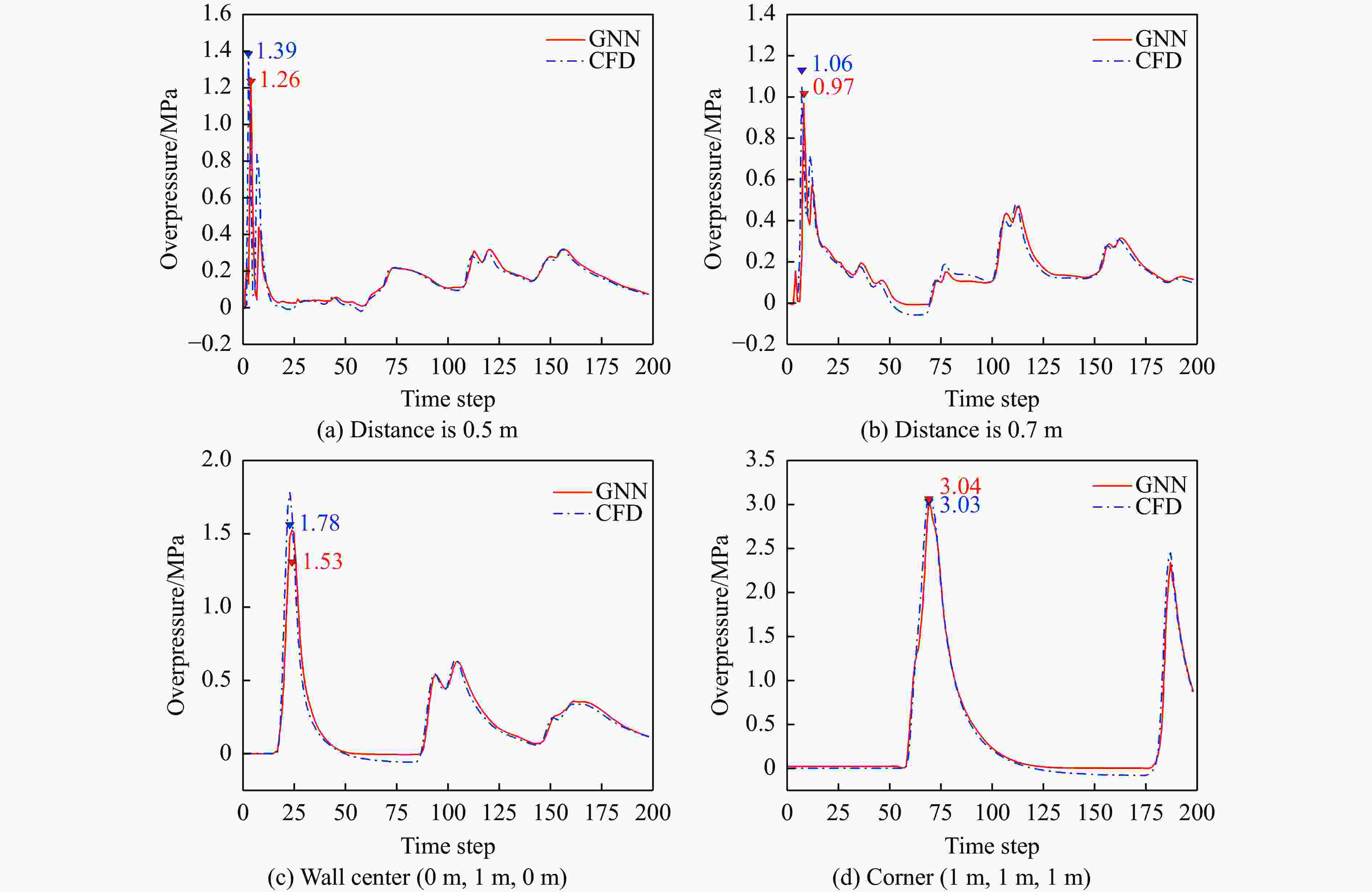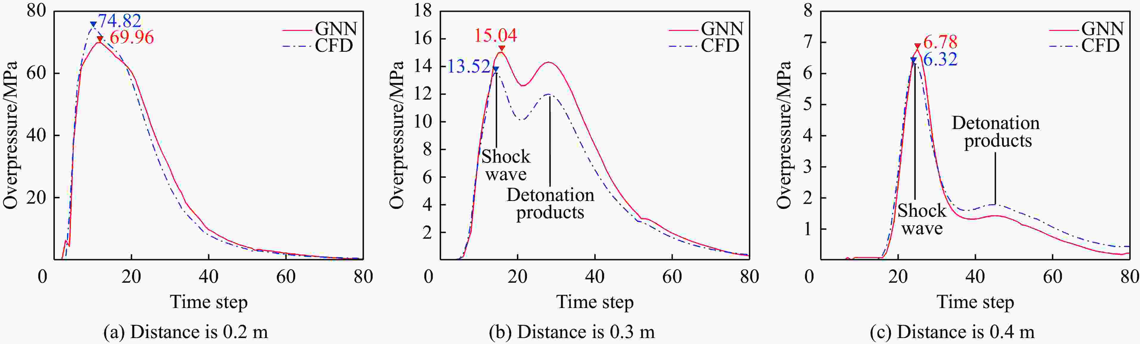 ) and the coefficient of determination (R2) of the model on the testing datasets were monitored, and the predicted results were compared with the computed results of the CFD. All the above comparisons show that the GNN-based model proposed in this paper attains good predicted results in both the free-field explosion and the confined explosion scenarios. The GNN-based model has the advantages in extracting strong feature under small samples, rapid prediction with stratified accuracy, and versatile applications. Moreover, the GNN-based model can achieve the prediction of the blast overpressure field of the three-dimensional space both in temporal and spatial dimensions. -