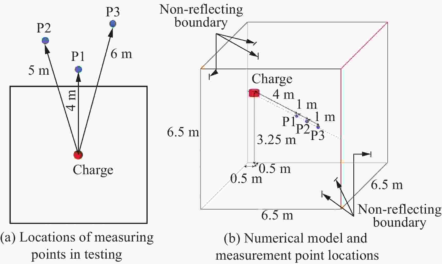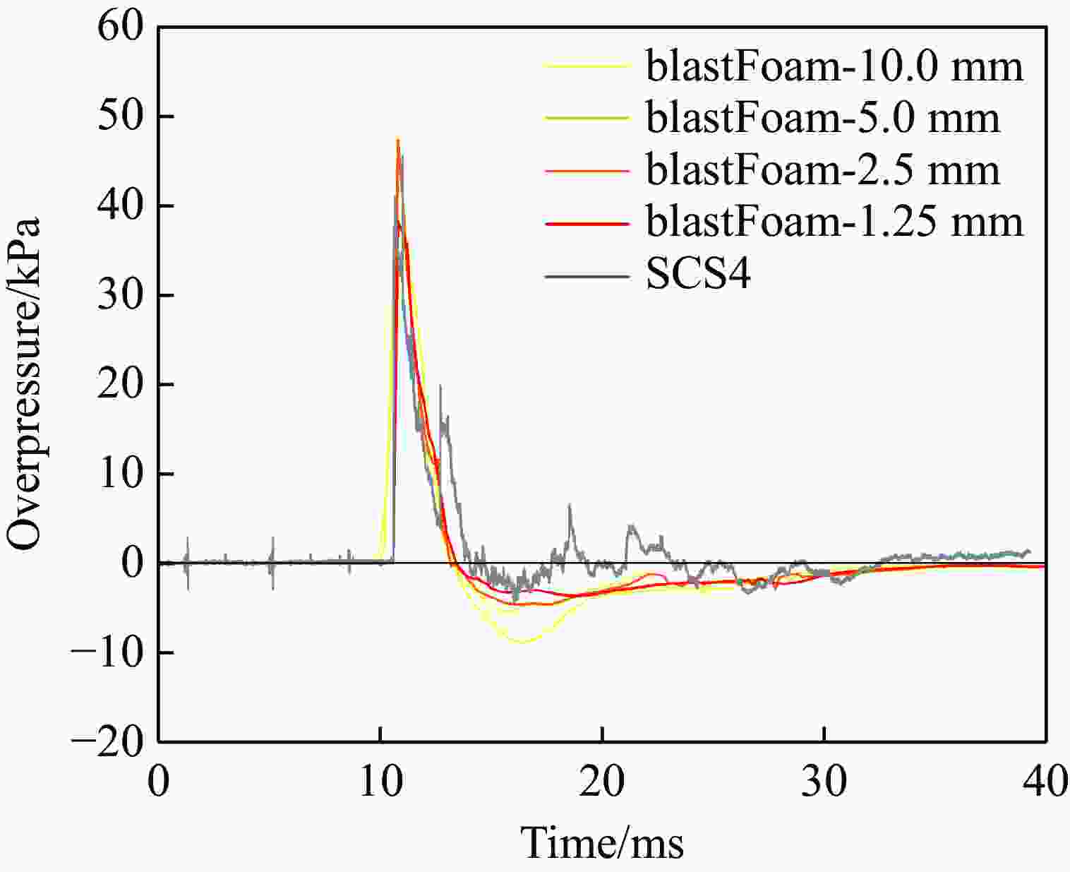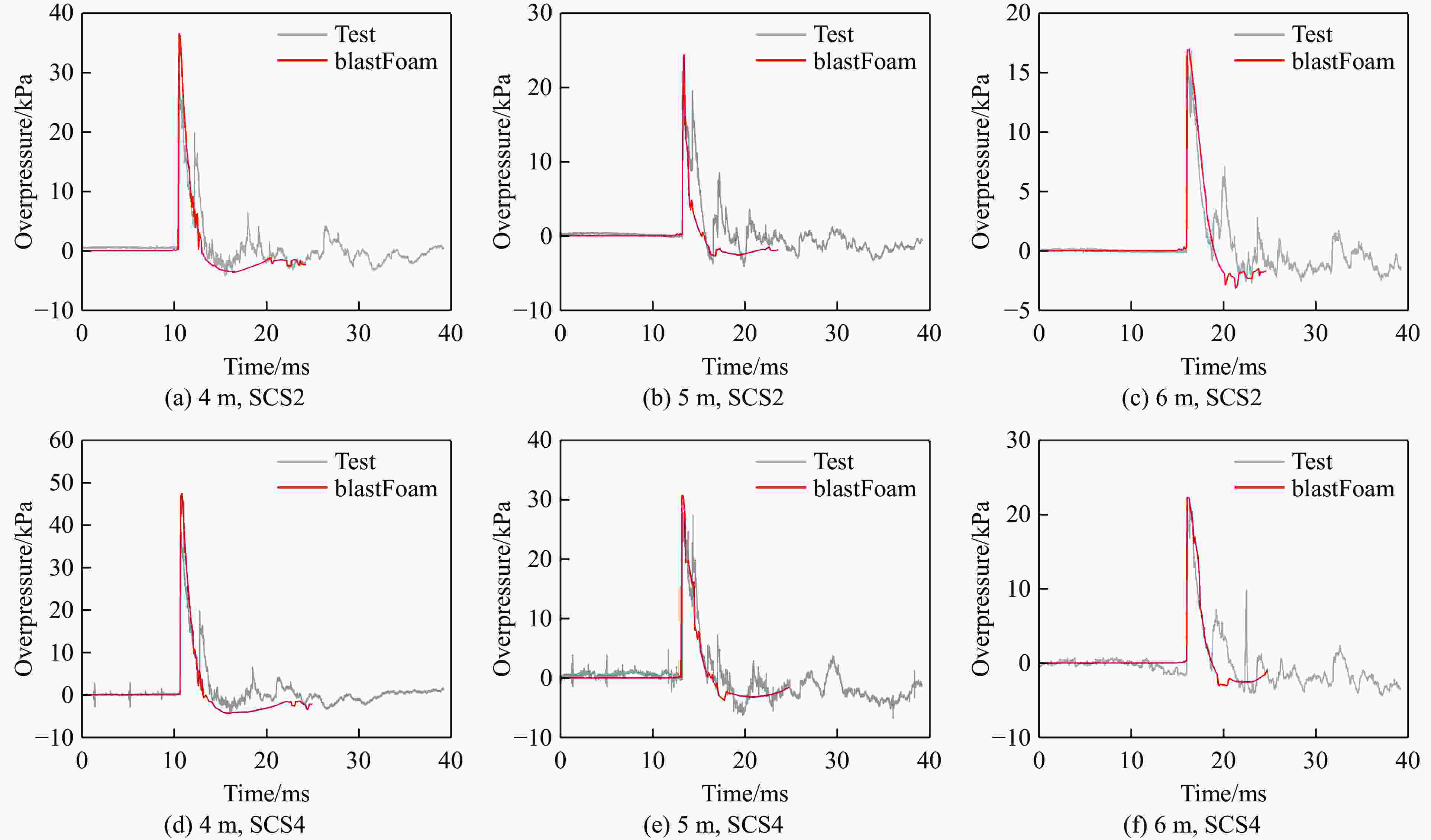 爆距/m SCS2 SCS4 平均偏差/% 试验值/kPa 仿真值/kPa 偏差/% 试验值/kPa 仿真值/kPa 偏差/% 4 29.62 36.56 23.43 45.53 47.48 4.28 10.67 5 20.37 24.38 19.69 27.82 30.73 10.46 6 16.83 17.08 1.49 21.34 22.34 4.69 表 5 自由场算例的峰值到时偏差