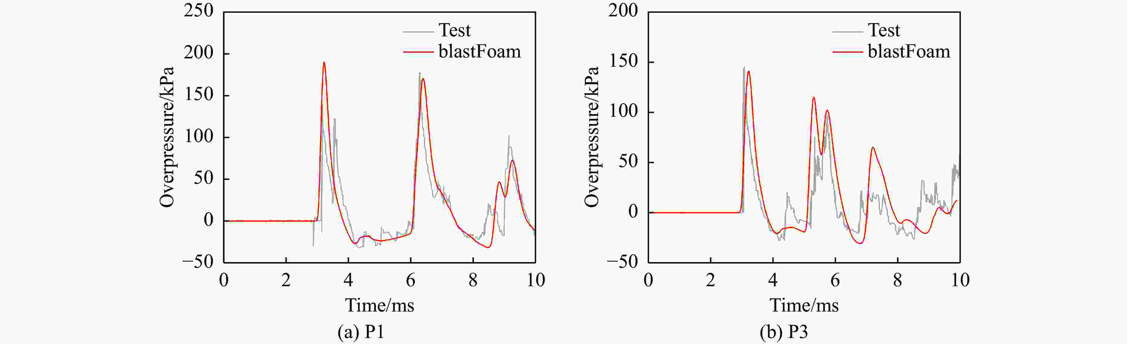 爆距/m SCS2 SCS4 平均偏差/% 试验值/ms 仿真值/ms 偏差/% 试验值/ms 仿真值/ms 偏差/% 4 10.41 10.50 0.77 11.02 10.80 2.00 1.27 5 13.24 13.40 1.21 13.34 13.30 0.30 6 16.56 16.30 1.57 16.39 16.10 1.77 表 6 密闭空间算例的超压峰值偏差