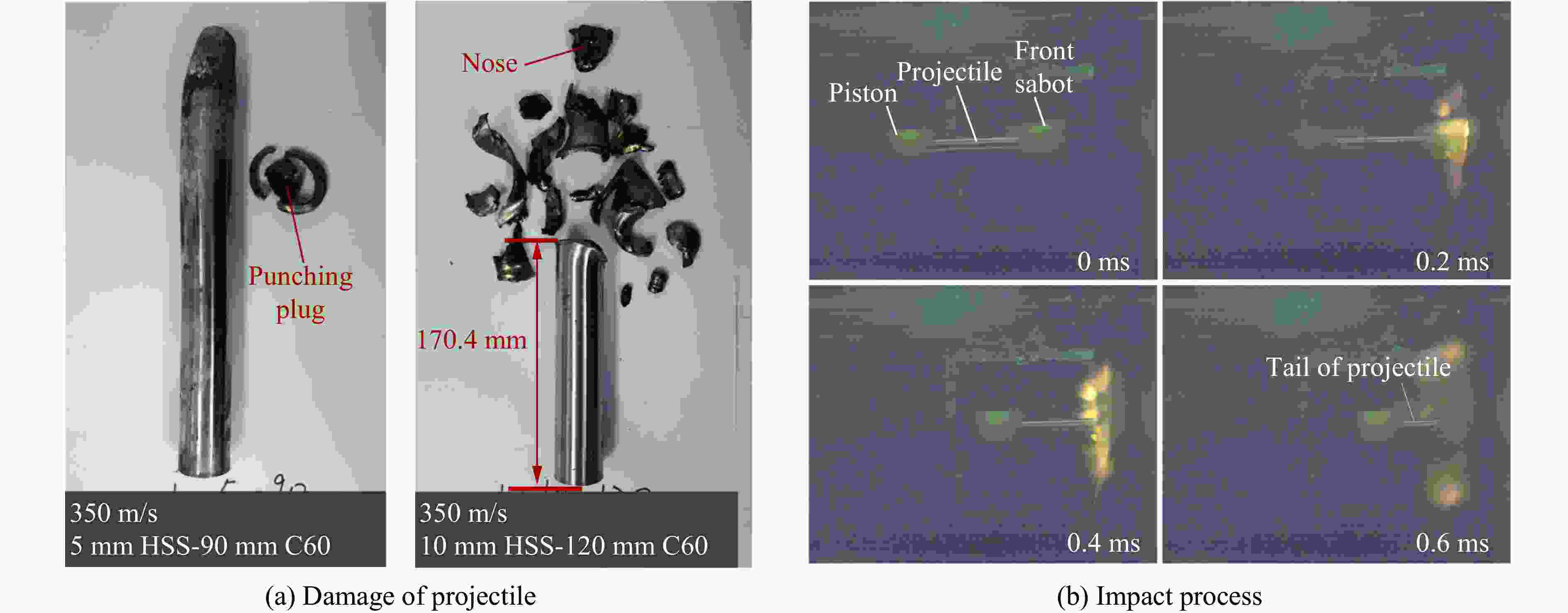 靶体 弹速/(m·s−1) 冲切深度/mm 弹体剩余长度/mm 实测值 理论值 实测值 理论值 5 mm钢-90 mm C60钢筋混凝土 350 − 5.4 − − 10 mm钢-120 mm C60钢筋混凝土 350 3.75 4.3 170.4 172 -