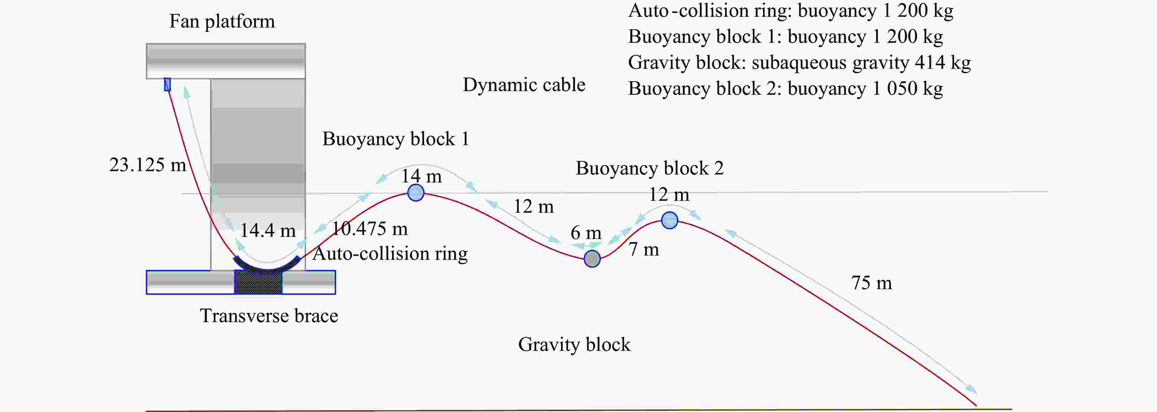 部位 净质量/kg 长度/m 动态海缆(空气中) 373 12.3 动态海缆(水中) 2603 161.7 防撞环 − 1200 14.4 浮力块1 − 1200 14.0 浮力块2 − 1050 12.0 重力块 414 6.0 -