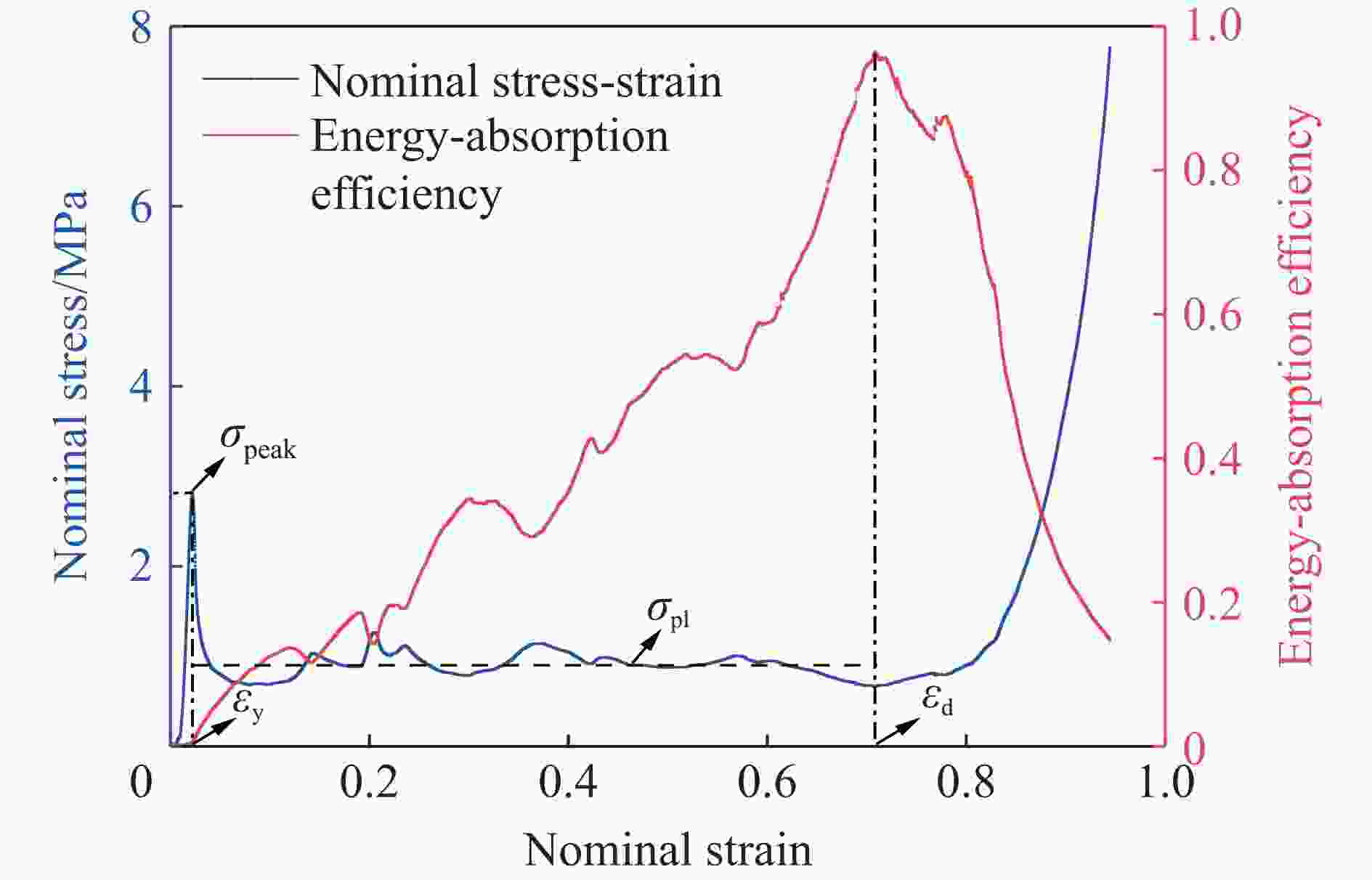 图  17  准静态压缩载荷下米字形点阵力学超材料的密实应变、平台应力和初始峰值应力