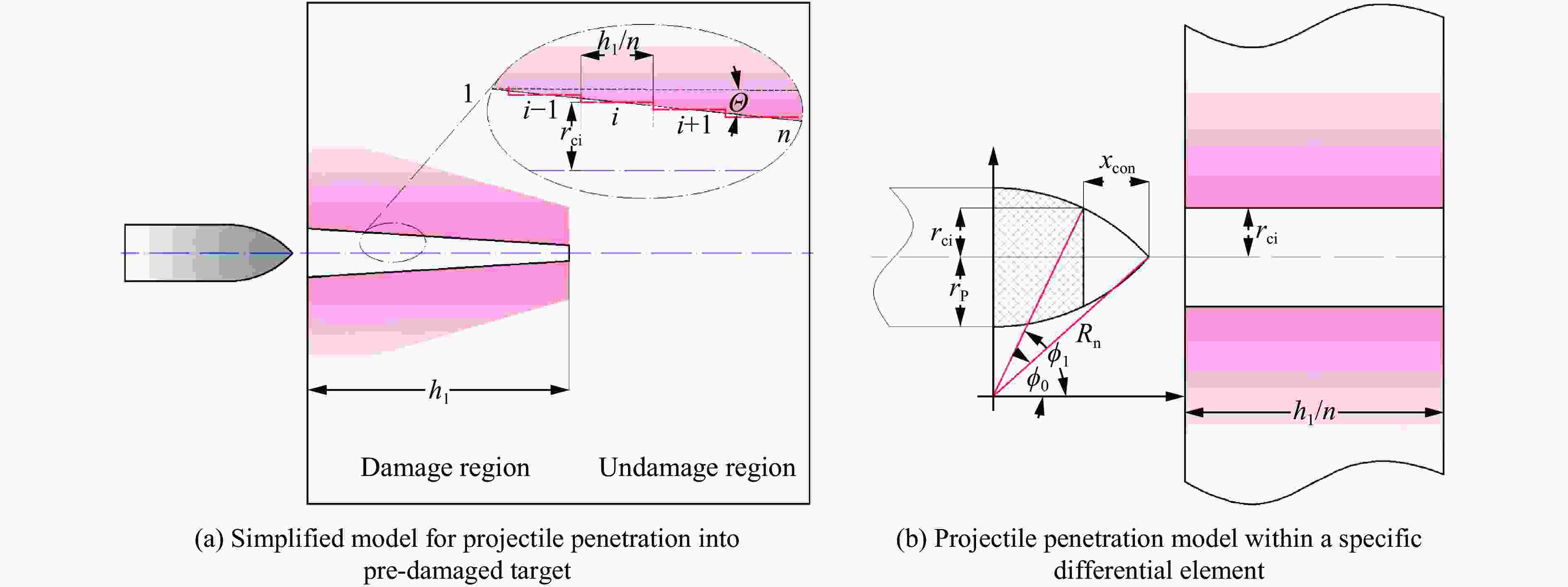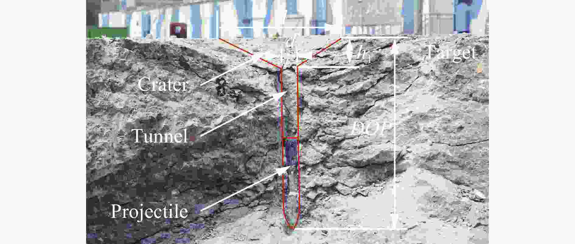 摘要: 为研究混凝土靶体损伤对弹体侵彻性能的影响效果,基于空腔膨胀理论,完善了弹体侵彻预损伤混凝土半经验模型,采用前级射流、后级动能弹体对混凝土靶进行了连续侵彻试验,获得了影响弹体侵彻预损伤混凝土性能的关键因素,结合预损伤混凝土靶体中混凝土材料强度变化关系,分析了弹靶参数对弹体二次侵彻性能的影响规律。结果表明:靶体预损伤对弹体侵彻深度的增益效果由开坑体积差及混凝土损伤共同影响,且混凝土损伤为主要影响因素;当靶体内存在有限长损伤区,靶体开孔直径是弹体直径的0.3~0.5倍时,靶体损伤对弹体侵彻深度增益最为明显;当靶体内存在贯穿损伤区,靶体开孔直径与弹体直径的比值为0.3时,预损伤靶体与预开孔靶体中弹体侵彻深度差异较为明显,且随着比值进一步增加,两者差异逐渐增加;当靶体损伤状态一定时,减小弹体直径或增大尖卵形弹体头部CRH对增加侵彻深度更为有利。Abstract: In order to investigate the impact of target damage on projectile penetration performance, a series of penetration experiments were conducted on a concrete target utilising a former jet and a subsequent kinetic energy projectile. The critical factors influencing the performance of pre-damaged concrete penetrated by the projectile were analyzed. The relationship between the strength of the concrete materials in the pre-damaged concrete target was determined. Based on this, a semi-empirical model of projectile penetration of pre-damaged concrete was established by combining the aforementioned cavity expansion theory with the results of the preceding analysis. The impact of projectile and target parameters on the performance of secondary penetration of the projectile was then analyzed. The findings indicate that the impact of pre-damaged concrete on the depth of projectile penetration is contingent upon the discrepancy in crater volume and concrete damage. It can be posited that the damage to the target is the predominant influencing factor. When there is a finite-length damage zone within the concrete target and the diameter of the cavity of the target is between 0.3 and 0.5 time the diameter of the projectile, the effect is even less pronounced. When a finite-length damage zone exists within the target, the pre-damage cavity is 0.3-0.5 times the diameter of the projectile. In this instance, the gain in depth of penetration is most pronounced. In the event of penetrating damage to the target, a ratio of 0.3 between the diameter of the target tunnel and that of the projectile is observed. The difference in penetration depth between the pre-damaged target and the pre-drilled target is found to be greater, with a gradual increase in this difference as the ratio increases further. When the damage state of the target is certain, decreasing the projectile diameter or increasing the CRH of the ogive-nosed projectile is more advantageous to increase the depth of penetration.