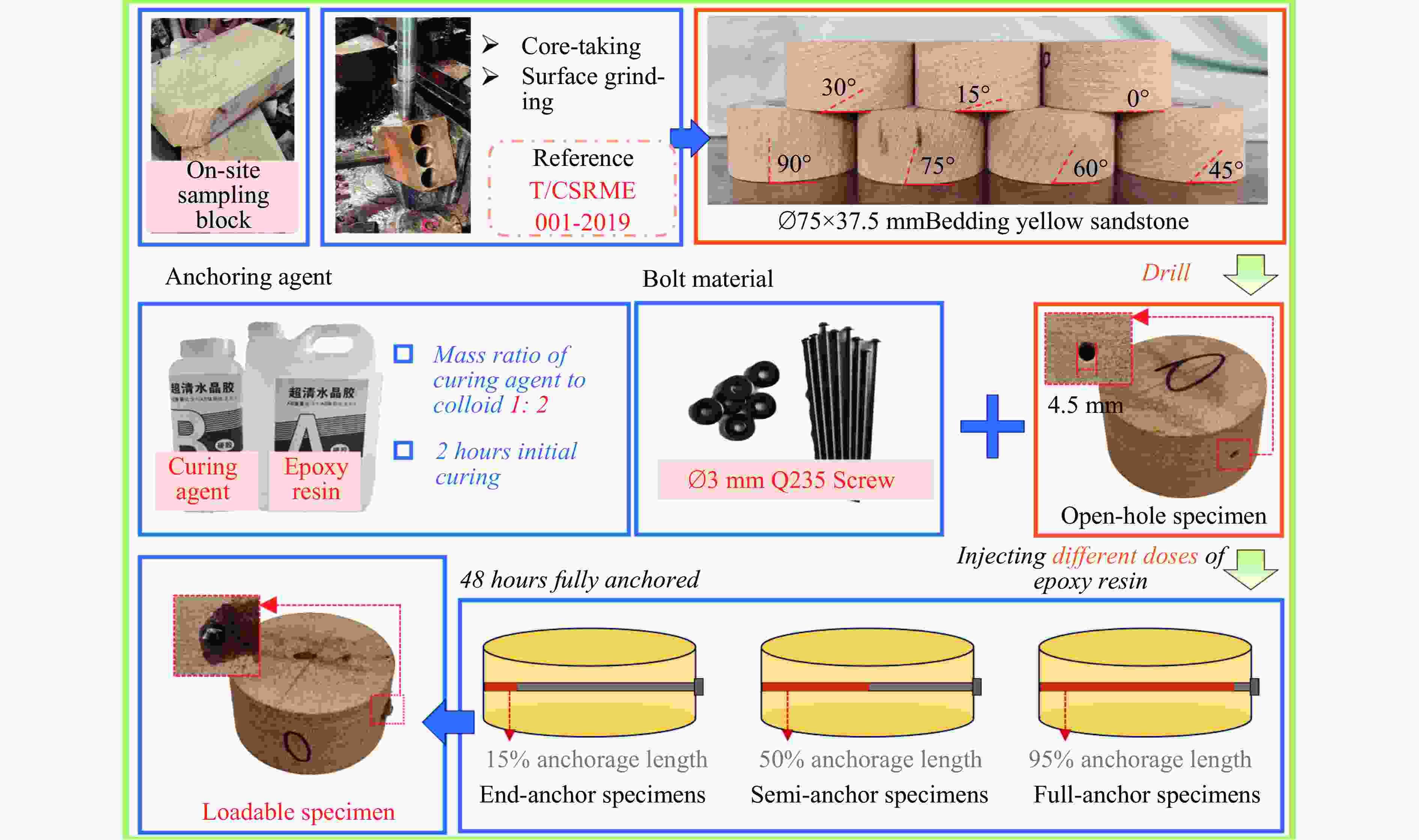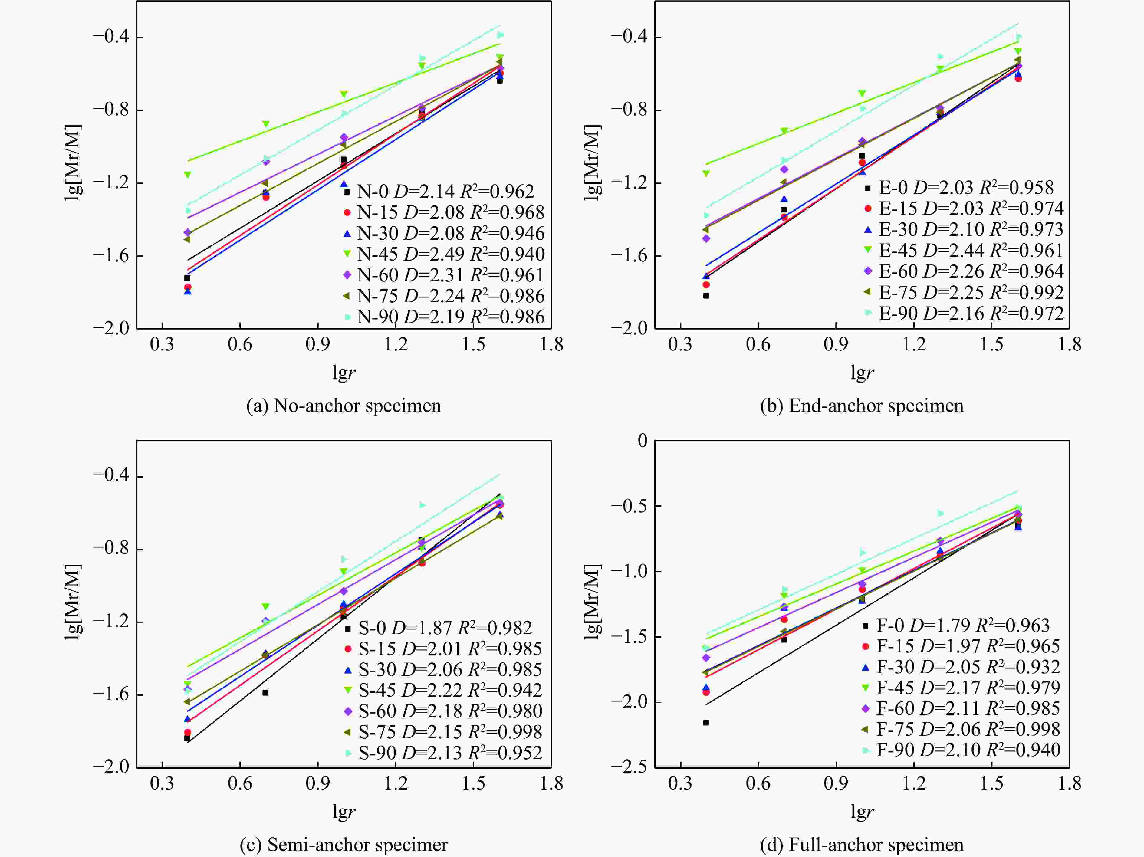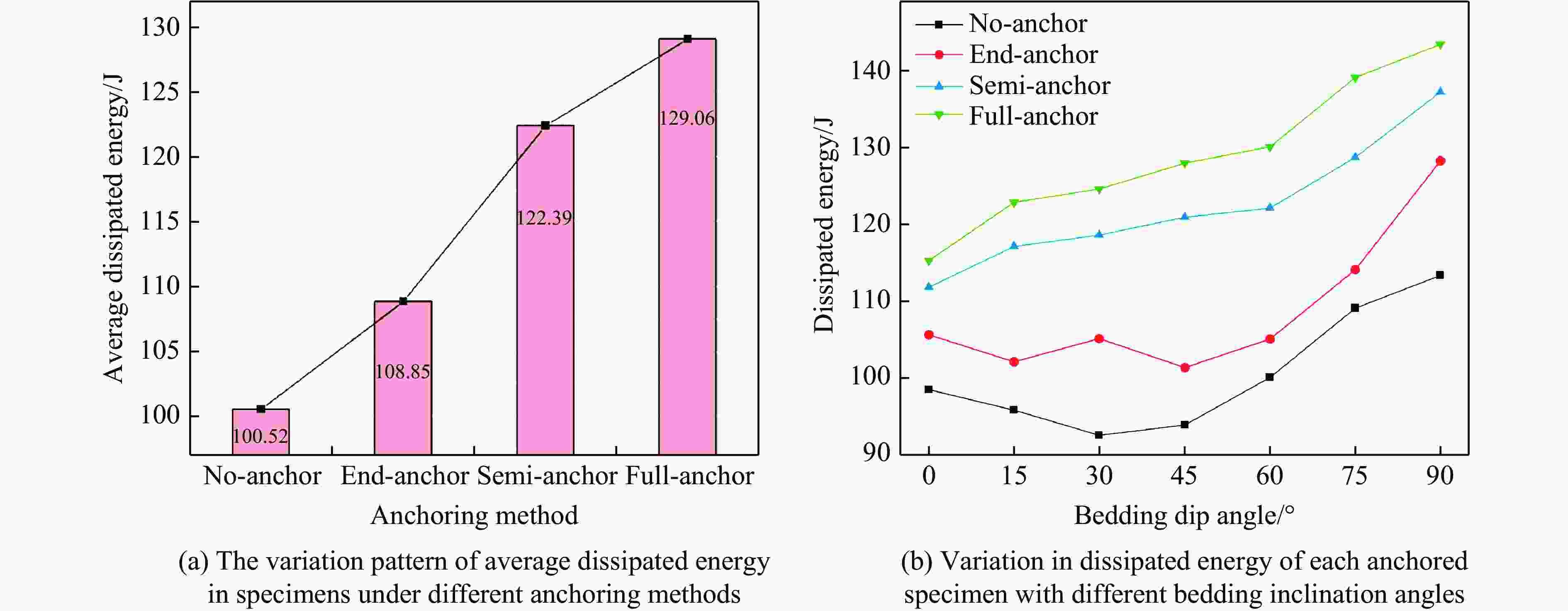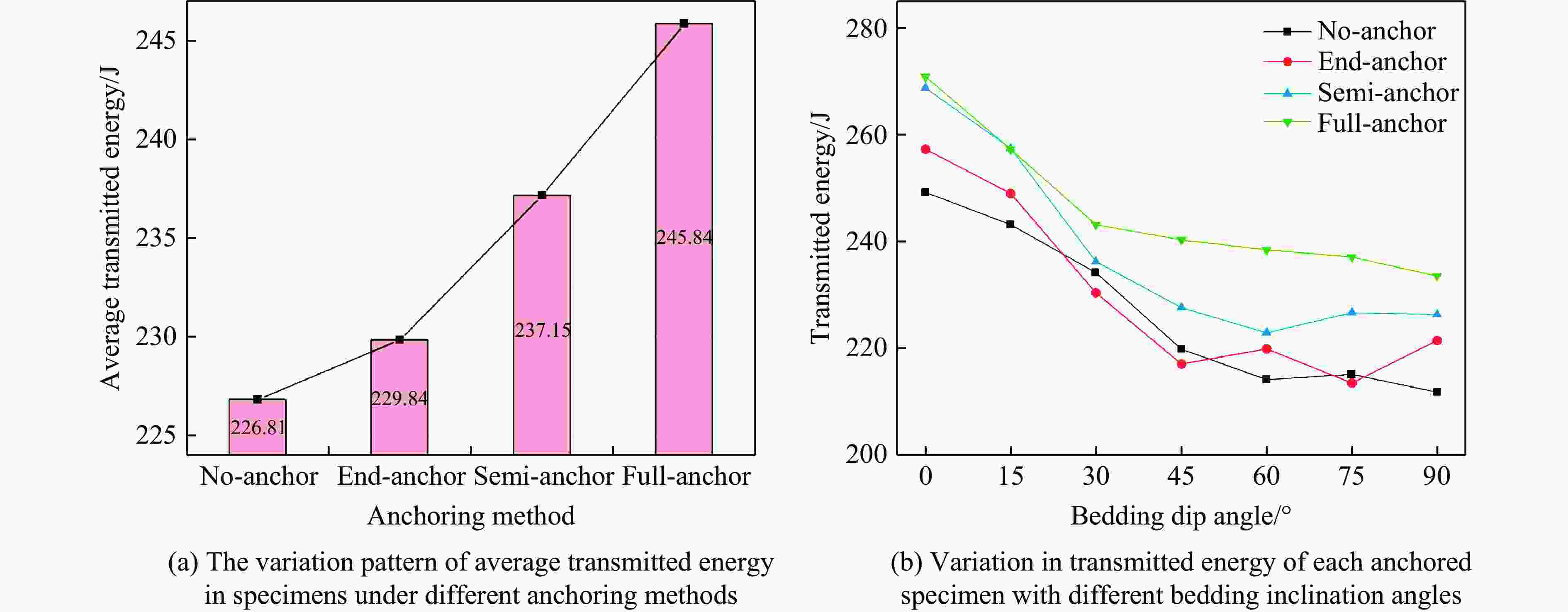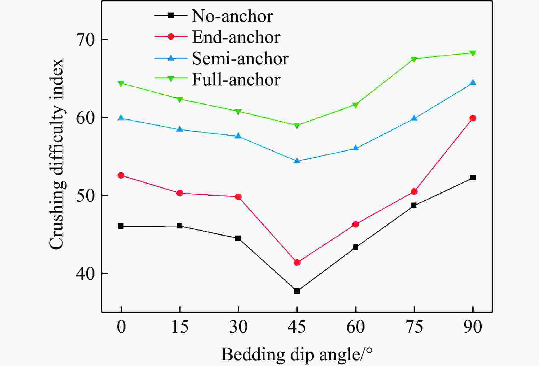 摘要: 为研究冲击荷载下锚固方式与层理倾角对岩体强度的影响规律,对无锚、端锚、半锚及全锚层理砂岩进行动态冲击试验研究,分析了不同锚固方式对层状砂岩动态力学特性、能量耗散规律及破裂分形特征的影响。研究结果表明:无锚试样强度随层理倾角增大,曲线表现先减小后增大,呈“V”型特征,试样在锚固后,强度得到明显提高,随锚固长度增大,曲线向倒“V”型特征转化;从能量方面来看,四类试样透射能变化规律均与强度变化规律相似,随层理倾角增大,反射能曲线呈倒“V”型特征,透射能逐渐减小,耗散能则逐渐增大,锚固方式仅影响了曲线整体水平;试样破坏后的碎屑具有明显分形特征,分形维数受层理倾角影响曲线均表现为倒“V”型特征,全锚试样破碎程度最小,无锚试样最剧烈,在此基础上计算了单位耗散能指数,曲线则呈现"V"型特征,全锚试样的单位耗散能指数曲线整体水平最高,表明其抗破坏能力最强。研究成果可为层状岩体工程锚固支护提供参考。Abstract: Layered rock masses were prone to bedding plane cracking or even large-scale collapse under impact loads such as blasting. In engineering practices, bolts or cables were commonly employed for anchoring support. To investigate the dynamic mechanical response of layered rock masses under impact loading and the effectiveness of bolt support, sandstone specimens with different bedding dip angles (0°, 15°, 30°, 45°, 60°, 75°, 90°) and bolt support methods (No-anchor, End-anchor, Semi-anchor, Full- anchor) were prepared. Dynamic impact tests were conducted using a split Hopkinson pressure bar system to analyze the coupling effects of bedding dip angle and bolt support method on the dynamic strength, energy evolution, and failure modes of the rock mass. Additionally, fractal theory was employed to quantitatively characterize the fracture characteristics of the specimens. The results indicate that the strength of unanchored specimens initially decreases and then increases with increasing bedding plane angle, exhibiting a V-shaped curve. After anchoring, the strength of specimens improves significantly, and as the anchor length increases, the curve transitions to an inverted V-shape. From an energy perspective, the transmitted energy trends of all four specimen types are similar to their strength trends. As the bedding plane angle increases, the reflected energy curve shows an inverted V-shape, the transmitted energy gradually decreases, while the dissipated energy increases. The anchoring method primarily affects the overall level of the curves. The fragments of the specimens after failure exhibit distinct fractal characteristics, with the fractal dimension curves showing an inverted V-shape influenced by the bedding plane angle. Full-anchor specimens display the least fragmentation, while No-anchor specimens experience the most severe damage. Based on this, the unit dissipated energy index was calculated, revealing a V-shaped curve. Full-anchor specimens exhibit the highest overall unit dissipated energy index, indicating their superior resistance to damage. The findings of this study can provide a reference for anchor support design in layered rock mass engineering.