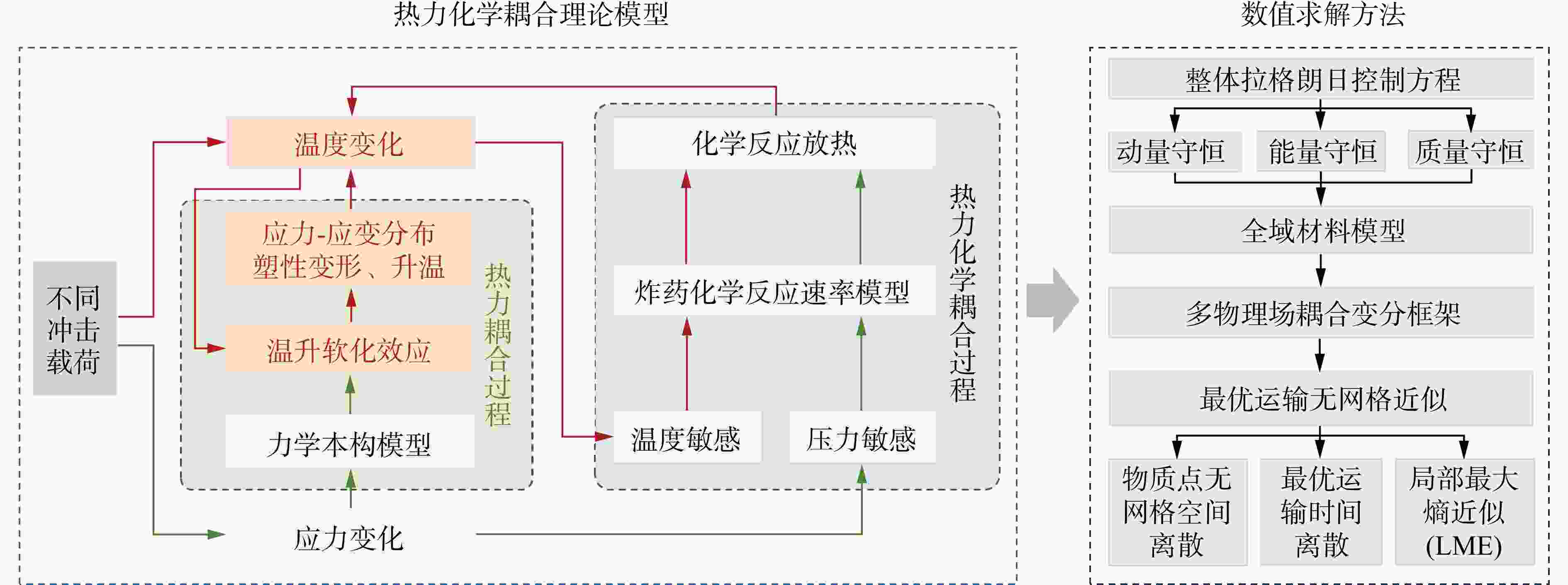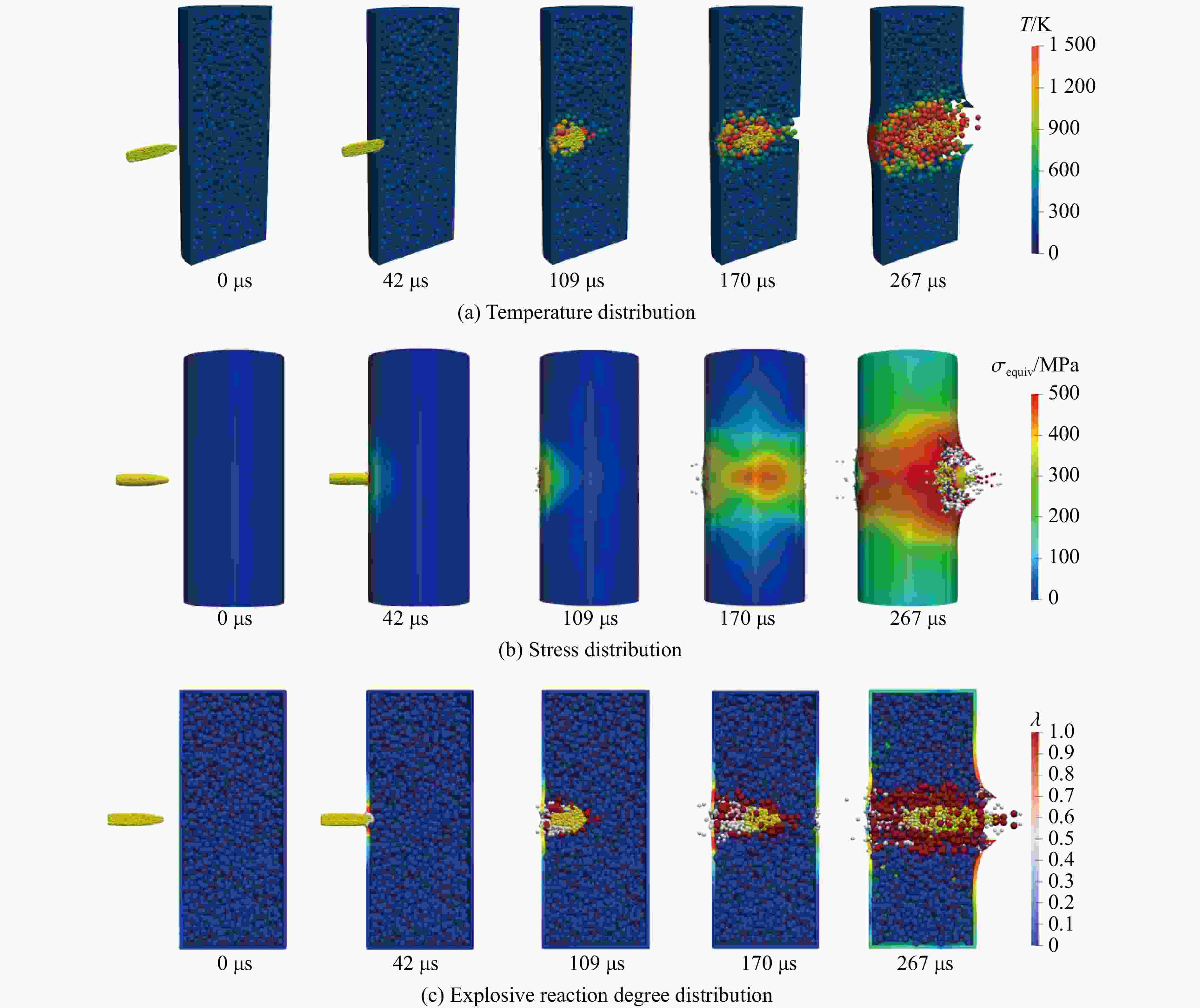 1850 m/s)2种不同冲击速度的典型冲击场景数值模拟为例,分析了冲击速度对炸药起爆机制和弹药整体响应的影响规律,并与相关试验结果进行对比。结果表明,本方法可有效刻画冲击作用下的材料大变形、摩擦生热、热点形成及化学反应传播等耦合机制,研究成果可为弹药抗冲击设计优化和安全性评估提供可靠的技术支撑。Abstract: With the development of modern weapon systems, the requirements for the survivability of ammunition in various complex environments have been continuously increasing. During the processes of storage, flight, and combat, ammunition may be subjected to extreme impact loads such as high-speed impacts, shock waves, bullet and fragment impacts. The external impacts can induce plastic deformation and fracture of the ammunition casing, and even detonate the internal explosives. These responses involve complex phenomena including impact loading, thermo-mechanical coupling of materials, chemical reactions of explosives, and blast effects, representing a typical dynamic response problem of reactive materials under extreme thermo-mechanical coupling conditions. Accurately predicting the responses of ammunition under impact loading is critical for its design optimization and safety assessment. Based on the Hot Optimal Transportation Meshfree (HOTM) method, a meshfree numerical approach was proposed to accurately predict the ammunition responses under different impact loadings. Meanwhile, a thermo-mechanical-chemical coupling constitutive model of explosives was established, which took the effects of temperature and pressure on the explosive’s chemical reaction and detonation into account. The Arrhenius thermal-chemical reaction coupling model for explosive initiation and the Lee-Tarver three-term pressure ignition model induced by local high pressure were integrated to accurately simulate the different initiation mechanisms of explosives under varying impact velocities, thereby predict complex physical phenomena during the impact loading of ammunition. These phenomena include high-speed contact, large plastic deformation of the metal casing, material fracture, heat conduction, explosive initiation, and the expansion work performed by chemical reaction products. Taking the numerical simulations of two typical impact scenarios—bullet impact on ammunition at 850 m/s and fragment impact at1850 m/s—as examples, the influence of impact velocity on the initiation mechanisms of explosives and the overall response of ammunition was analyzed, with comparisons made against relevant experimental results. The proposed approach and findings provide reliable technical support for the optimization of impact-resistant design and safety assessment of ammunition. -