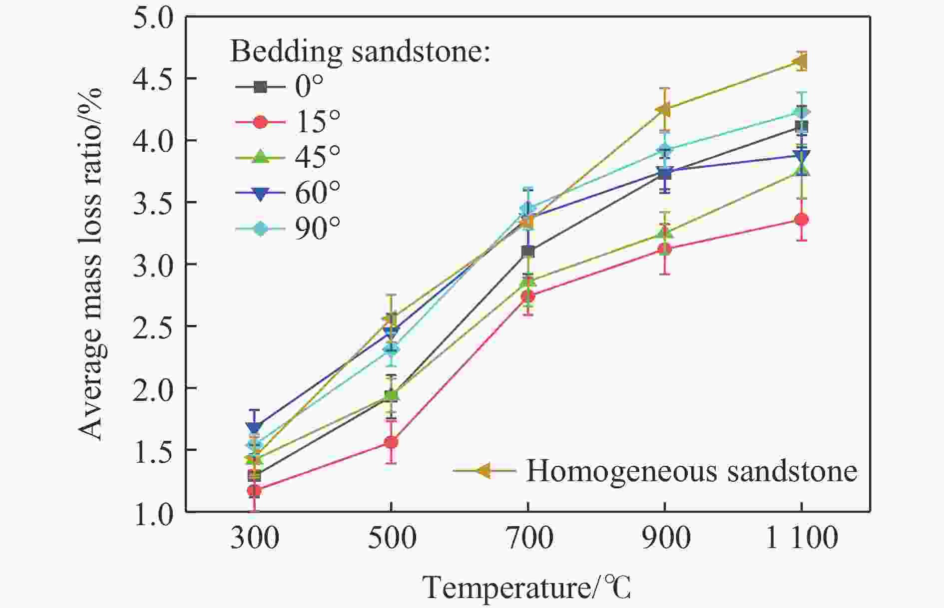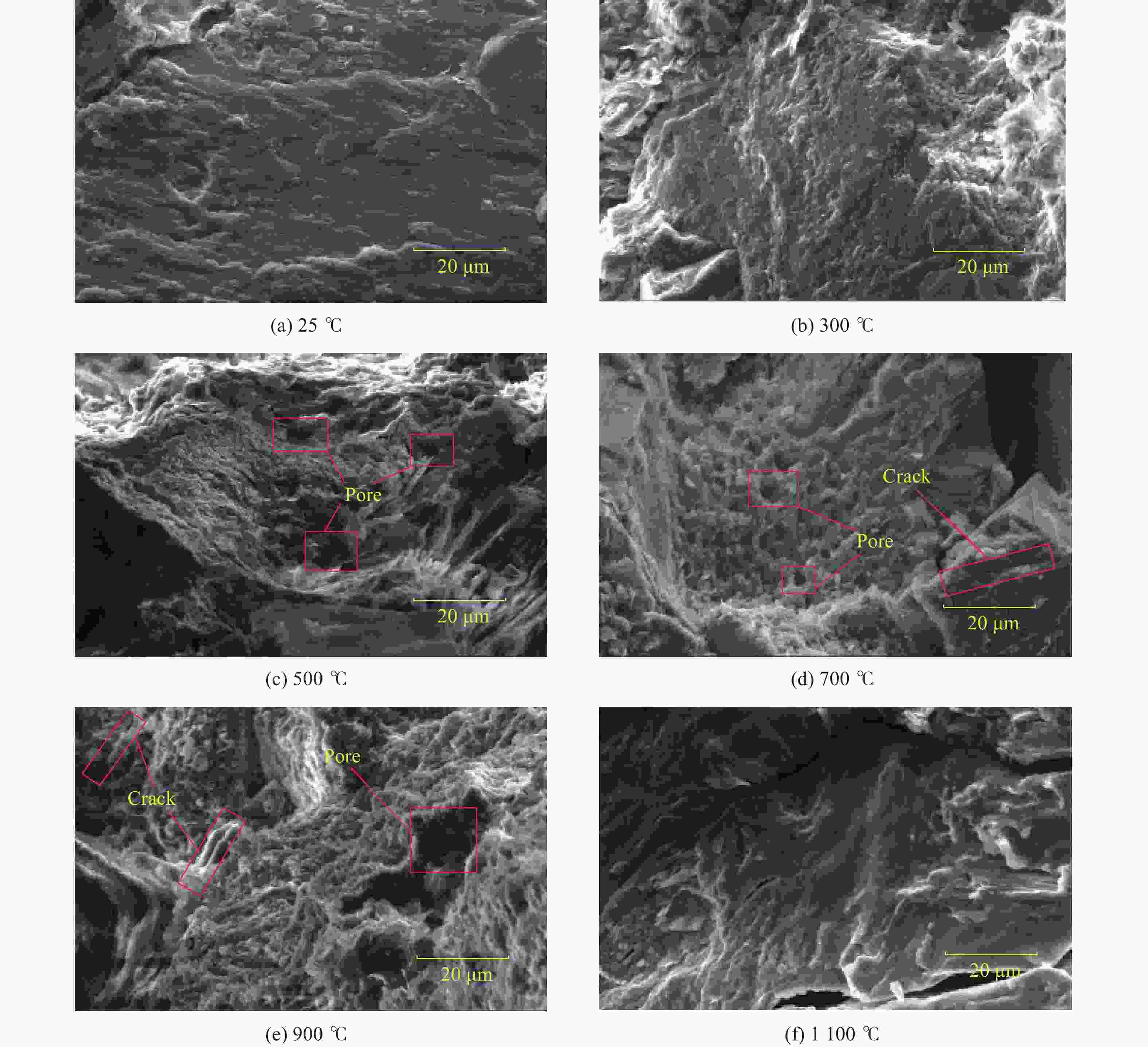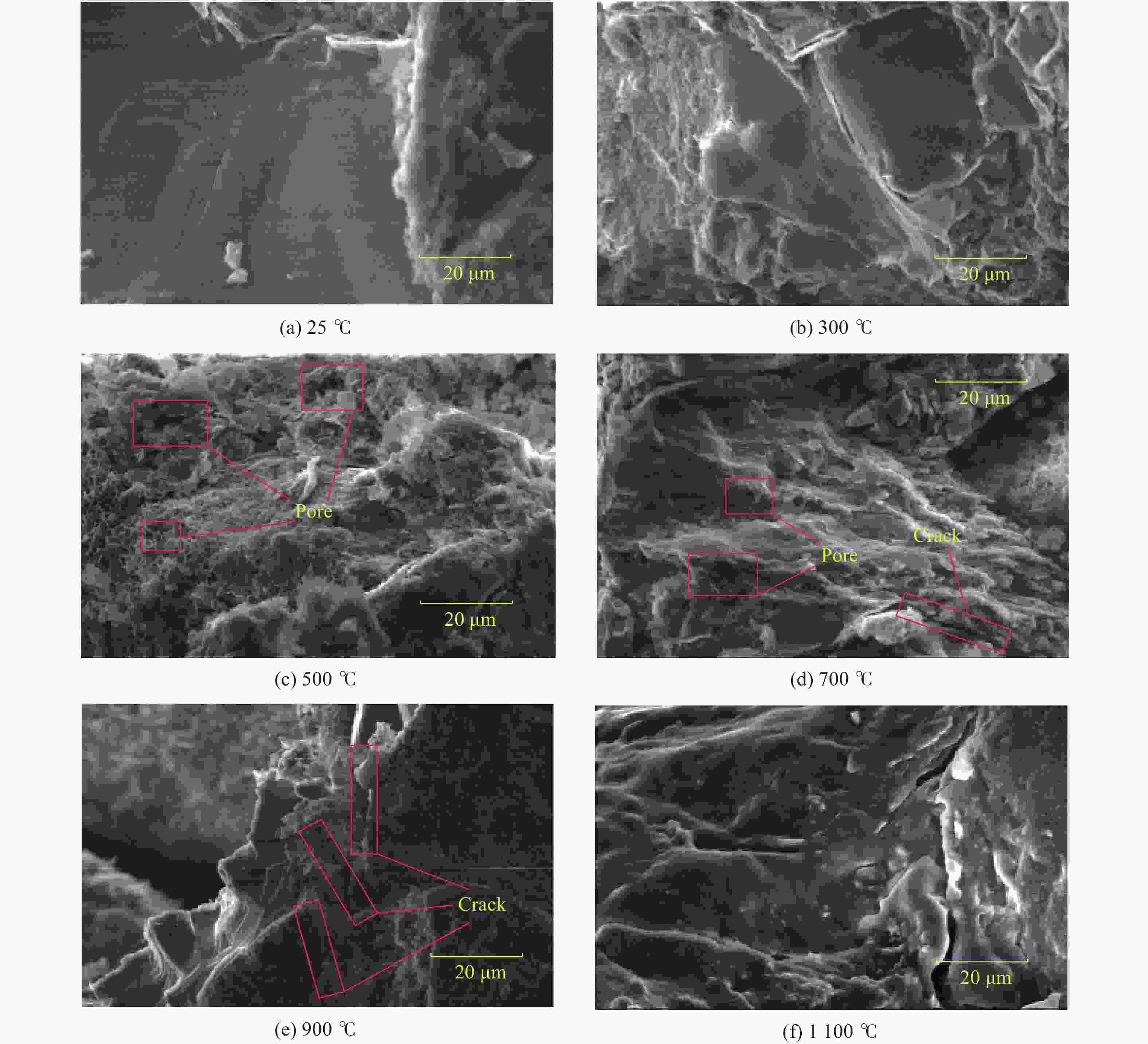 温度/℃ 物质 质量分数/% 25 石英 47.2 钠长石 31.2 钙长石 10.5 钾长石 4.4 高岭石 6.7 500 石英 66.5 钠长石 33.5 700 石英 62.6 钠长石 37.4 900 石英 55.7 钠长石 44.3 1100 石英 62.1 钠长石 37.9 表 2 高温处理后砂岩层理部分的主要矿物成分