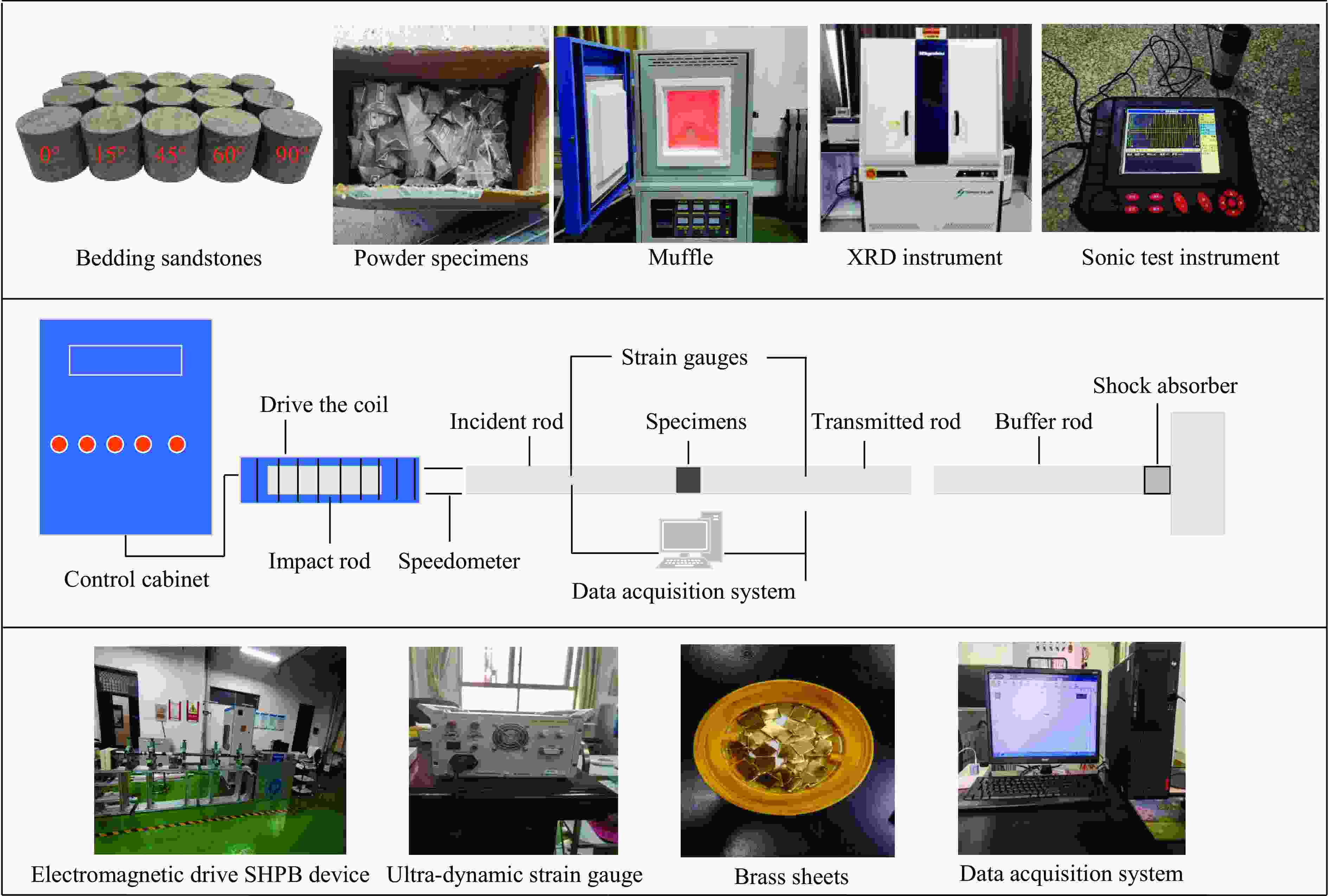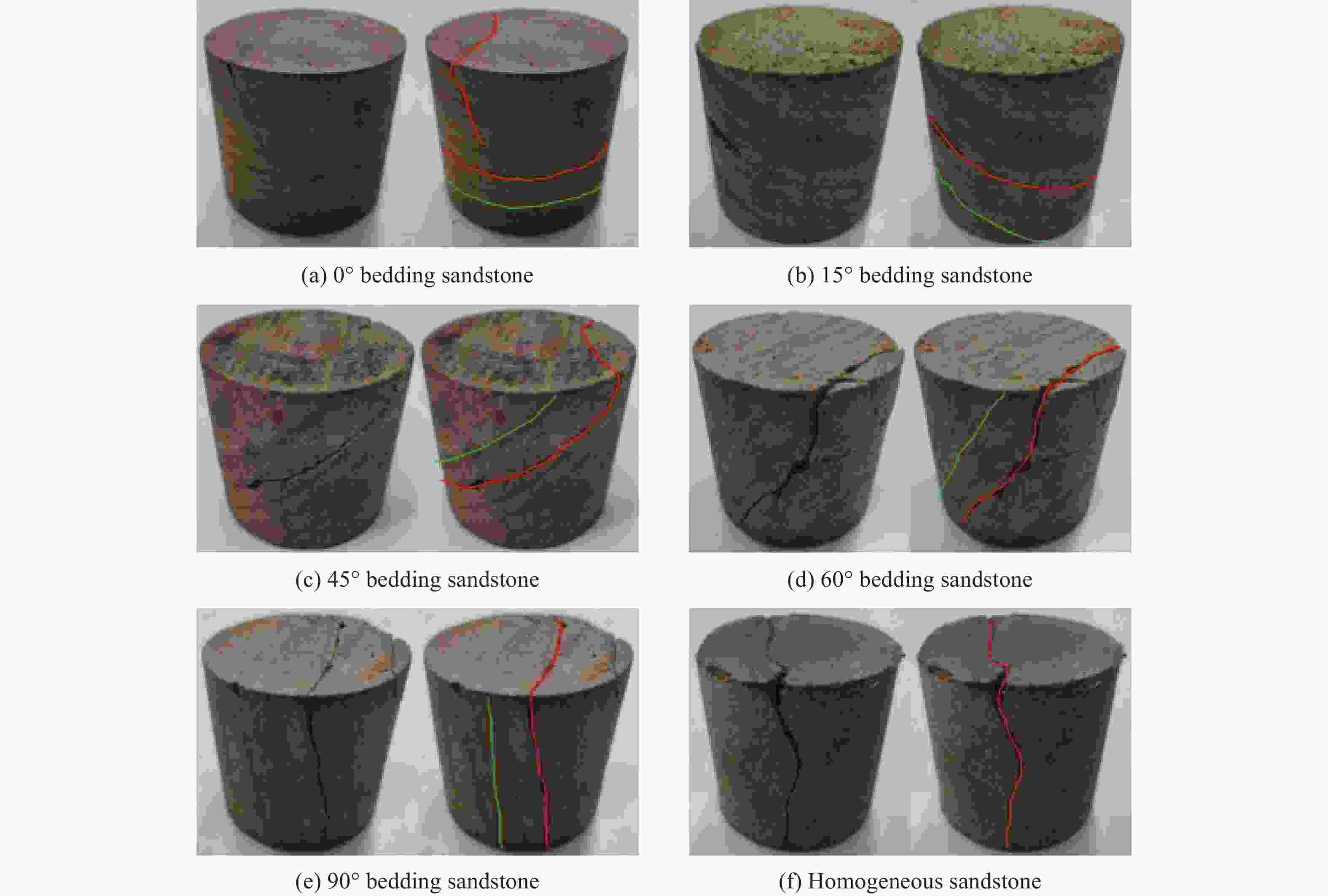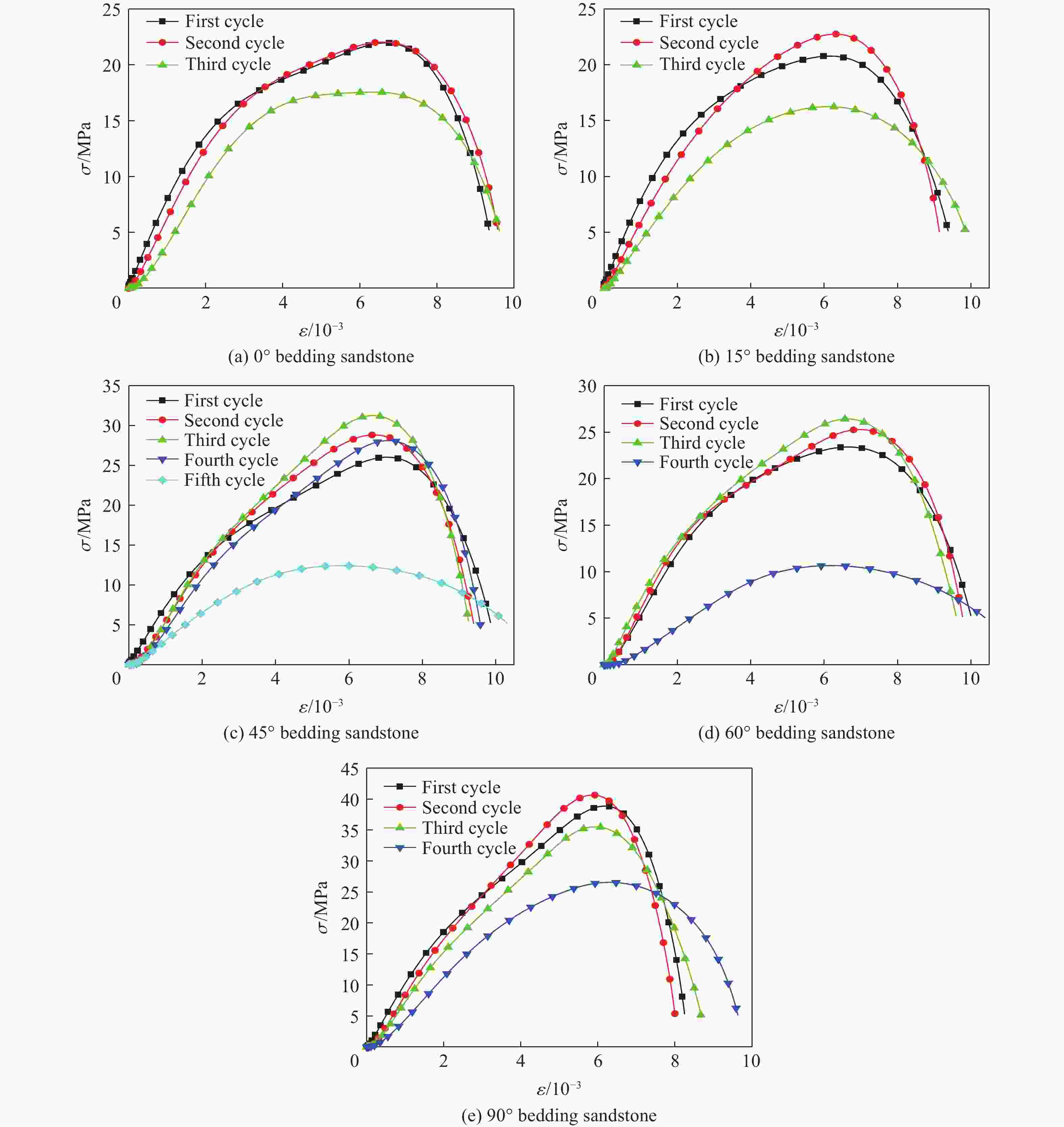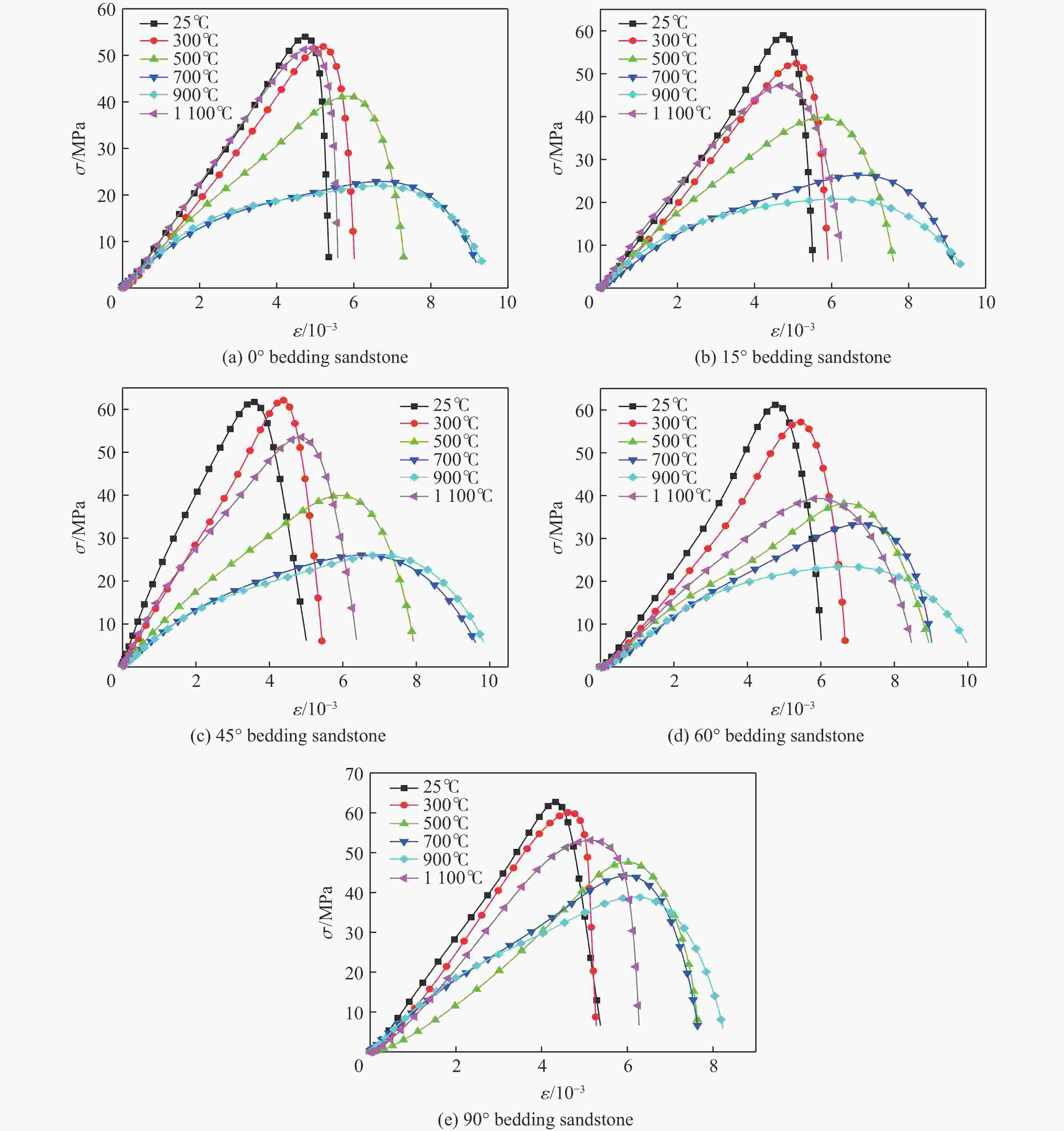 1100 ℃)作用后层理砂岩的物理特性进行测试;其次利用霍普金森压杆(split Hopkinson pressure bar,SHPB)装置开展了循环冲击下高温层理砂岩动力学特性研究;最后,基于层理岩石黏弹性损伤元件模型,构建了考虑高温-冲击荷载耦合损伤的层理岩石动态本构模型,并通过实验数据对模型进行了验证。结果表明:砂岩主要矿物晶体石英的变晶温度处于500~700 ℃之间。温度越高,砂岩表观颜色越深,质量越小,波速和峰值应力先减小后增大。温度对0°、45°层理砂岩造成的损伤更大,900 ℃时损伤最为显著。在1300 V冲击电压下,层理砂岩的峰值应力随冲击次数的增加呈现先升后降的趋势。冲击荷载使高温后的0°层理砂岩更容易破坏,而45°和60°层理砂岩表现出较强的抗冲击能力。模型预测曲线与试验曲线相差较小,表明该模型在描述高温层理砂岩循环冲击力学特性方面具有良好的适用性。Abstract: To investigate the dynamic characteristics and dynamic damage constitutive model of high-temperature bedding sandstone under cyclic impact, the physical properties of bedding sandstone after exposure to 300−1100 ℃ were first examined, and the influence of temperature on the color, mineral composition, mass and wave velocity of the specimens was recorded. Second, the dynamic characteristics of high-temperature bedding sandstone under cyclic impact were studied with a split Hopkinson pressure bar (SHPB) apparatus, and the dynamic responses of bedding sandstone at different strain rates and impact numbers were analyzed. Finally, on the basis of the visco-elastic damage element model for bedding rock, a dynamic constitutive model that accounts for high-temperature-impact-load coupling damage was established and verified against experimental data. The results show that the crystallization temperature of the dominant mineral quartz lies between 500 ℃ and 700 ℃; the higher the temperature, the darker the apparent color of the rock and the lower its mass. With increasing temperature, the wave velocity and peak stress first decrease and then increase. Temperature inflicts greater damage on 0° and 45° bedding sandstone, and the damage is most pronounced at 900 ℃. Under an impact voltage of1300 V, the peak stress of bedding sandstone increases and then decreases with increasing impact number. Impact loading renders 0° bedding sandstone more susceptible to failure after high-temperature exposure, whereas 45° and 60° bedding sandstone exhibit strong impact resistance. The difference between the predicted and experimental curves is small, indicating that the model satisfactorily describes the cyclic-impact mechanical behavior of high-temperature bedding sandstone. The findings provide a valuable theoretical reference for the prevention and control of rock dynamic disasters in complex deep geothermal engineering environments.-