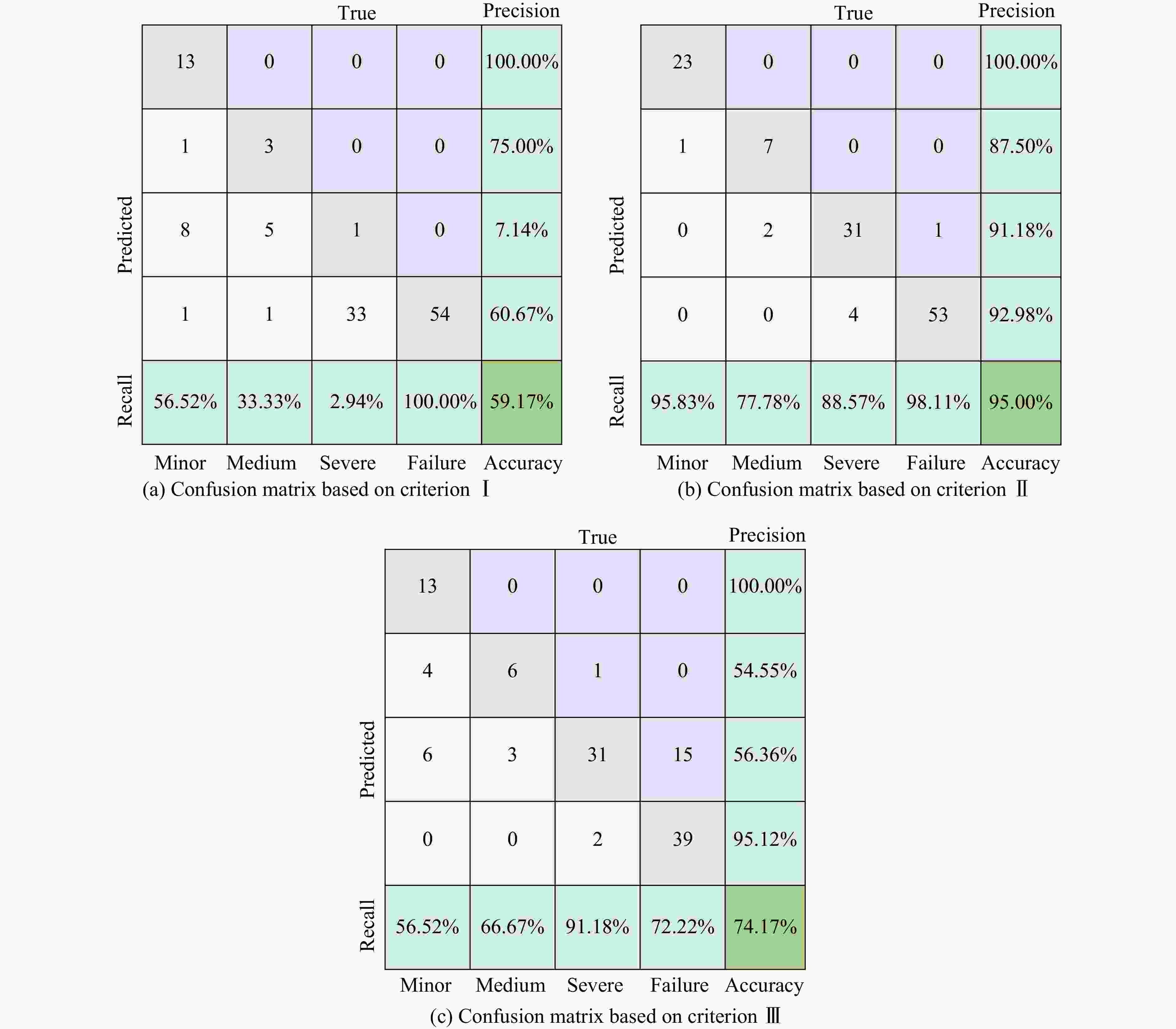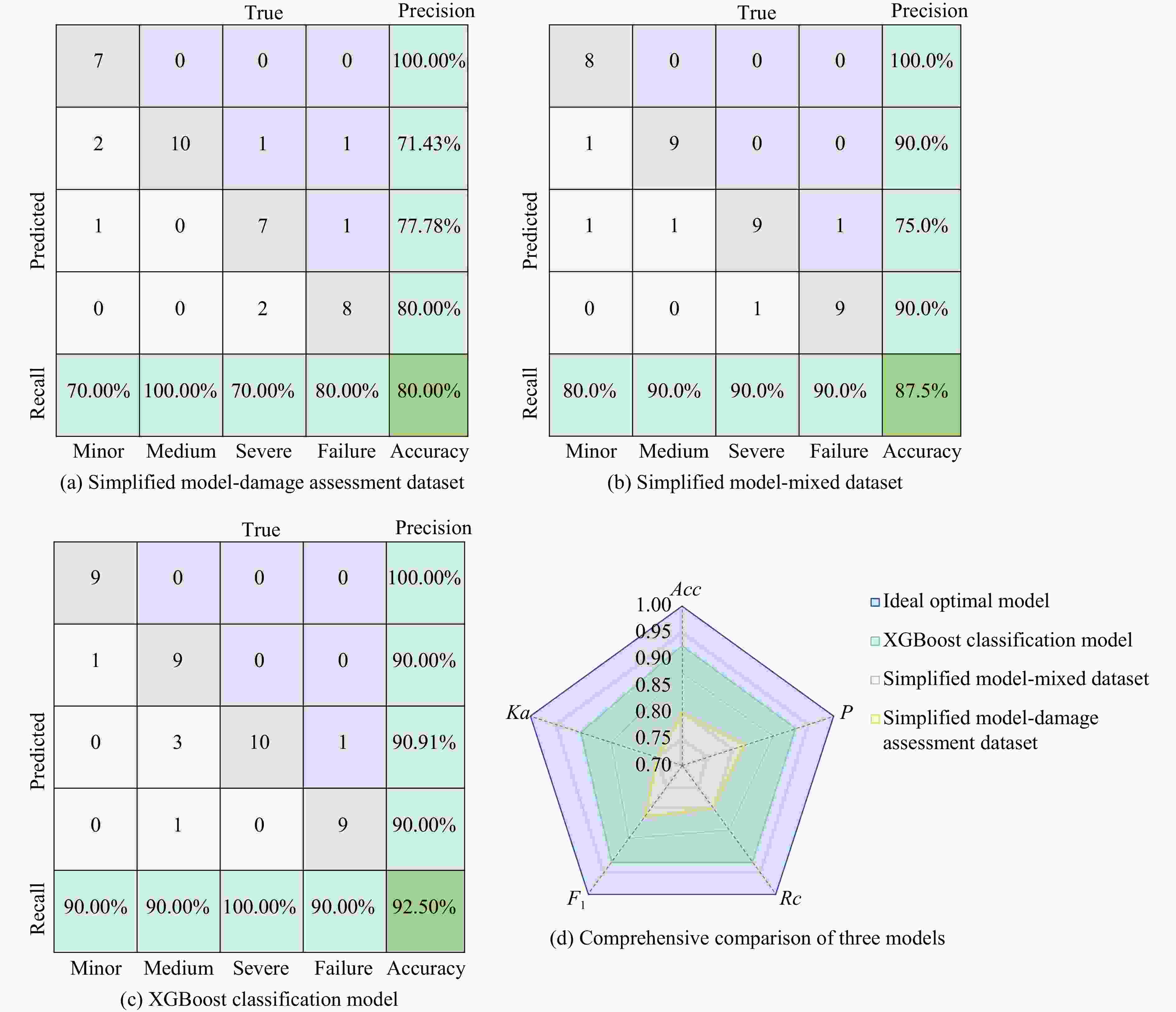 准则 Acc/% P/% Rc/% F1 Ka Ⅰ 59.17 60.70 48.20 0.54 0.331 Ⅱ 95.00 92.92 90.10 0.92 0.925 Ⅲ 74.17 76.51 71.65 0.74 0.625 表 8 基于损伤评估数据集的简化模型分类指标