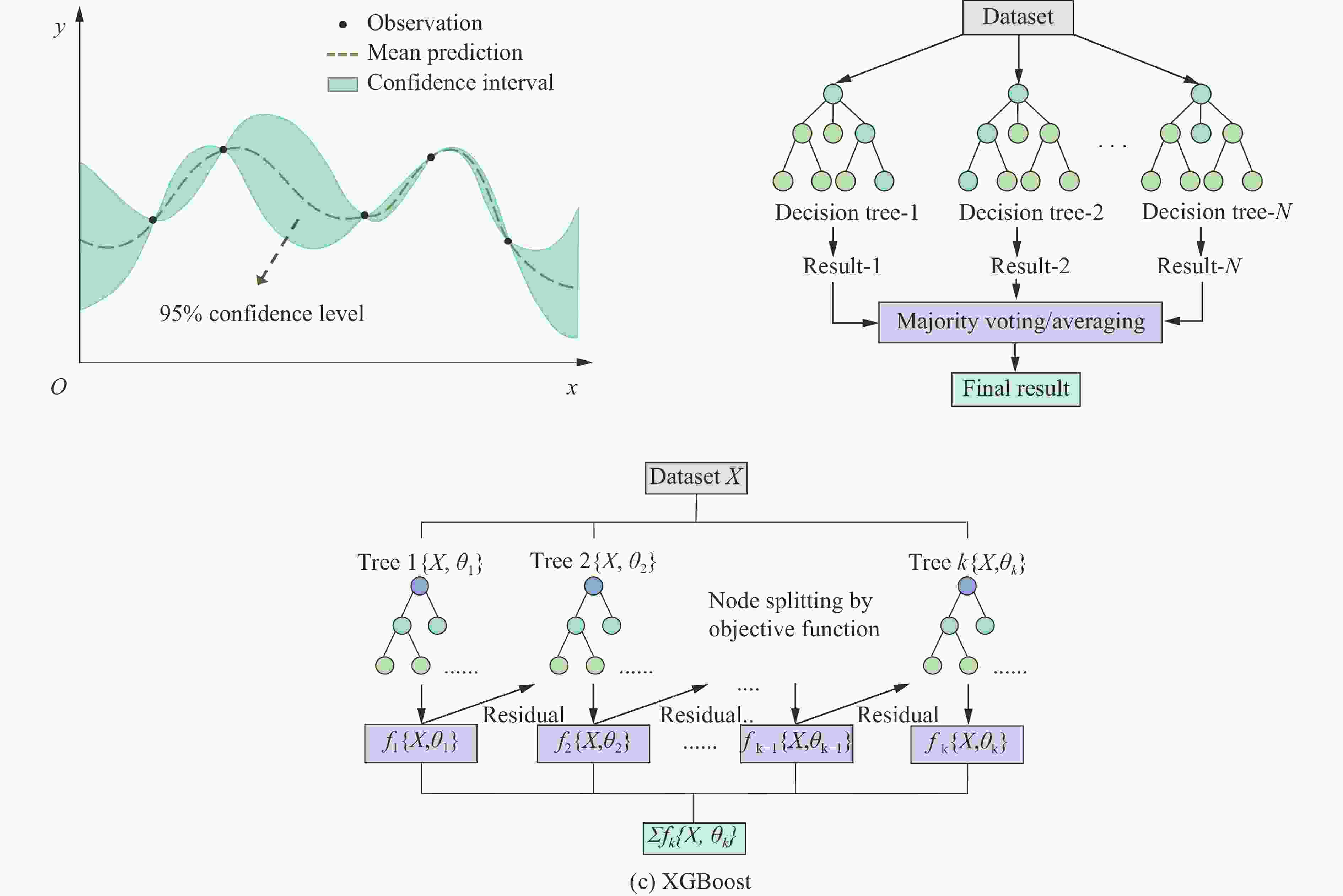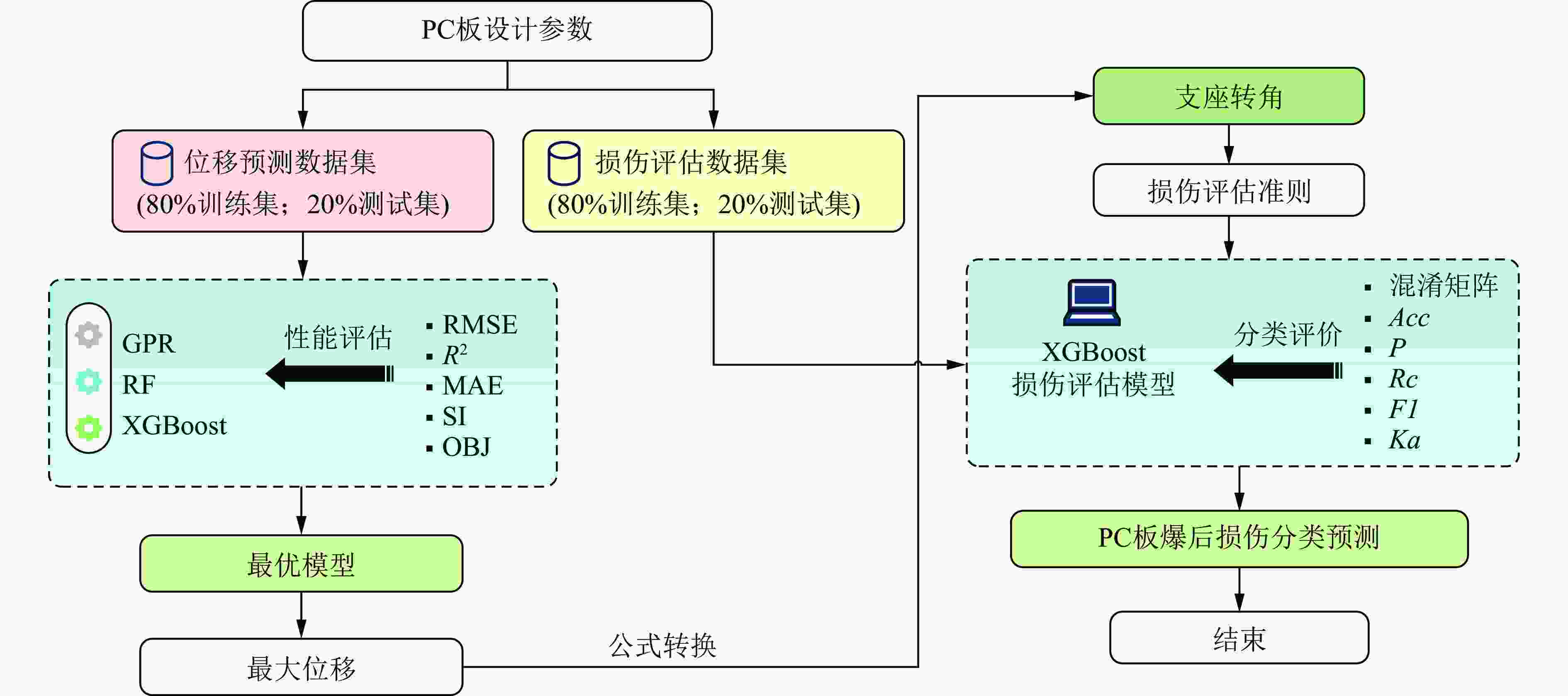 摘要: 装配式建筑结构因其节能环保、质量可控及施工高效快捷等优点,在土木工程中得到了广泛应用。作为装配式建筑结构的核心受力构件,预制钢筋混凝土(precast reinforced concrete,PC)板易受燃气爆炸、工业爆炸和恐怖袭击等威胁。为了准确评估PC板在爆炸作用下的损伤状态,提升结构抗爆能力,并降低人员伤亡风险,通过构建PC板爆炸响应数据集,选取6项几何结构参数和2项爆炸荷载参数作为输入特征,采用3种不同的机器学习算法(GPR、RF和XGBoost)对PC板的最大位移进行预测,采用均方根误差、决定系数、平均绝对误差、散射系数及综合性能目标函数值5项回归评价指标,对3种模型的预测精度进行对比分析;提出了基于支座转角损伤准则的损伤分类评估模型,利用混淆矩阵和5项分类指标(准确率、精确率、召回率、F1分数和Kappa系数)分析3种准则下模型的性能差异,并与简化后的模型及经验预测方法进行对比。结果表明:在最大位移预测方面,3种机器学习模型中表现最佳的为XGBoost模型,其拟合性优于GPR和RF模型且综合性能最优;在损伤分类预测方面,基于准则Ⅱ的XGBoost损伤分类模型性能最优,损伤识别准确率达92.5%,显示出其高效的损伤类型识别能力。基于XGBoost算法的爆炸作用下PC板损伤分类评估模型具有强大的性能,对结构抗爆和爆后快速损伤评定具有参考价值。Abstract: Prefabricated building structures have been widely applied in civil engineering due to their advantages of energy conservation, environmental protection, controllable quality, and efficient construction. As the core load-bearing components of prefabricated building structures, precast reinforced concrete (PC) slabs are vulnerable to threats from gas explosions, industrial explosions, and terrorist attacks. To accurately assess the damage state of PC slabs under explosion, enhance structural blast resistance, and reduce casualties, an explosion response dataset of PC slabs was constructed. Six geometric parameters (slab thickness/length/width, steel reinforcement ratio, compressive strength of concrete, etc.) and two explosion load parameters (explosive weight and explosive distance) were selected as input features. Three machine learning algorithms (GPR, RF, and XGBoost) were used to predict the maximum displacement of PC slabs, and their prediction accuracies are compared by root mean square error, coefficient of determination, mean absolute error, scattering index, and comprehensive performance objective function. Furthermore, a damage classification evaluation model based on the support rotation angle damage criterion is proposed. The performance differences of the model under three criteria are analyzed by confusion matrix and five classification indices (accuracy, precision, recall, F1-score, and Kappa coefficient), and compared with simplified models and empirical prediction methods. The research results indicate that in terms of maximum displacement prediction for PC slabs under explosion loads, the XGBoost model demonstrates the best performance among the three machine learning models (GPR、RF and XGBoost). Specifically, the fitting degree of XGBoost is superior to those of GPR and RF models. Meanwhile, and the XGBoost shows the most outstanding comprehensive performance, with a damage recognition accuracy of 92.5%, which demonstrates its high-efficiency in identifying different damage types. The XGBoost-based damage classification evaluation model for PC slabs under explosion loads exhibits powerful performance, providing important references for structural blast resistance design and rapid post-blast damage assessment.