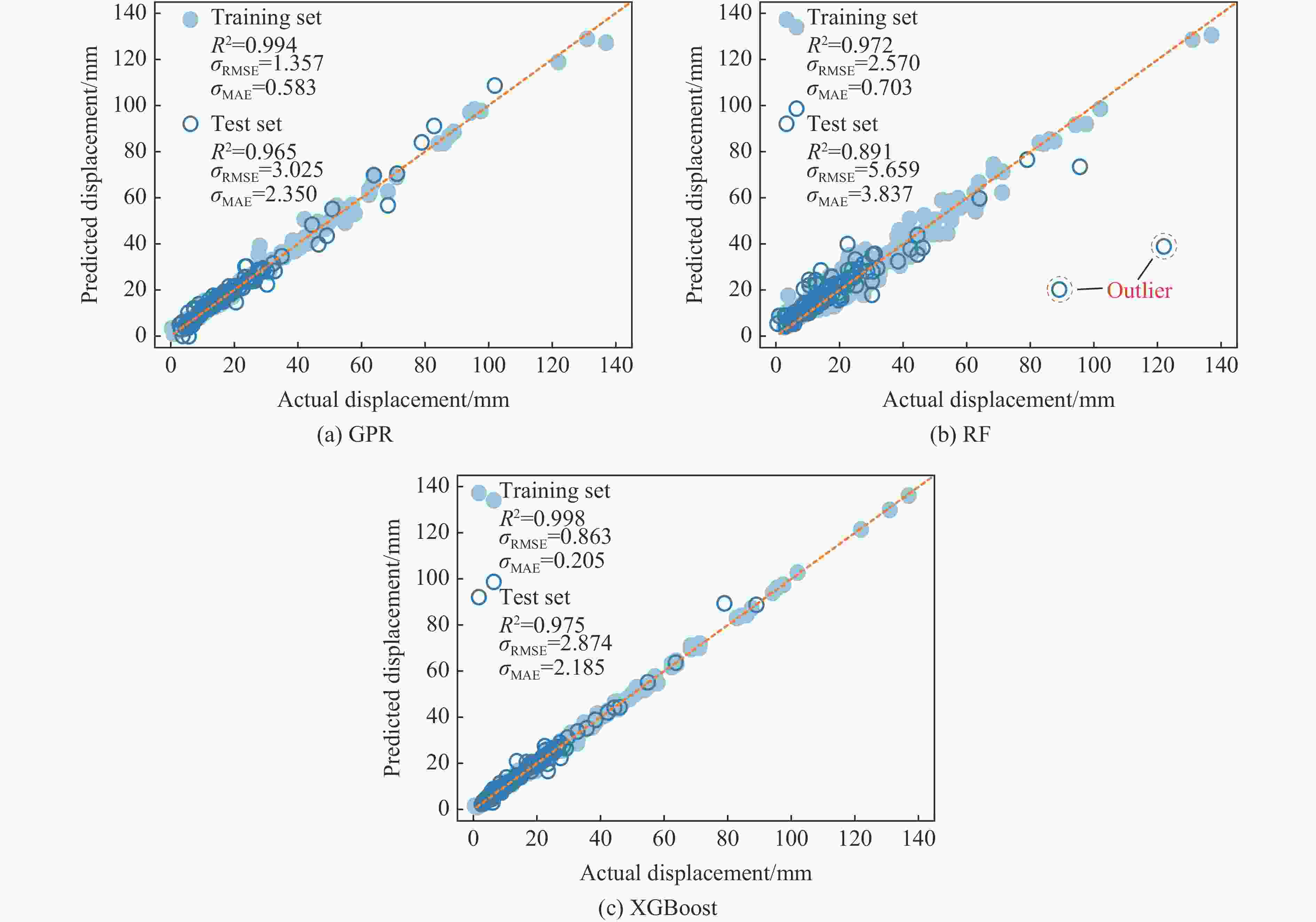 模型 数据集形式 R2 σRMSE/mm σMAE/mm ξ fOBJ GPR 训练集 0.994 1.357 0.583 0.064 1.325 测试集 0.965 3.025 2.350 0.143 RF 训练集 0.972 2.570 0.703 0.121 2.330 测试集 0.891 5.659 3.837 0.268 XGBoost 训练集 0.998 0.863 0.205 0.041 0.939 测试集 0.975 2.874 2.185 0.136 表 5 基于支座转角的损伤评估划分